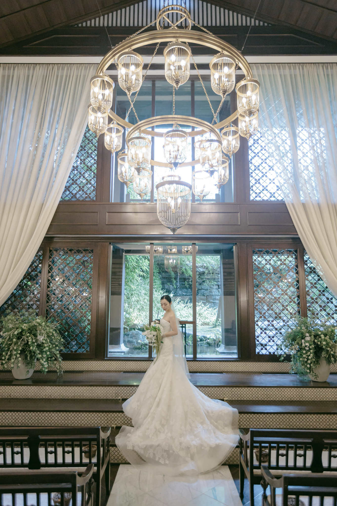 ドレスアップしたお二人が向かわれたのは、優しくお二人を包み込むような自然光が降り注ぐ開放感のあるチャペル、THE HIGASHIYAMA(ザ ヒガシヤマ)。