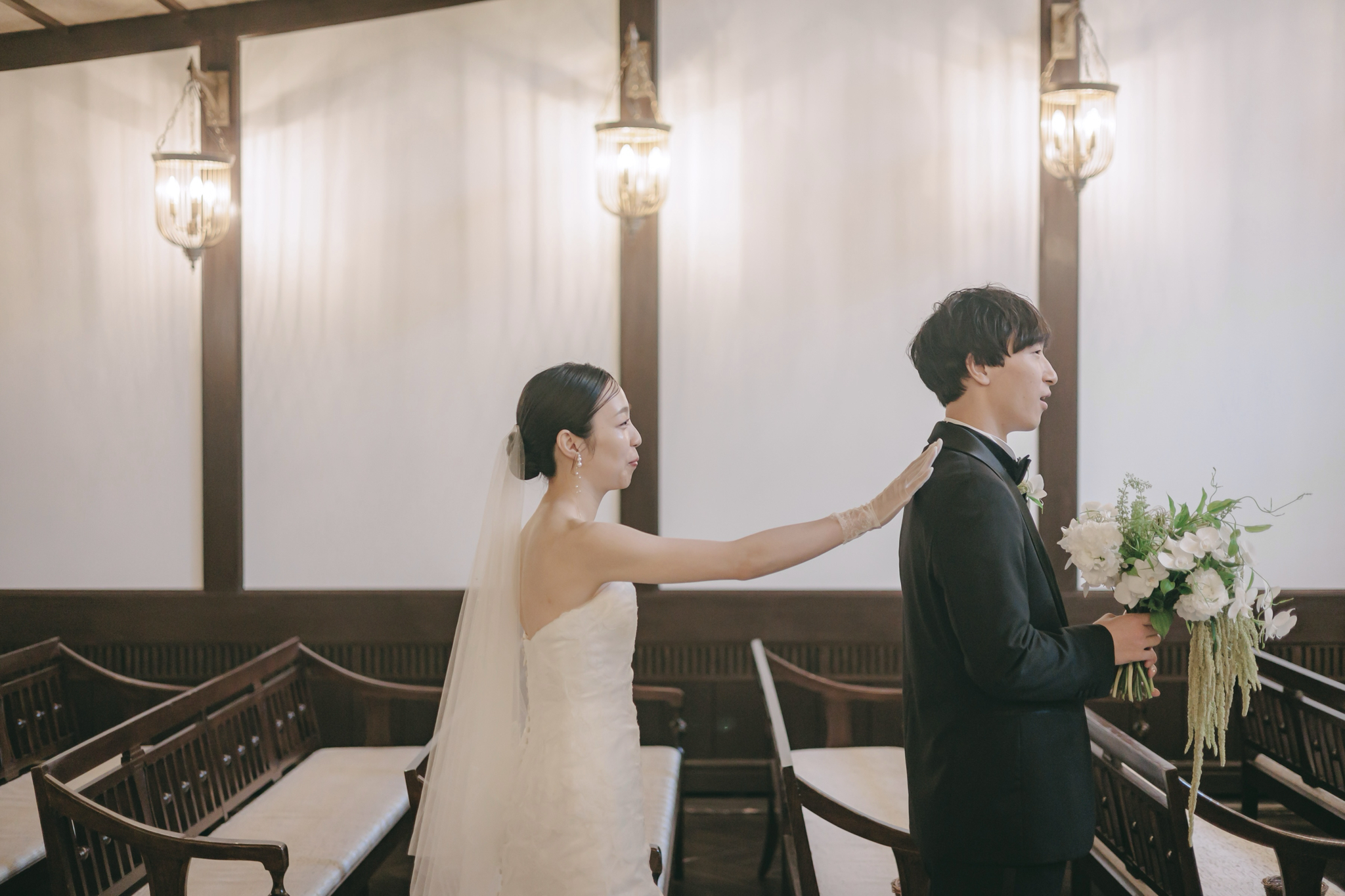 緊張と高揚する気持ちで溢れる中、心を込めて選ばれた大切なウェディングドレスを身に纏い、ご新郎様の元へ向かいます。愛するご新婦様のウェディングドレス姿を初めて目の当たりにし思わず笑みがこぼれる新郎様と、少し照れくさい表情のご新婦様。