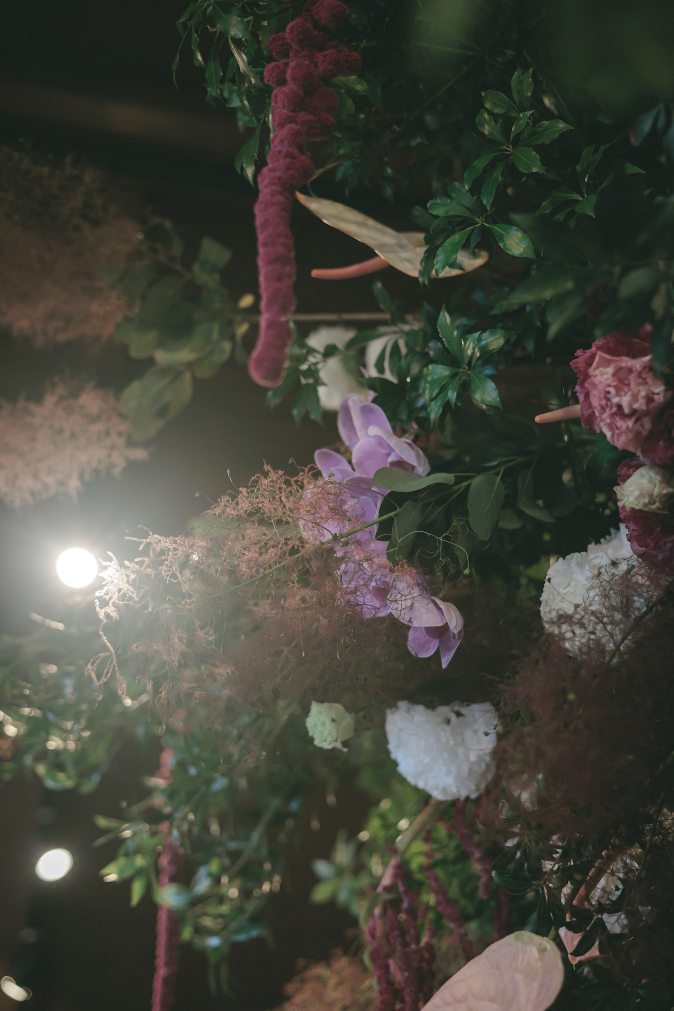 深い木目がシックで温かみのある空間に、緑とボルドーの色彩が美しい装花がお二人とゲストを迎え入れます。