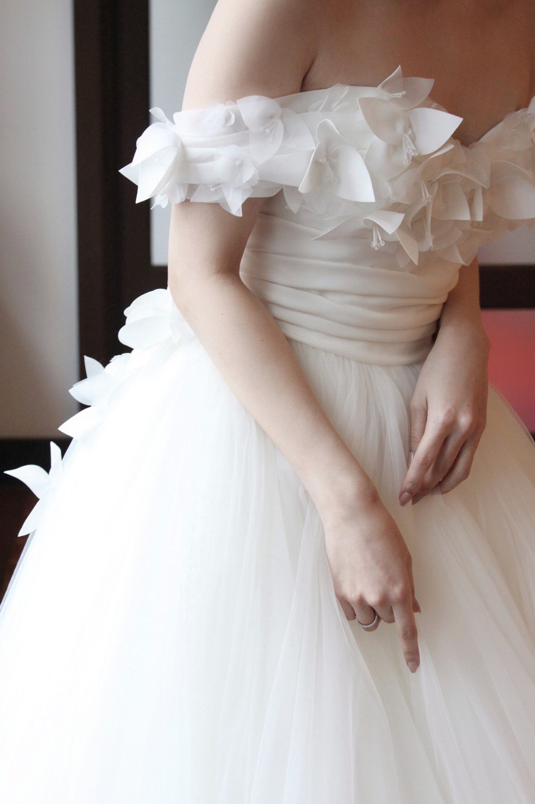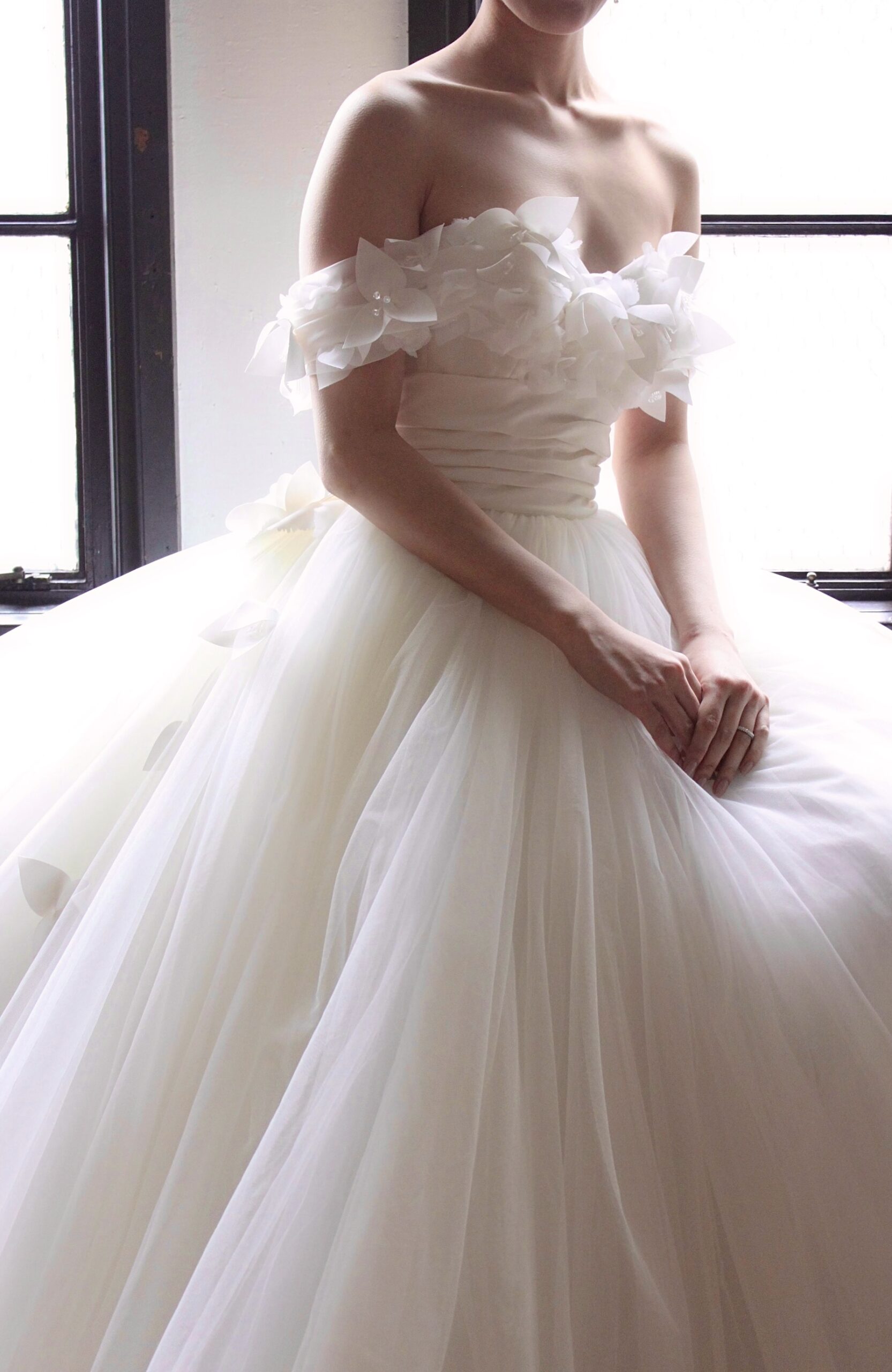 透明感のあるソフトチュールを何層にも重ねたプリンセスライン。動くたびにふんわりと柔らかく揺れるチュールは、花嫁の可憐さを引き立たたせつつ優雅な余韻を残します。