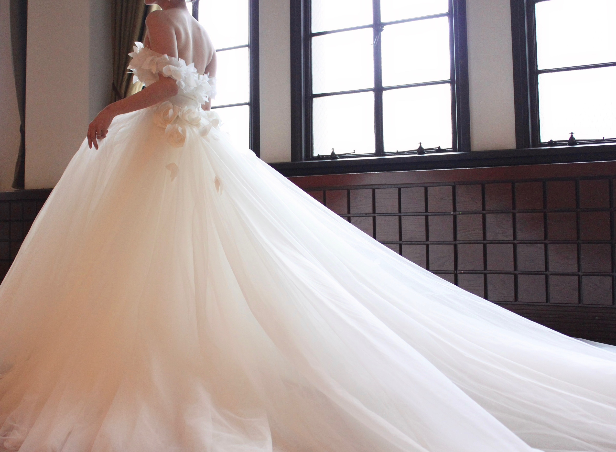 後ろを振り返るとドラマティックなロングトレーンが贅沢に広がり、より一層花嫁やゲストの皆様を結婚式という特別な幸福感で満たすことでしょう。