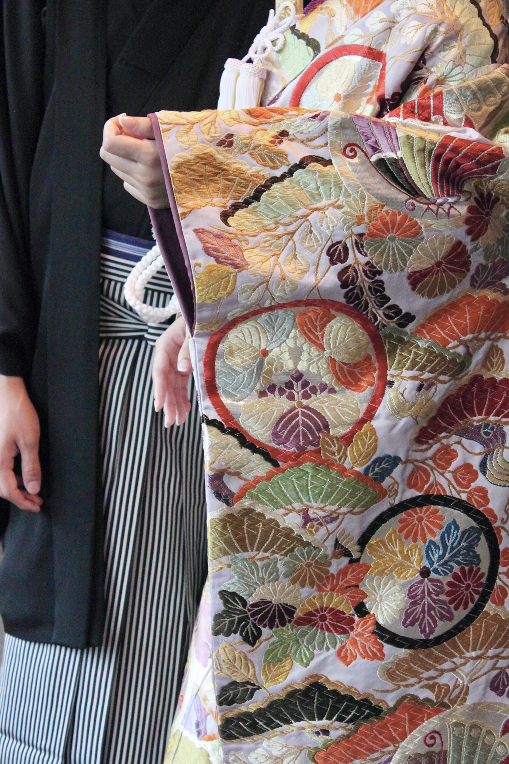 吉祥文様の松を始め、長寿や子孫繁栄を意味する藤、夫婦円満の願いが込められた円や蝶文様などがあしらわれています。