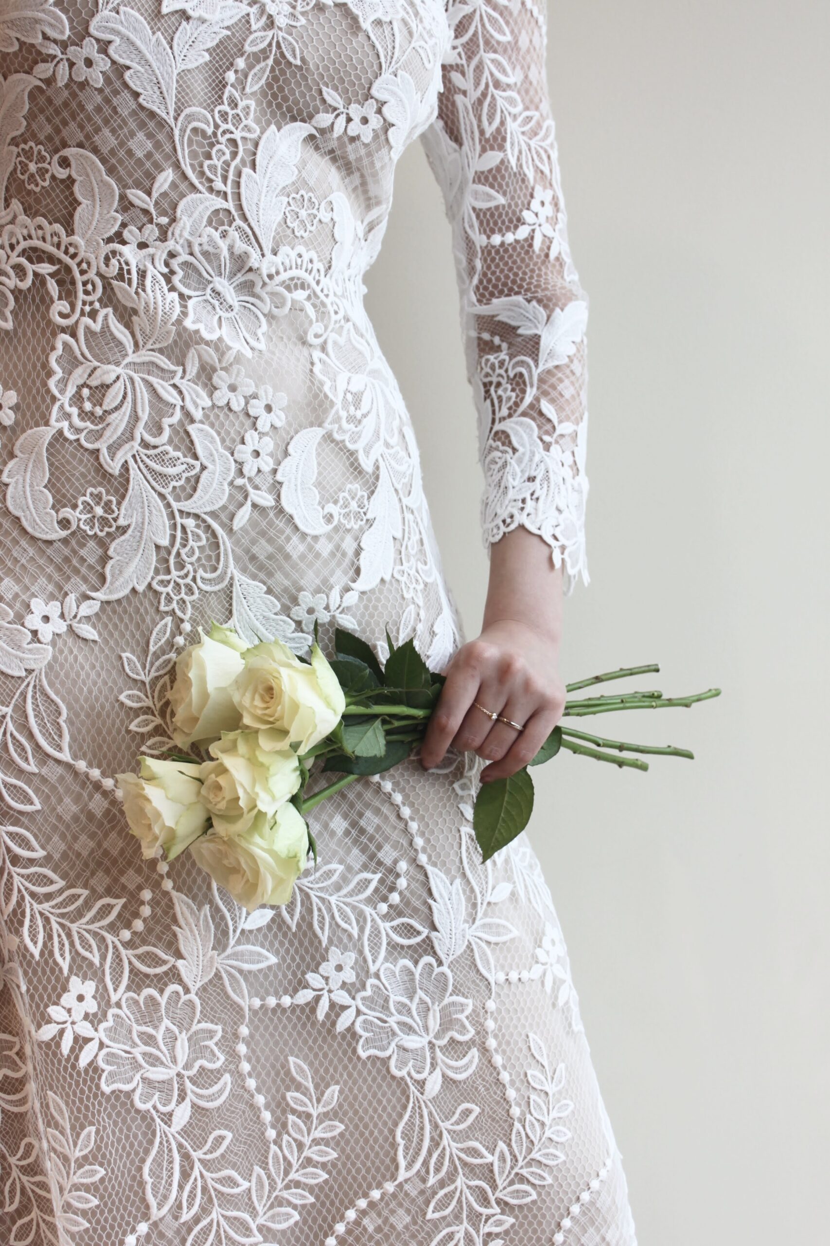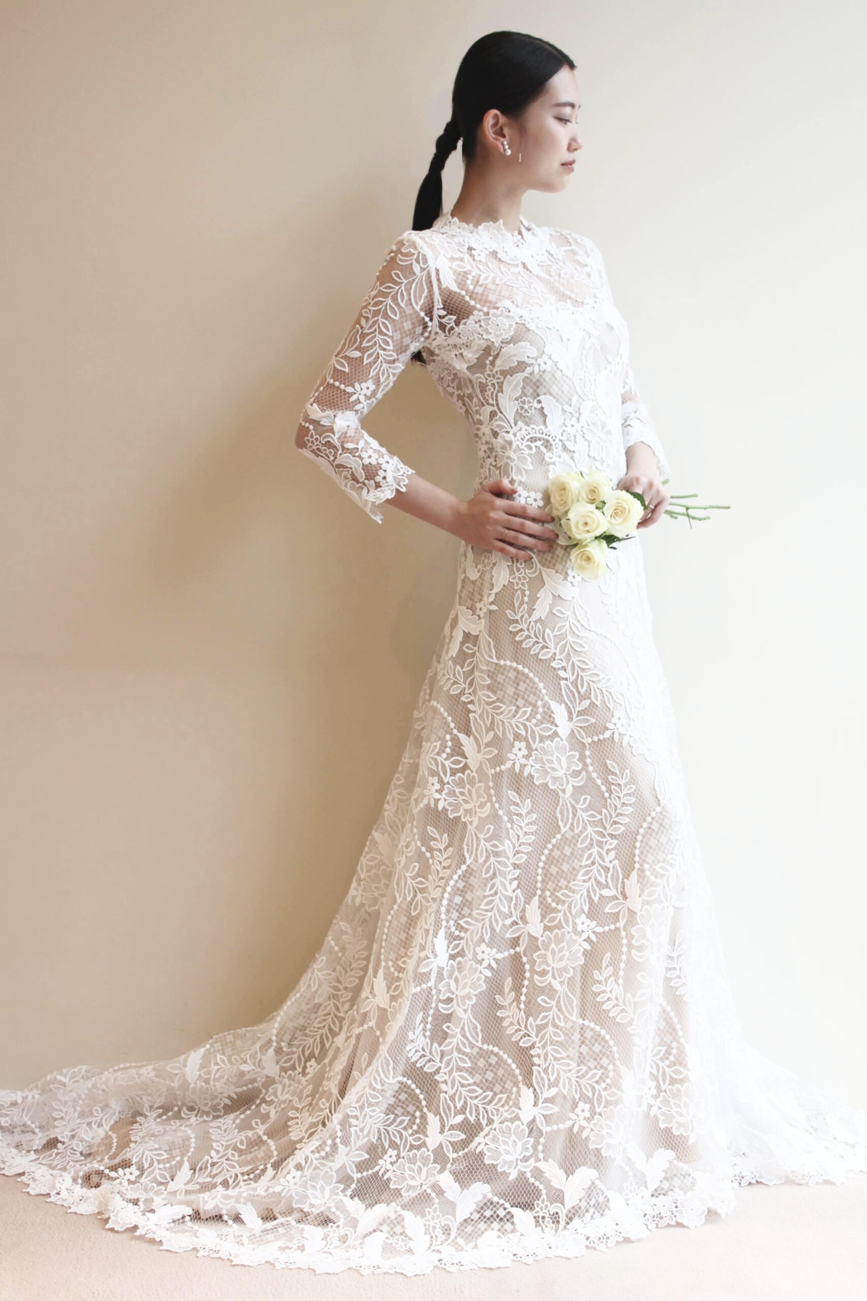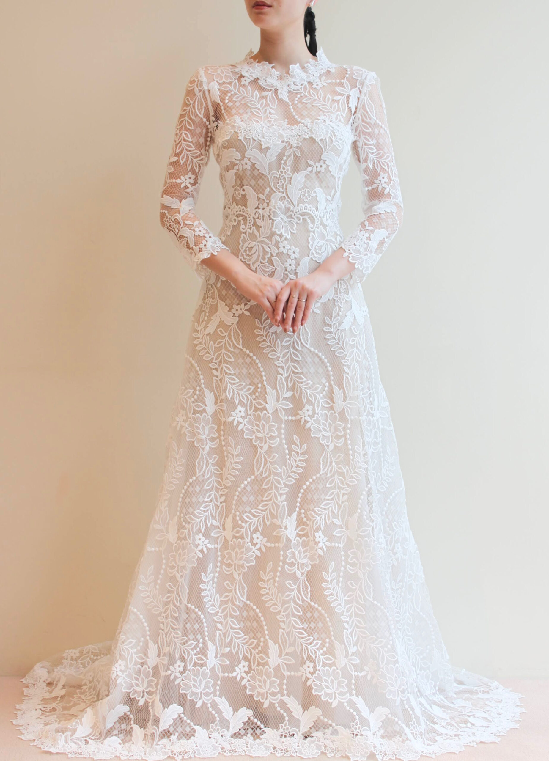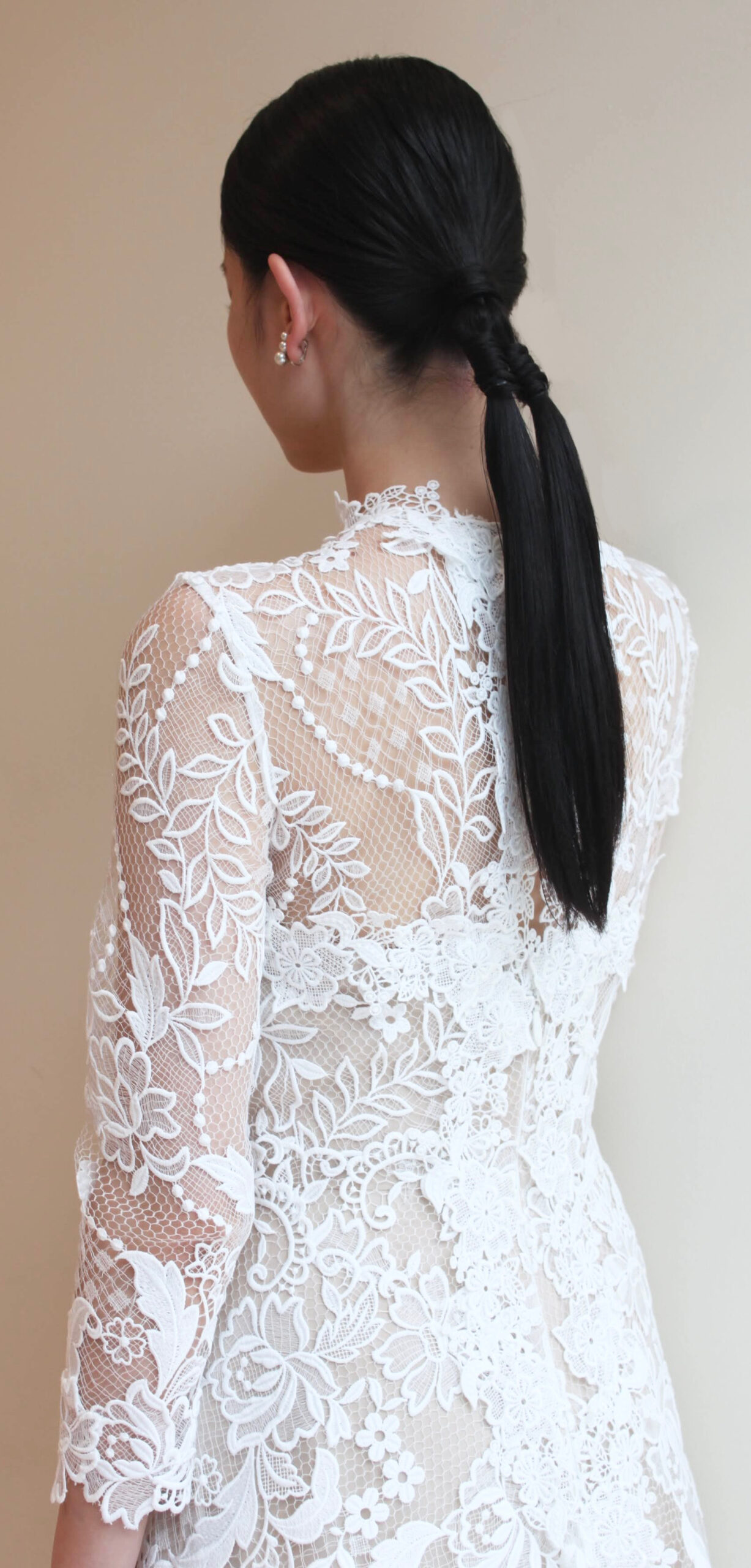 先程ご紹介したドレスと同じレースモチーフでもこちらは一変、鍵編みレースと立体的なレースが絶妙に融合したナイーム カーンらしい1着です。首元、袖元、スカートの裾まで贅沢に施されたレースは、彼自身が幼少期に感じたインドの文化、建築、歴史、そして祖父の伝統芸術が合わさったようにも見え、どこかボヘミアンなドレスにも感じられますね。ハイネックでロングスリーブのデザインになるため一見クラシックさも感じるウェディングドレスですが内側の生地がヌーディカラーになっているため、クラシック過ぎず程よく肩の力を抜いた雰囲気で纏えます。イヤリングは三連パールの小ぶりなイヤリングを合わせ凛とした佇まいに。ヘアスタイルは、ひと手間を加えたスタイリッシュなローポニー。ヘアでトレンドを加えるだけでも、ドレスの見え方や雰囲気はガラッと変わります。リップはヌーディなピンクを合わせ強すぎない印象に。ブーケはバラを数本合わせることにより、スタイリッシュでシックなコーディネートに。バイオリンや讃美歌の曲が流れ始め、バージンロードの扉が開いた瞬間、花嫁の凛とした佇まいに会場は一気に感動の渦に包まれることでしょう。