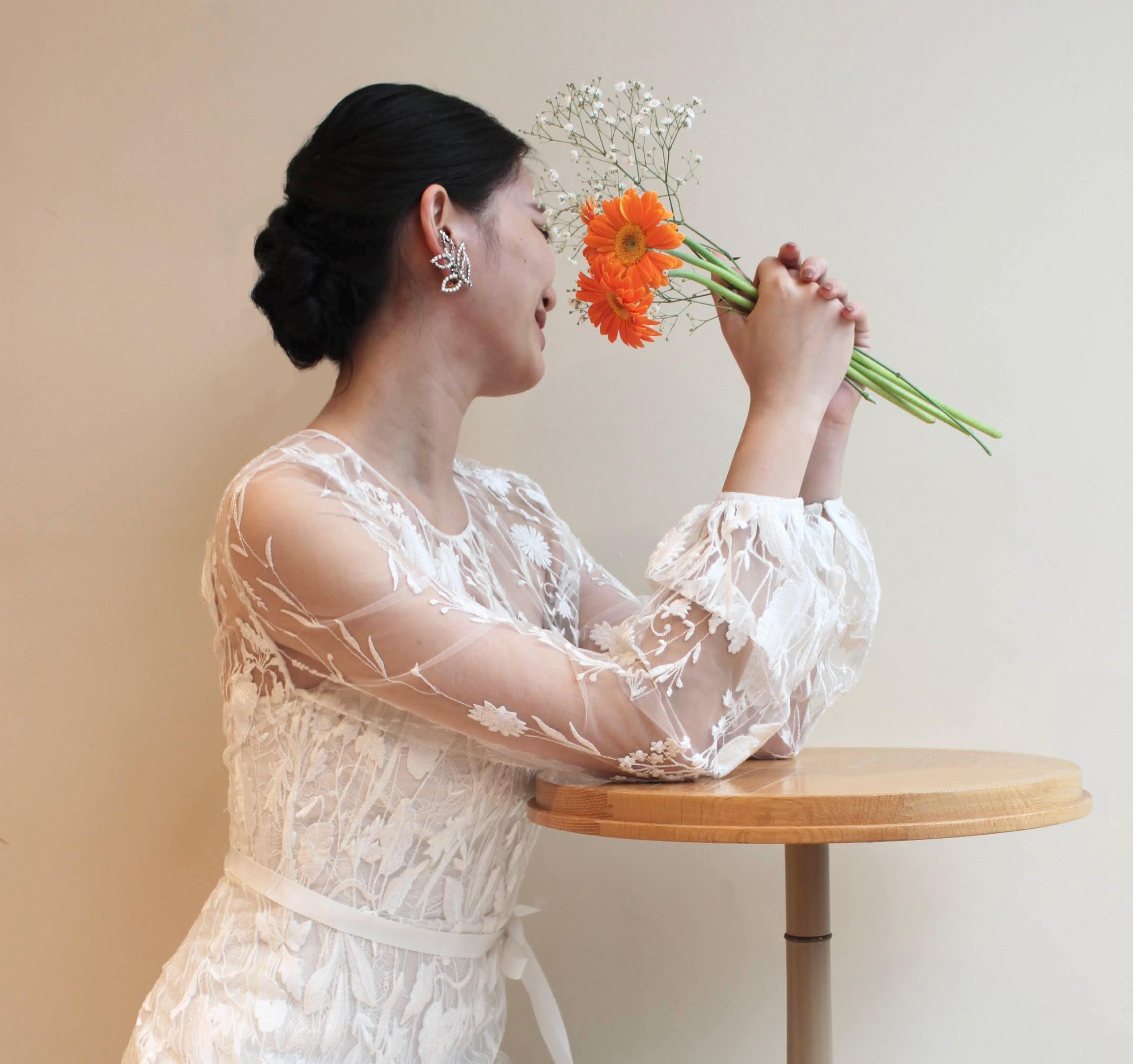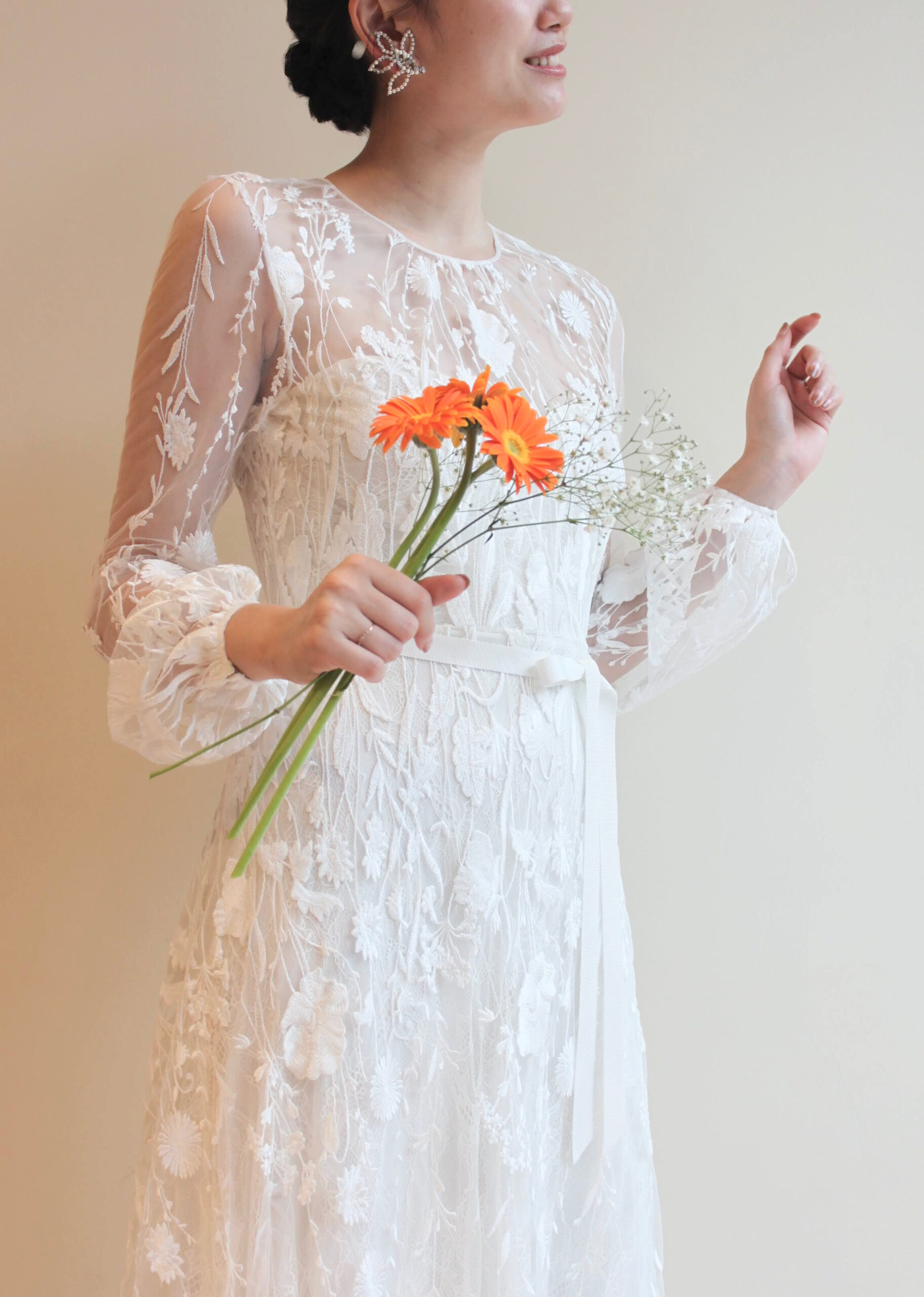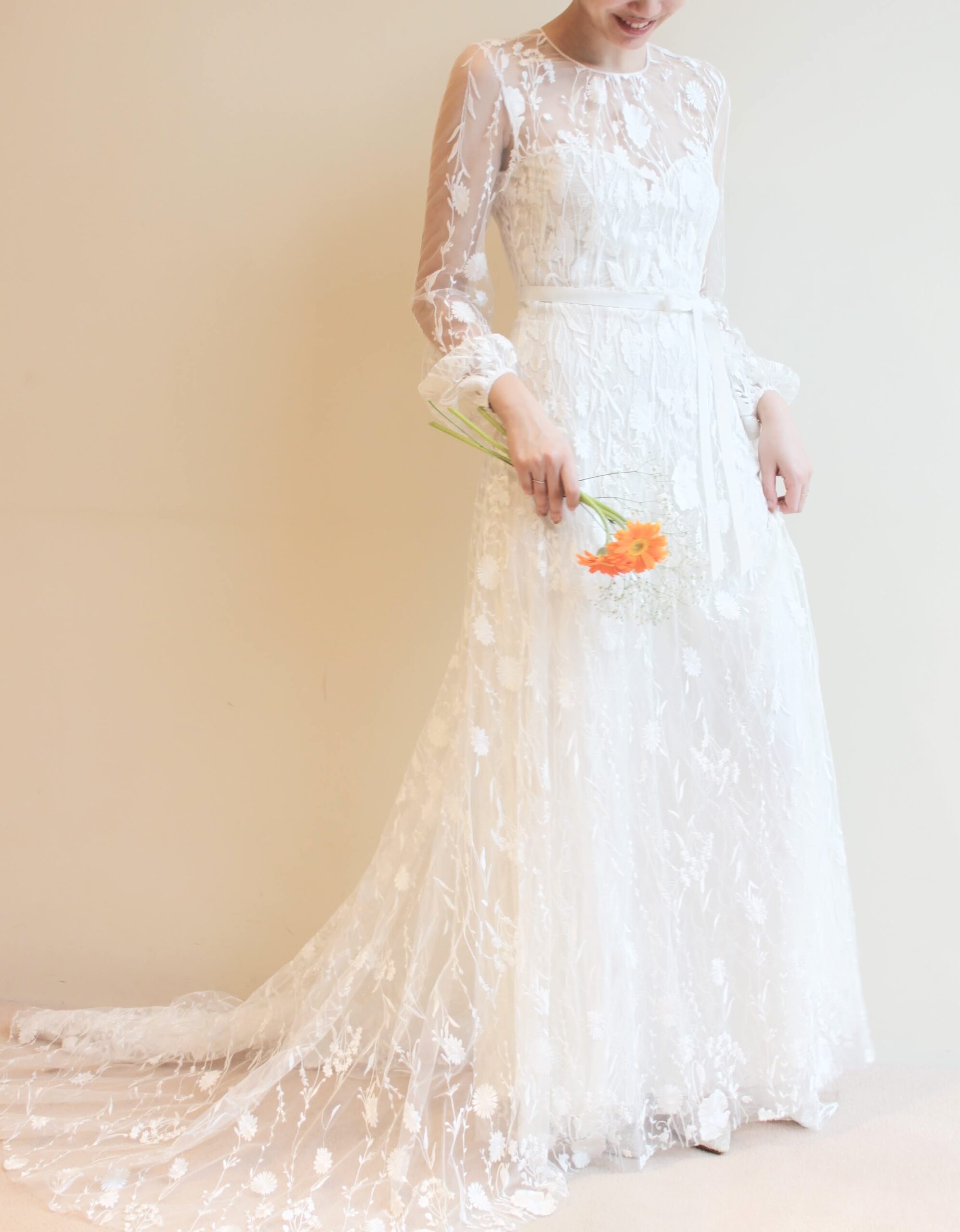 まるで生地の上にデッサンをしたかのような可憐で緻密なレースにうっとりするこちらのウェディングドレス。エンブロイダリーレースという刺繍で作られ、レースの中でも最も有名なレースと言われています。透け感のある生地の上にレース模様を作り、専用のエンブロイダリーレース機を使用し、職人の手によって丁寧に仕立てられています。このドレスを見ているとナイーム カーンや職人たちのドレスに対する信念やバックボーンが浮かび上り、何かを語りかけているようで、心がぎゅっと掴まれますね。繊細なリーフ刺繍と大ぶりなフラワーモチーフの可憐なコラボレーションが魅力的な1着です。袖元はモダンさを感じさせるパフスリーブ。指輪の交換やファーストバイト、そしてブーケを持っている時、花嫁の手に視線が注がれます。さりげなく施されたパフスリーブはお手元を優雅に、そしておしゃれな印象へと昇華。スカートの中生地は繊細なレースであえて短くカットされているため、後ろのトレーンと合わさった時は、芸術的な美しさに思わず心奪われます。バージンロードを歩くとき、会場の中に注ぎ込む自然光やスポットライトを浴びたお姿は、ベール越しに見えるレースが儚く上品に見えるため、一気に神聖なムードに。その美しさにゲストは思わず、うっとりすることでしょう。また、新緑をバックに撮影したときはレースの陰影がハッキリしているため、写真越しで見ても映えるデザインになっています。そんなドレスに合わせるヘアスタイルは、ふんわりとまとめたシニヨンスタイル。ネックがラウンド型にカットされているため、お顔周りがスッキリ見えます。アクセサリーはお花のモチーフが目を引くイヤリングを合わせ、可憐さをプラス。揺れないイヤリングを合わせることで、上品さも醸し出されます。ブーケはこれからの春シーズンにはピッタリな、ビビットなオレンジフラワーを合わせアクセントを。ビタミンカラーのお花は花嫁をより華やかに魅せてくれるため、幸福感溢れるお姿に。足元のシューズはHAAVE(ハーヴェ)というブランドのレースシューズをチョイス。ウェディングドレスの緻密さと同じ雰囲気のシューズを合わせると、ナチュラルなコーディネートに。