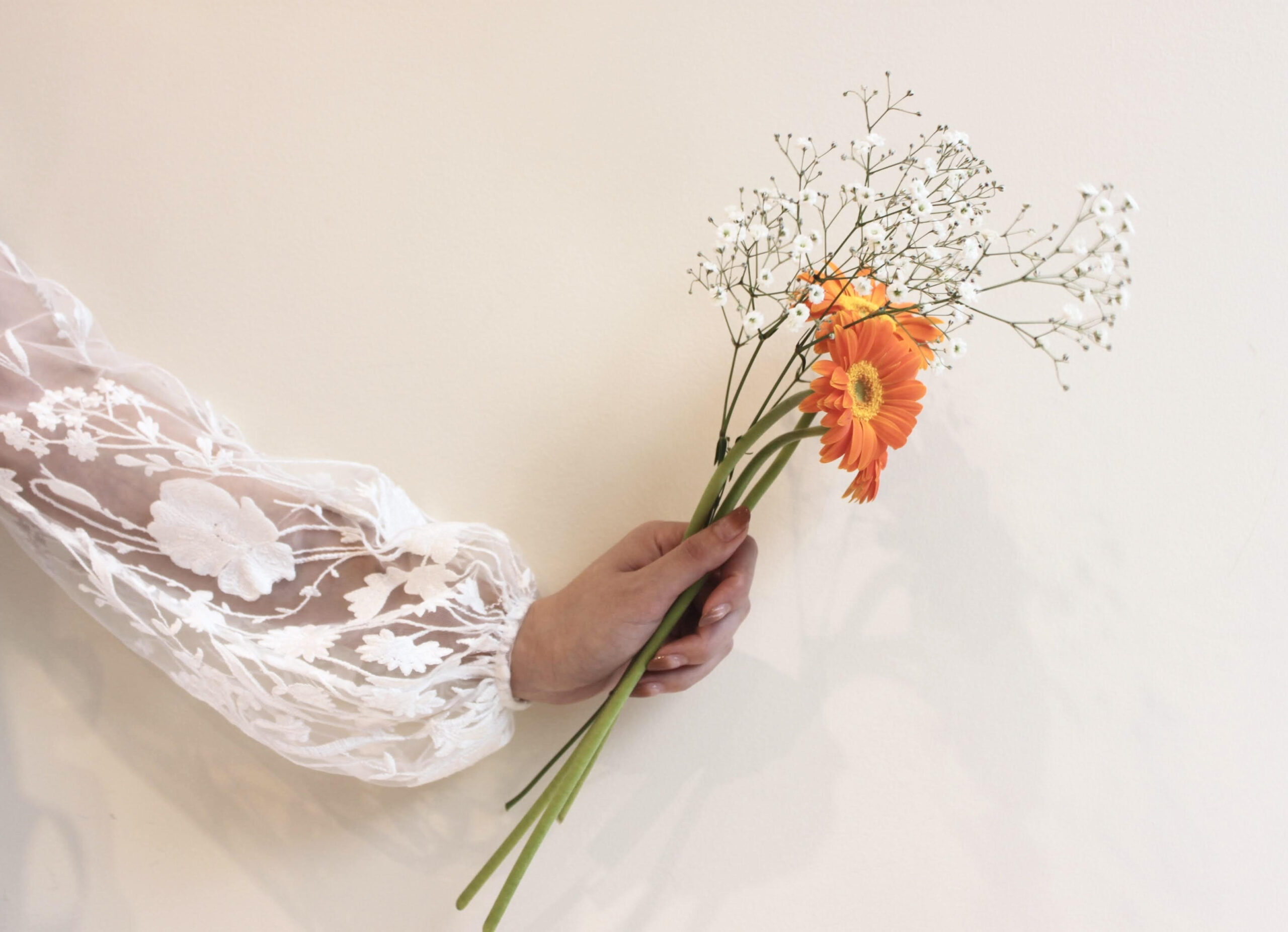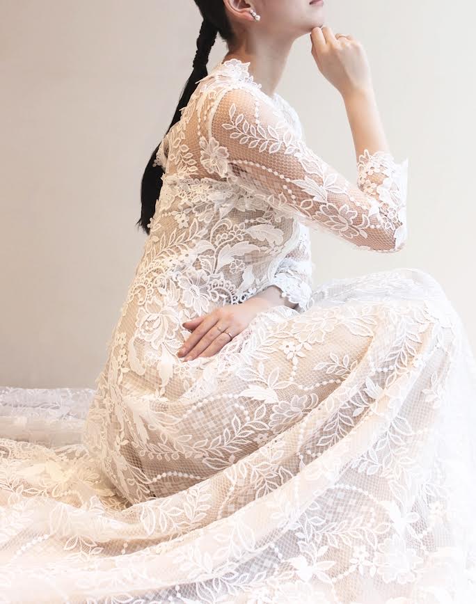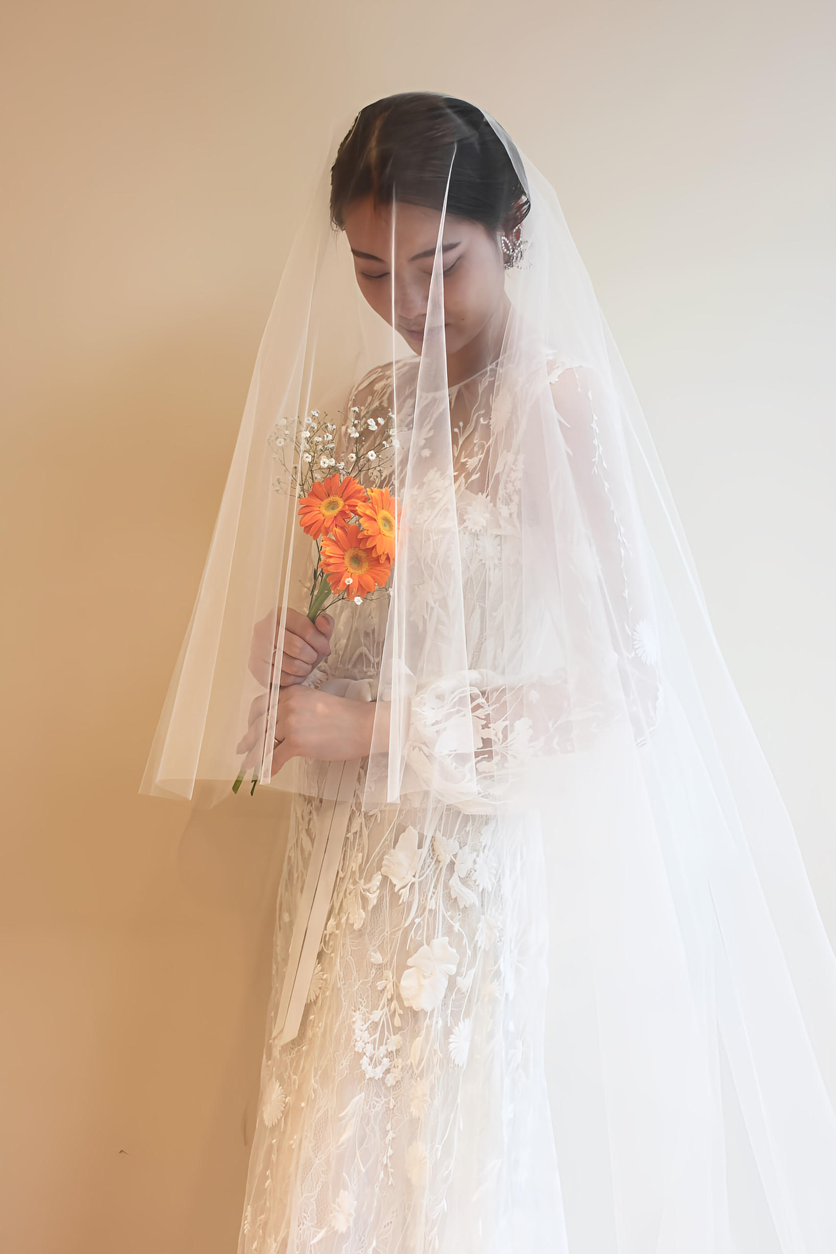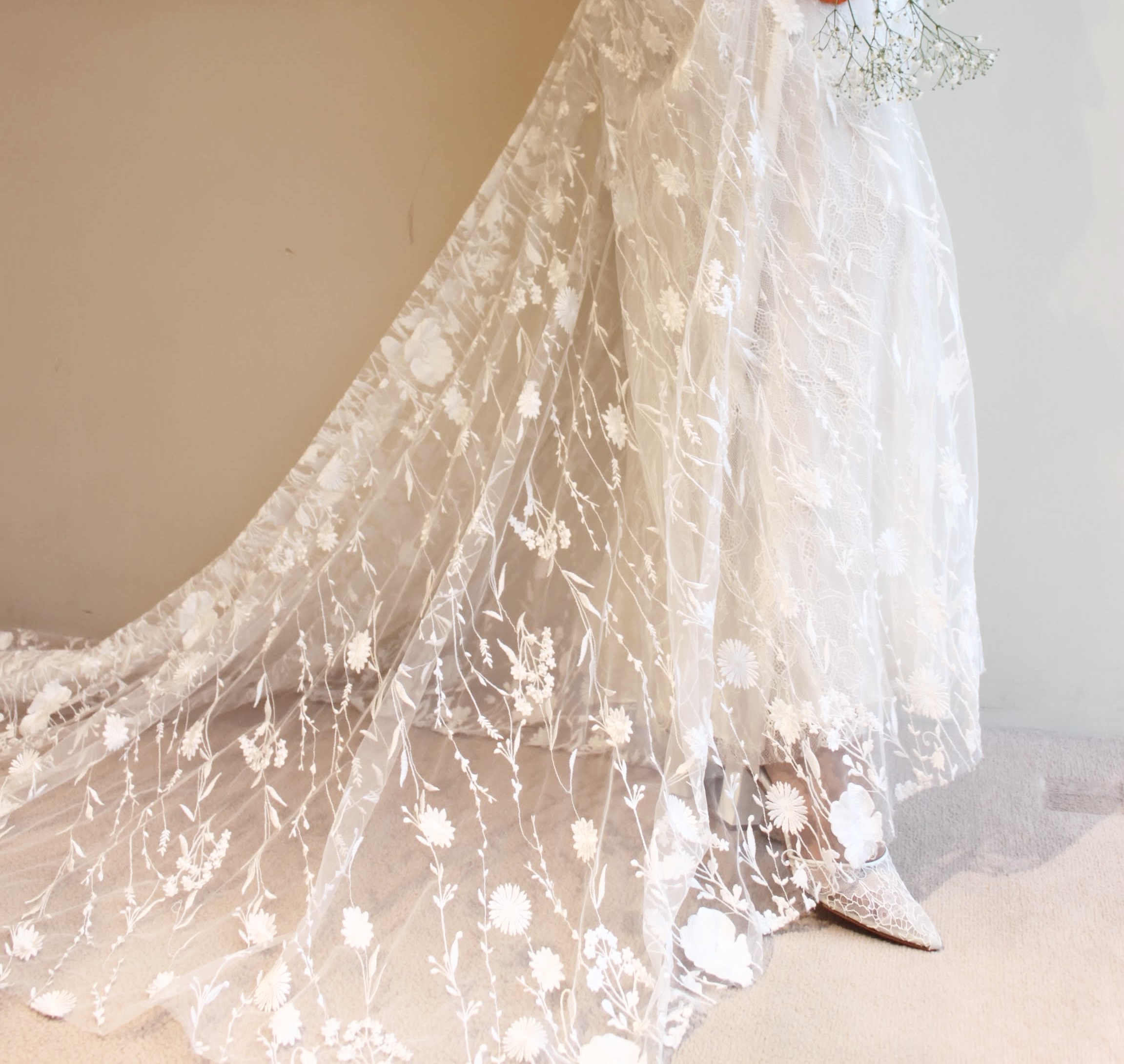 まるで生地の上にデッサンをしたかのような可憐で緻密なレースにうっとりするこちらのウェディングドレス。エンブロイダリーレースという刺繍で作られ、レースの中でも最も有名なレースと言われています。透け感のある生地の上にレース模様を作り、専用のエンブロイダリーレース機を使用し、職人の手によって丁寧に仕立てられています。このドレスを見ているとナイーム カーンや職人たちのドレスに対する信念やバックボーンが浮かび上り、何かを語りかけているようで、心がぎゅっと掴まれますね。繊細なリーフ刺繍と大ぶりなフラワーモチーフの可憐なコラボレーションが魅力的な1着です。袖元はモダンさを感じさせるパフスリーブ。指輪の交換やファーストバイト、そしてブーケを持っている時、花嫁の手に視線が注がれます。さりげなく施されたパフスリーブはお手元を優雅に、そしておしゃれな印象へと昇華。スカートの中生地は繊細なレースであえて短くカットされているため、後ろのトレーンと合わさった時は、芸術的な美しさに思わず心奪われます。バージンロードを歩くとき、会場の中に注ぎ込む自然光やスポットライトを浴びたお姿は、ベール越しに見えるレースが儚く上品に見えるため、一気に神聖なムードに。その美しさにゲストは思わず、うっとりすることでしょう。また、新緑をバックに撮影したときはレースの陰影がハッキリしているため、写真越しで見ても映えるデザインになっています。そんなドレスに合わせるヘアスタイルは、ふんわりとまとめたシニヨンスタイル。ネックがラウンド型にカットされているため、お顔周りがスッキリ見えます。アクセサリーはお花のモチーフが目を引くイヤリングを合わせ、可憐さをプラス。揺れないイヤリングを合わせることで、上品さも醸し出されます。ブーケはこれからの春シーズンにはピッタリな、ビビットなオレンジフラワーを合わせアクセントを。ビタミンカラーのお花は花嫁をより華やかに魅せてくれるため、幸福感溢れるお姿に。足元のシューズはHAAVE(ハーヴェ)というブランドのレースシューズをチョイス。ウェディングドレスの緻密さと同じ雰囲気のシューズを合わせると、ナチュラルなコーディネートに。