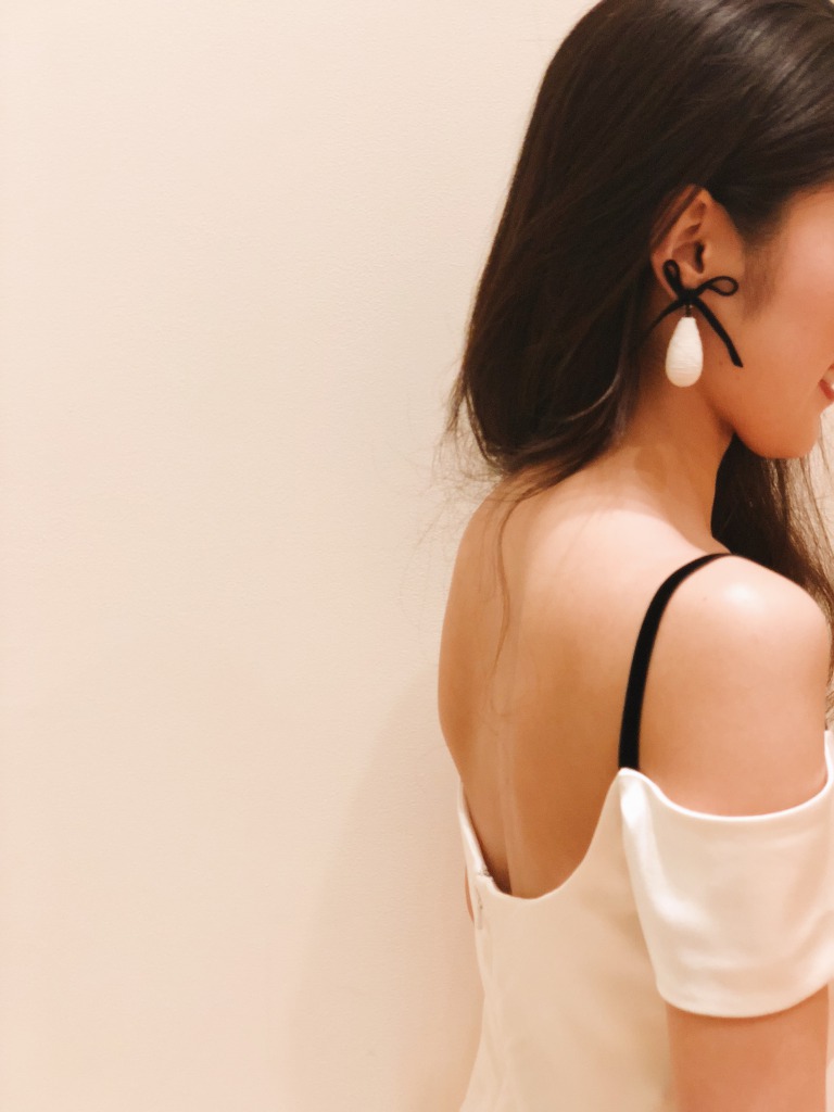 ブラックリボンで女性らしい中にもフェミニンな印象をプラスすると、イメージもがらっと変わります。