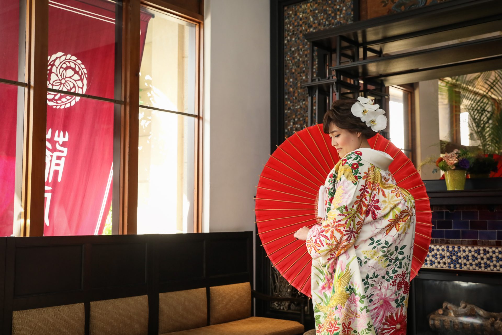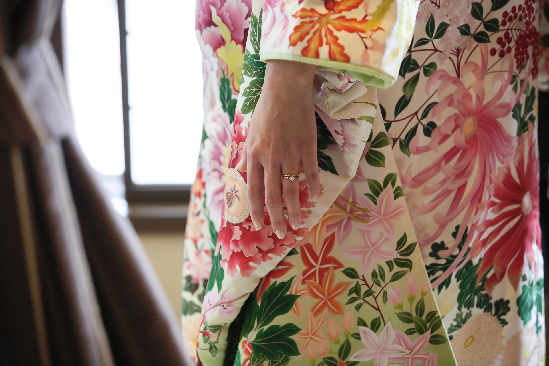 ご来店時にはすでに自身のブライズスタイルが具体的に固まっていらっしゃったご新婦様。なりたいイメージと似合うものが一致するのは必ずしも容易なことではありません。しかし、数ある色打掛の中から、この1着が着たいと期待を膨らませてお話してくださった瞬間、華やかかつ明るさを持ち合わせるご新婦様にぴったりだと、運命を感じたことを今でも覚えています。