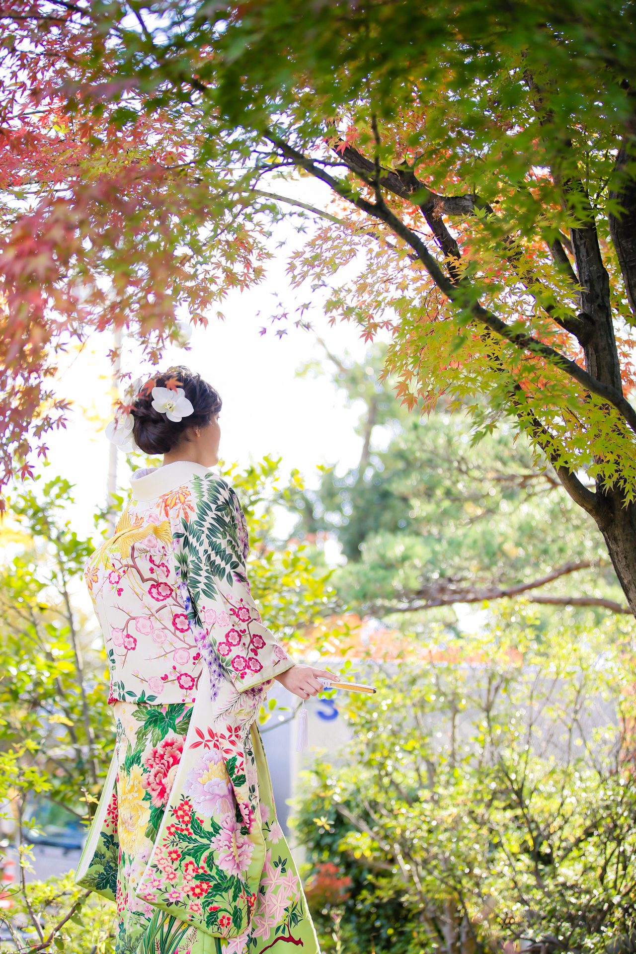 少しオリエンタルな雰囲気も感じられる四季草花の柄行は、他にはない特別感を感じられます。呼び名の通り、四季の花がふんだんに用いられており、左からは秋らしいもみじと金の鶴が、右からは藤屋御本陳らしい藤や可愛らしい梅の柄行が目を惹きます。また、裾元にかけての黄緑色のグラデーションは、アップスタイルと全身でのショットの印象を変えてくれます。このような「総絵羽模様」は、広げた時に1枚の絵画のようにみえる柄行が特徴で、各の高い着物に用いられるデザイン。ご新婦様や一緒にお衣装を選んでくださったご新郎様、お母様も大絶賛の華やかさでした。そして、お花がお好きだというご新婦様がヘアアクセサリーにセレクトされたのは、上品な胡蝶蘭。全体の華やかさを引き立てるために、小物はあえて白で統一し、美しい紅葉とのコントラストを演出できるようなコーディネートが完成しました。