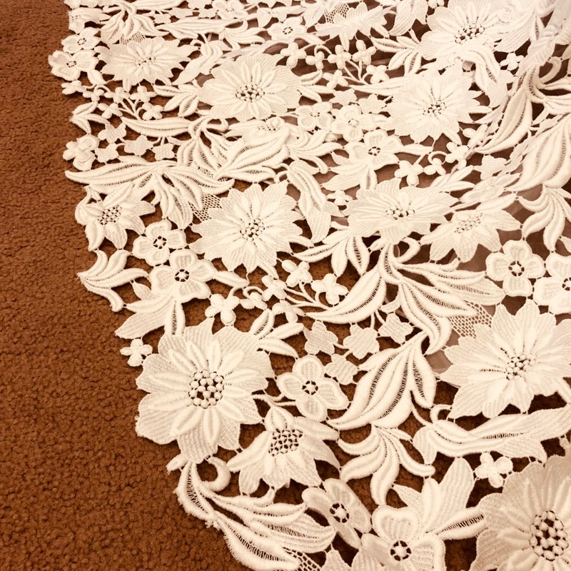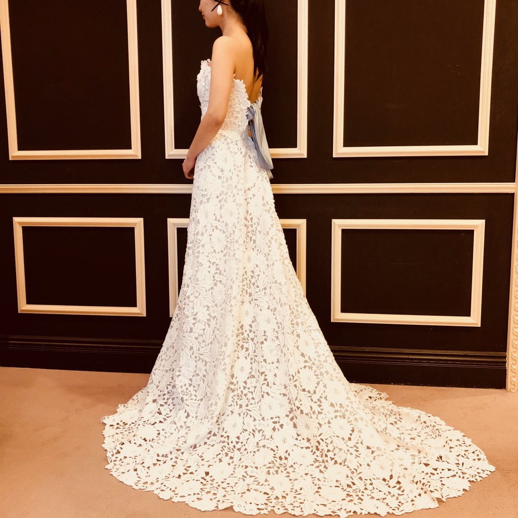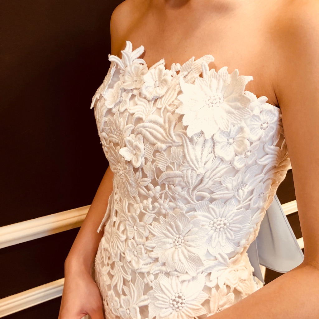 大振りのレースをふんだんにあしらい、シルエットからは美しい女性らしさが演出されます
