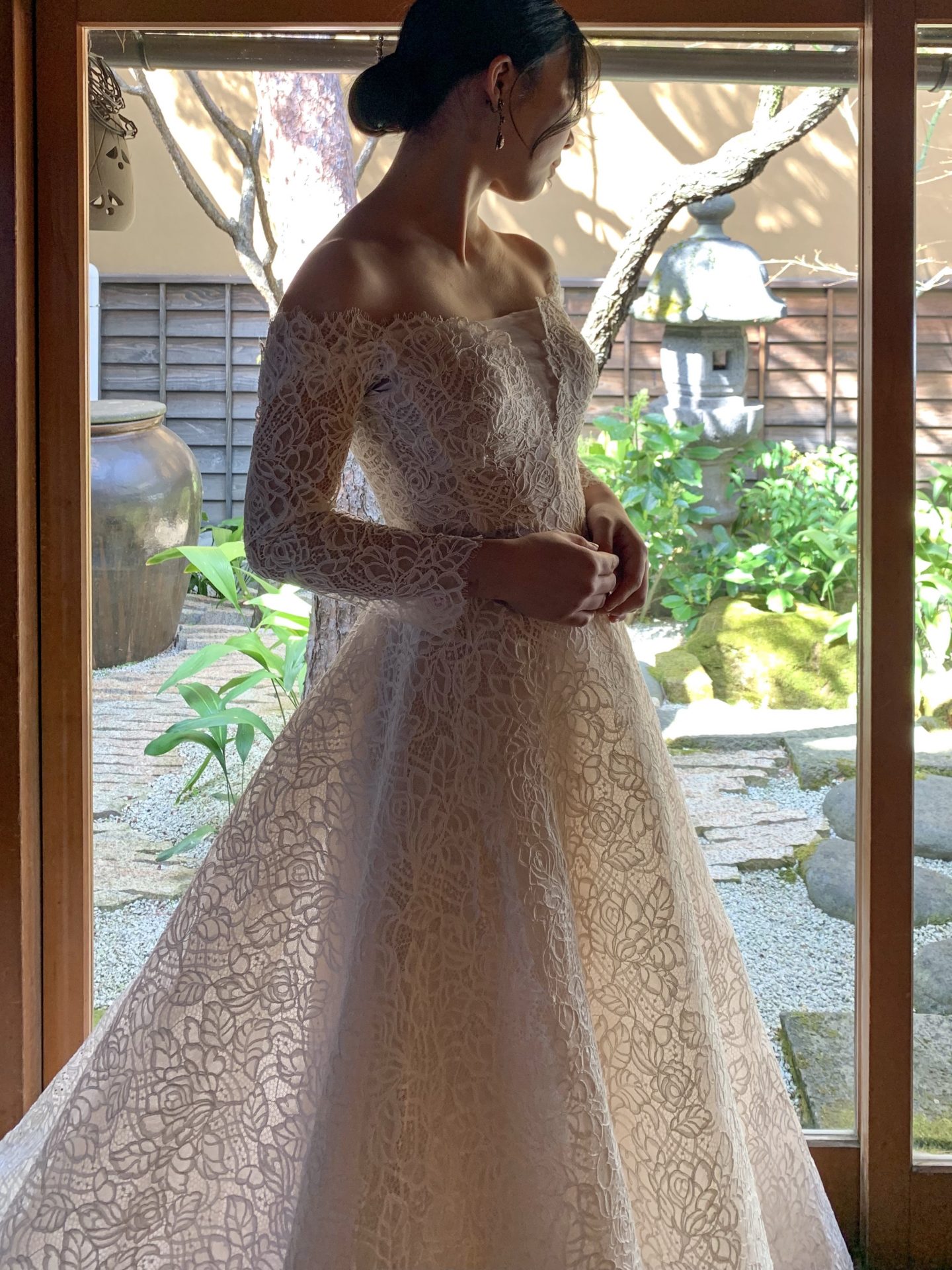 袖を外すとオフショルダ―になり2wayの着こなしを叶えるウェディングドレス