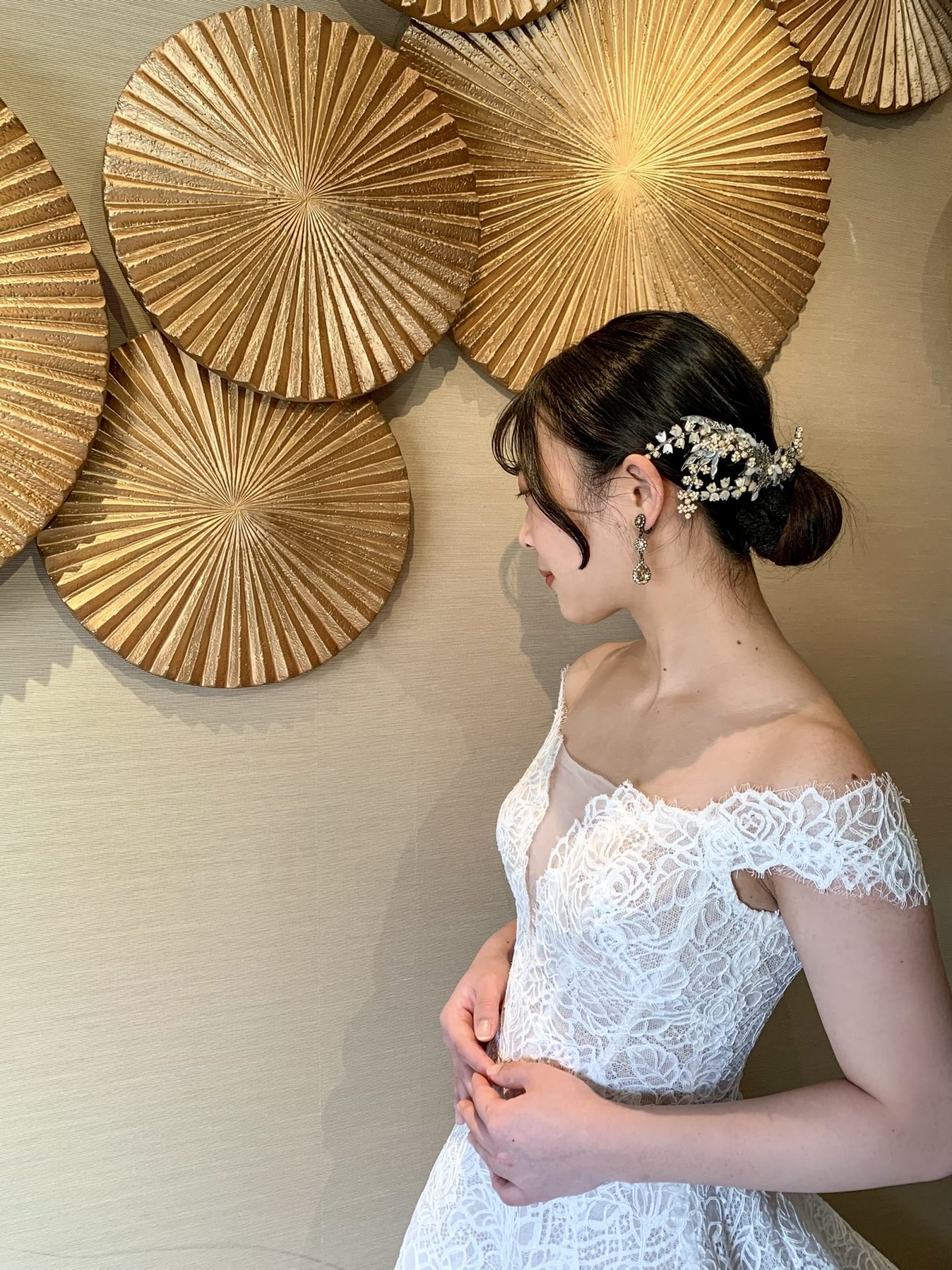 クラシカルなウェディングドレスにはかっちりしたシニヨンヘアーでよりシックで女性らしいスタイリングに