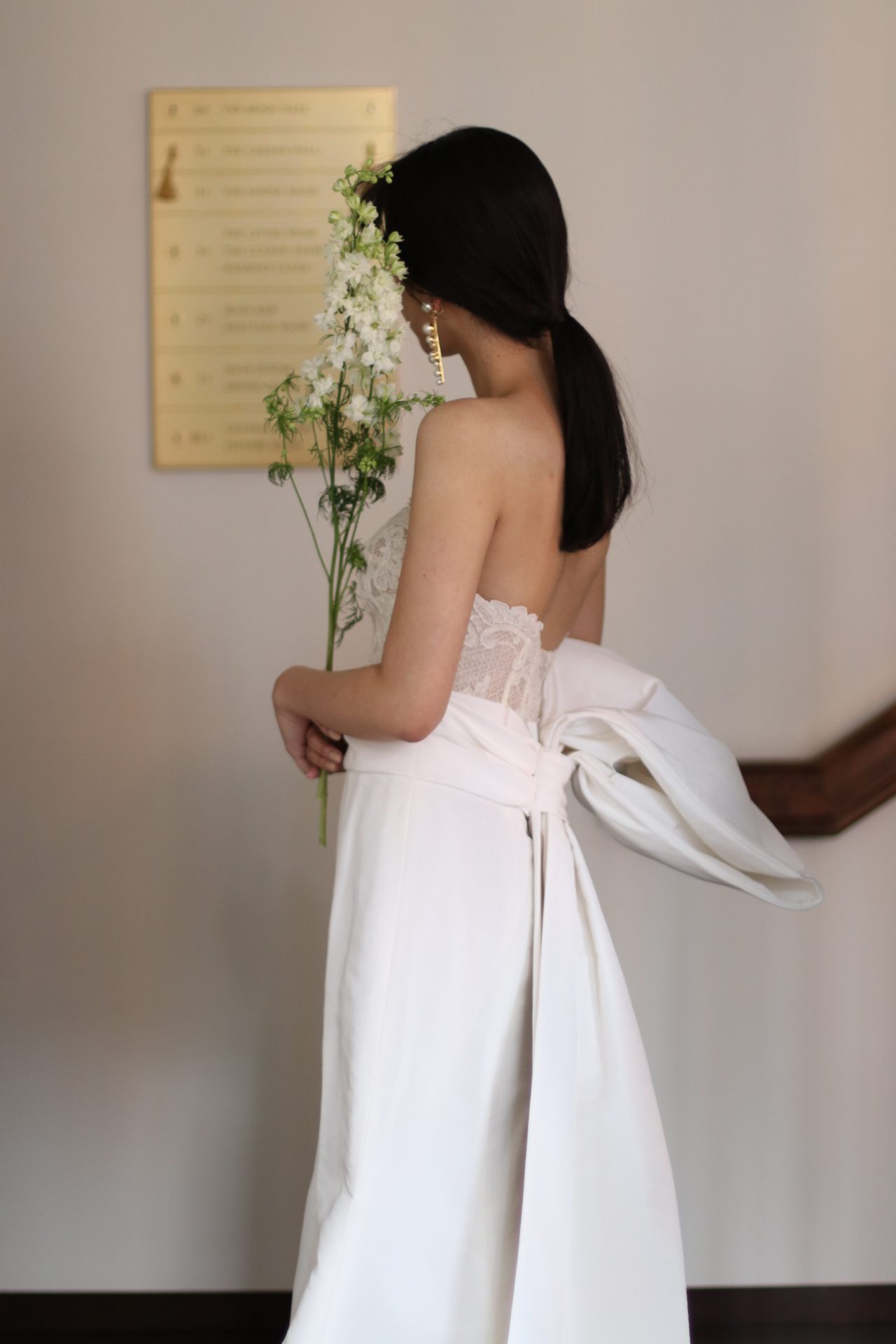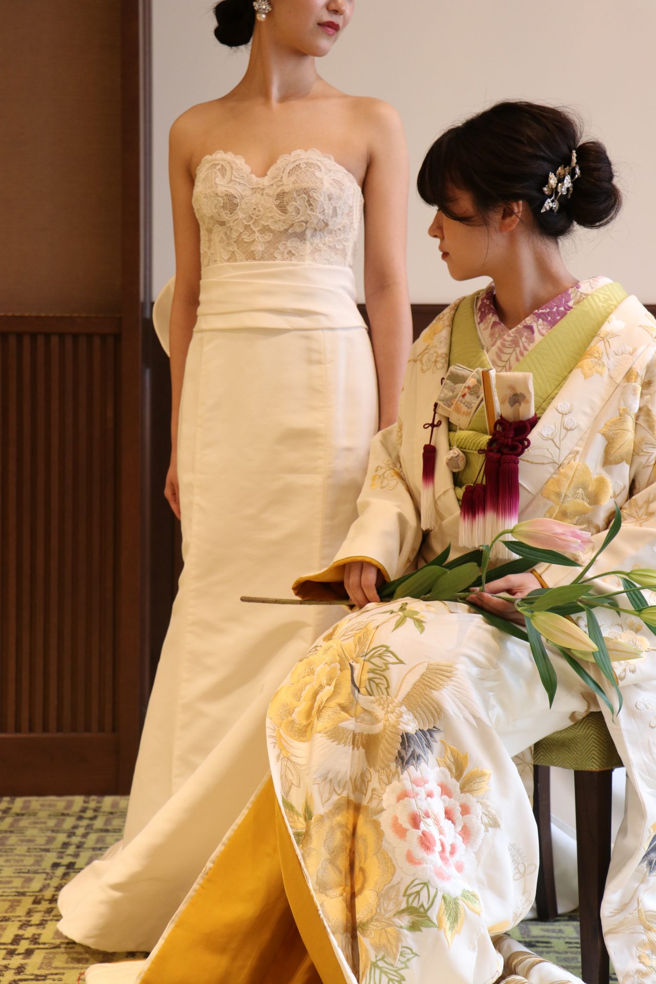 シルクならではの温かみのある生成りの色味が邸宅のような会場に溶け込み、優しい印象に・・・