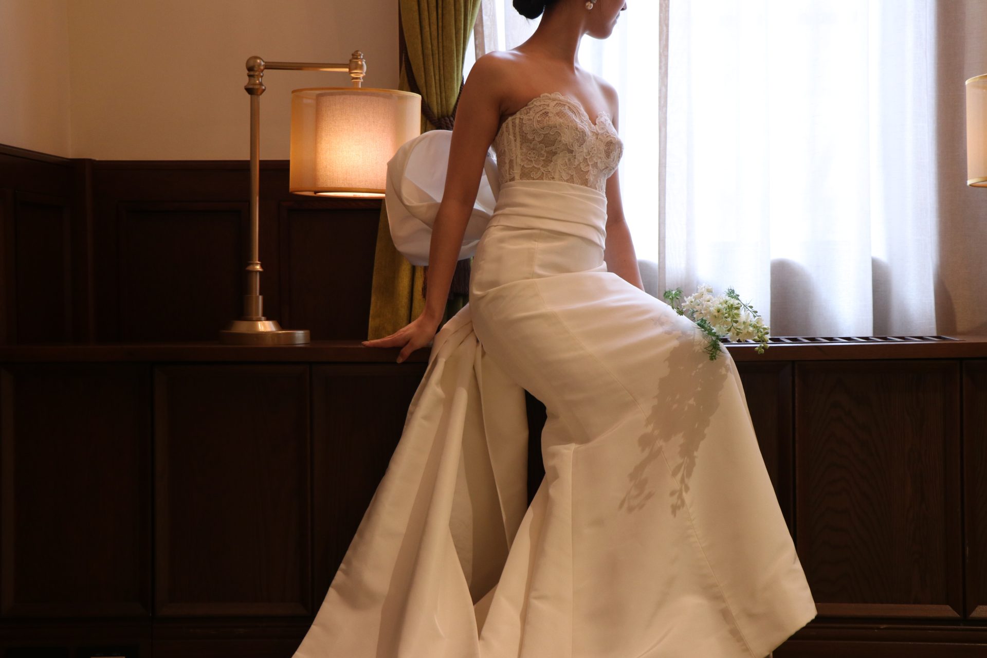 タフタのハリ感のあるスカートに対して、ビスチェには立体的なレースが施され、