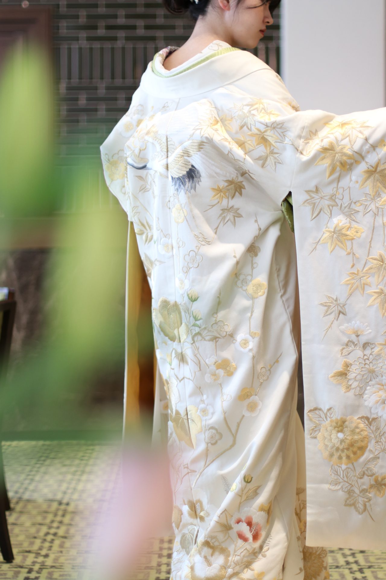 ちりめん素材に金糸の刺繍が施された、柔和な印象の色打掛をご紹介いたします。