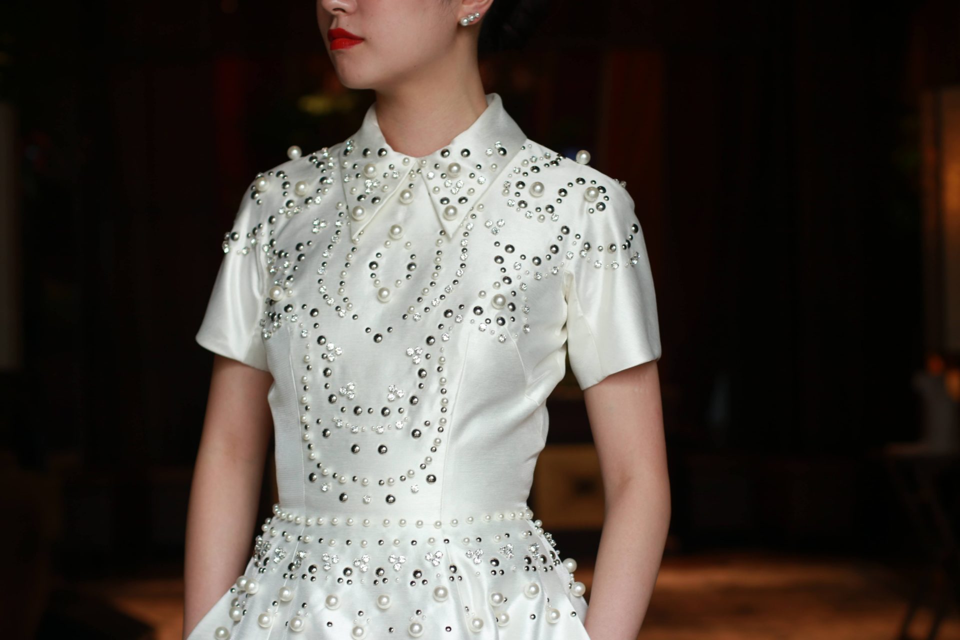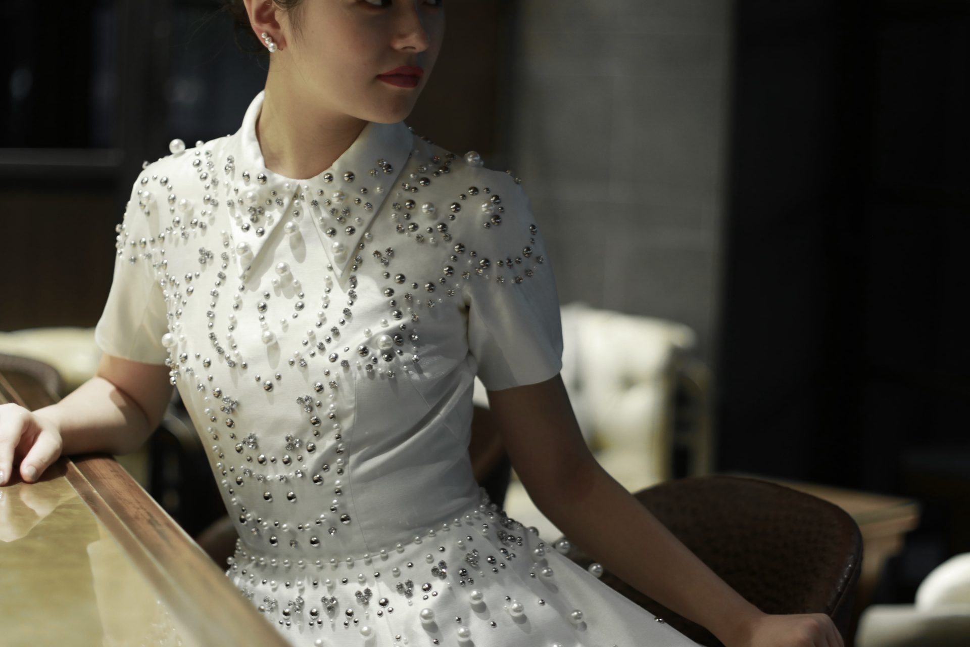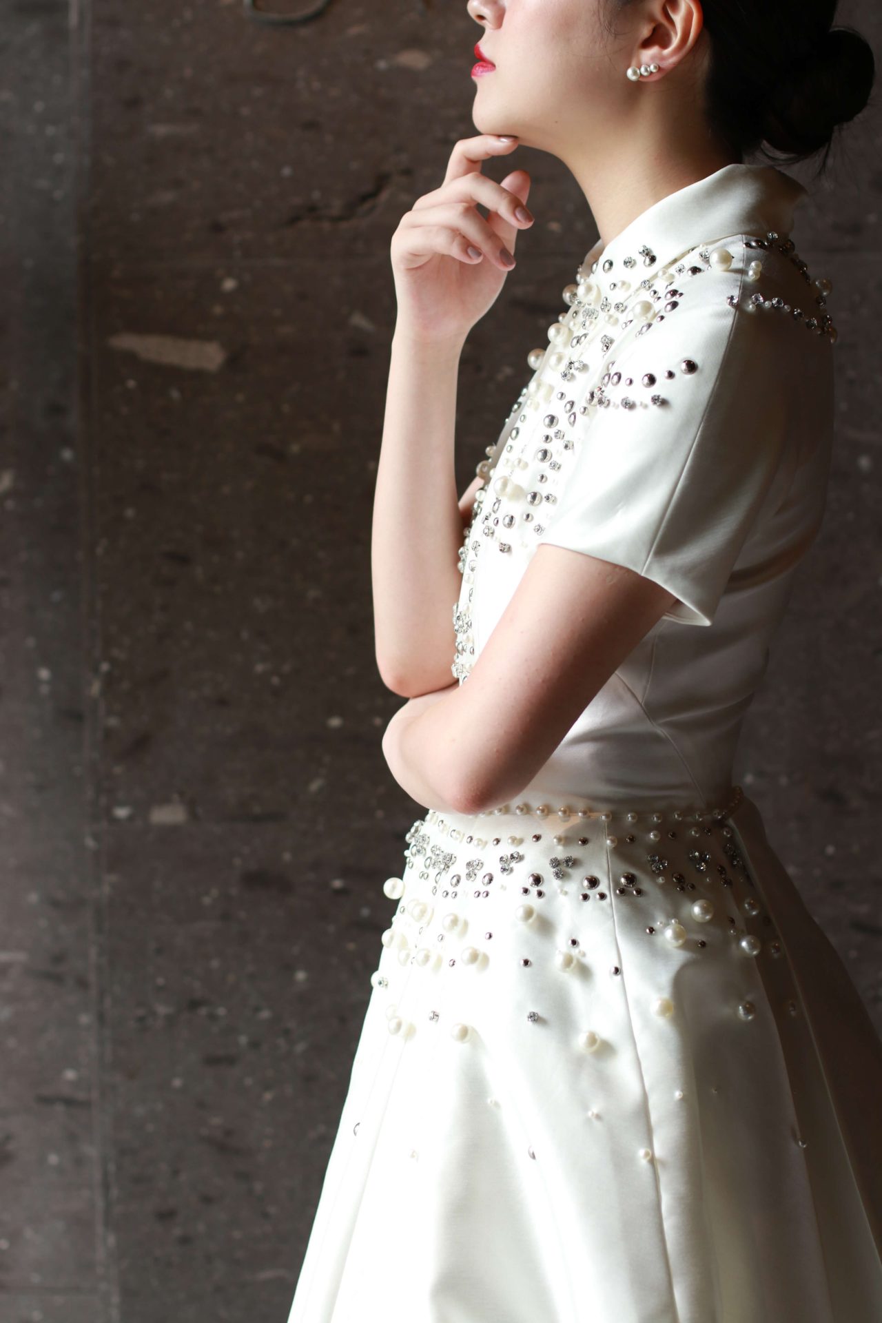 大ぶりのビジューやそのシルエットで一見モードさを強く感じさせる一着ですが、