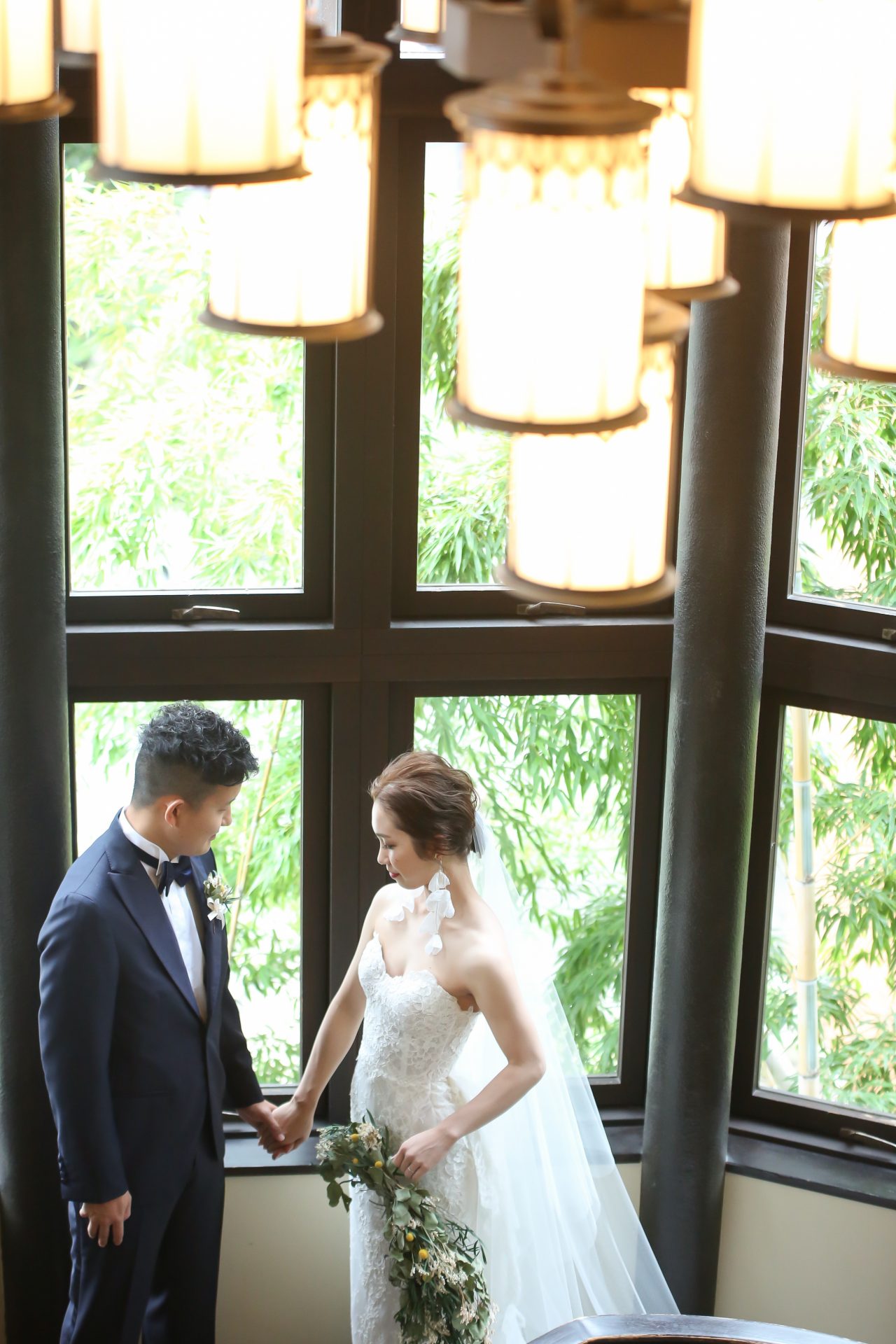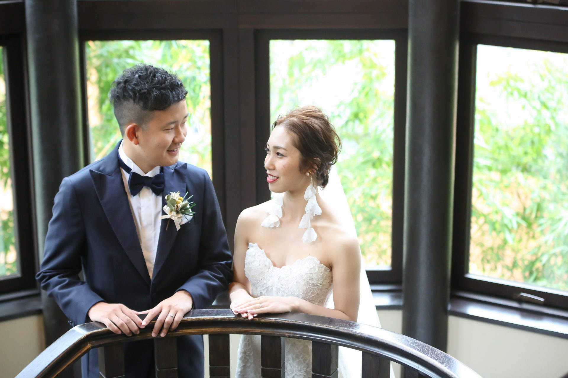 ミッドナイトブルーのタキシードにネイビーのタイをコーディネートすることで、自然なグラデーションを生み、パーティーシーンに相応しいモダンかつスタイリッシュな装いに。窓からは木々の優美なグリーンがのぞき、木目調の温かみを感じる、THE KAWABUN NAGOYA(ザ カワブン ナゴヤ)にてアットホームなお式をイメージされているお客様には、ミッドナイトブルーのお色味のタキシードがおすすめです。大切な皆様とお過ごしになる時間、お色直しのシーンでは挙式とは違う、ご自身らしい自由な装いをぜひお楽しみ下さい。