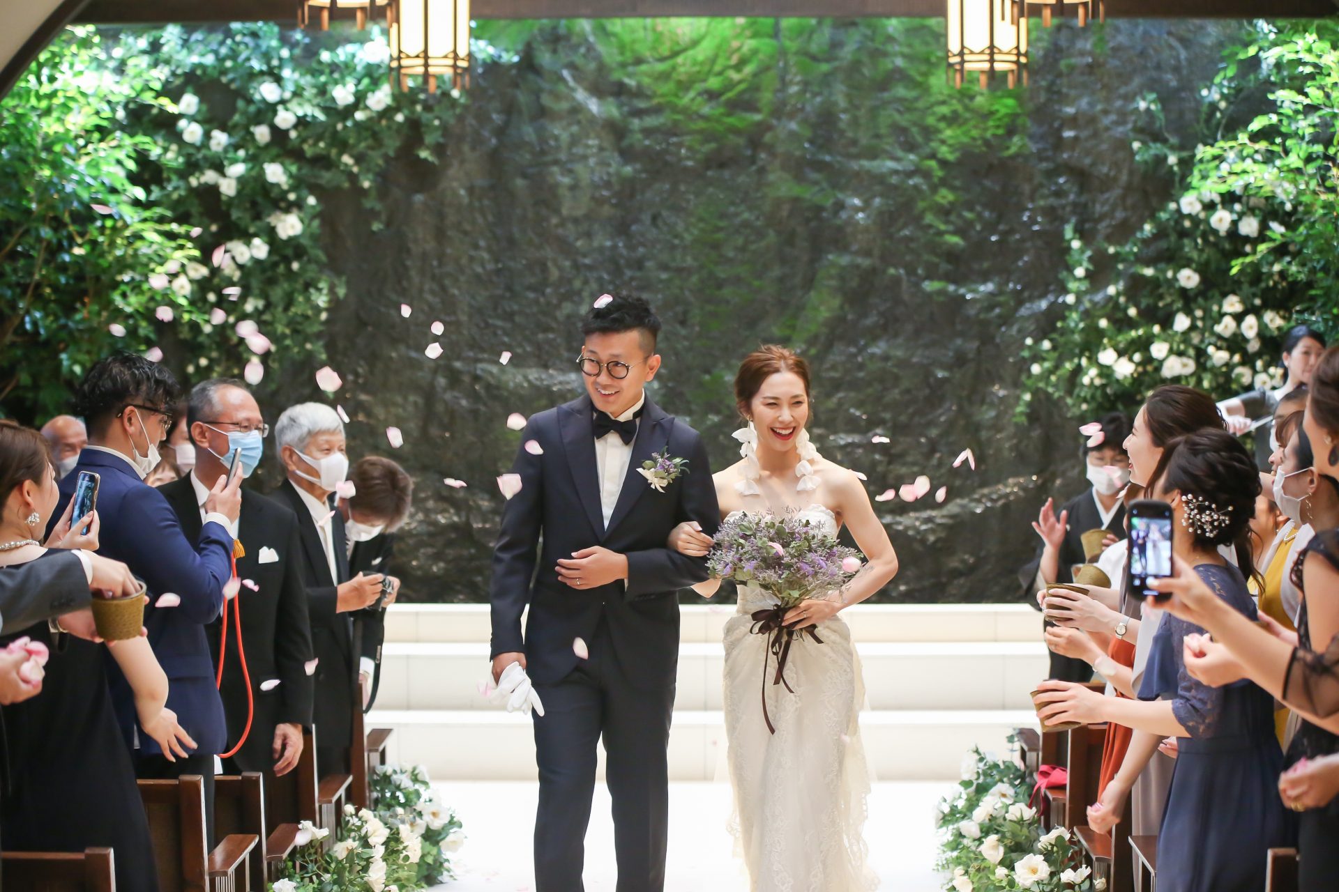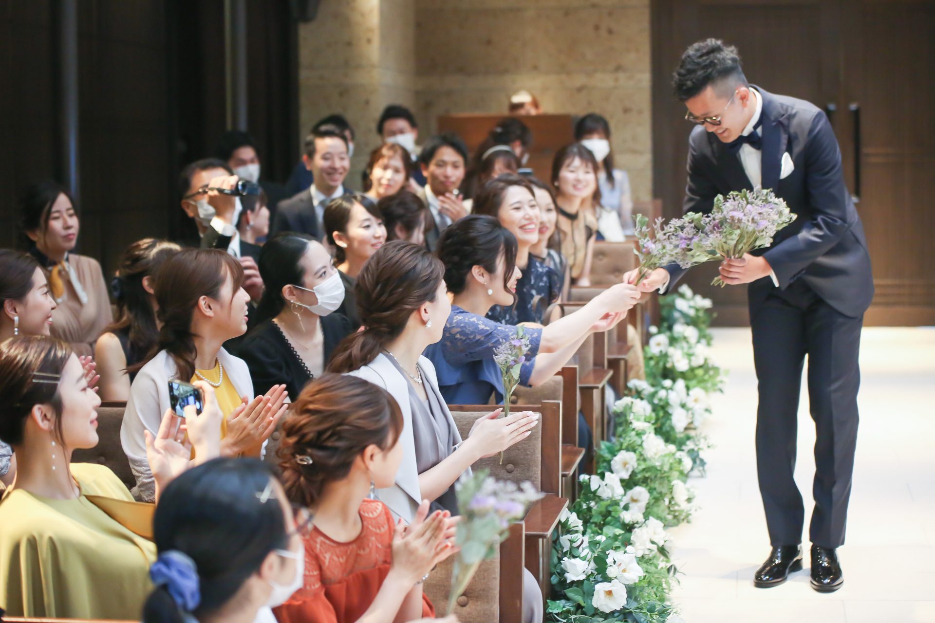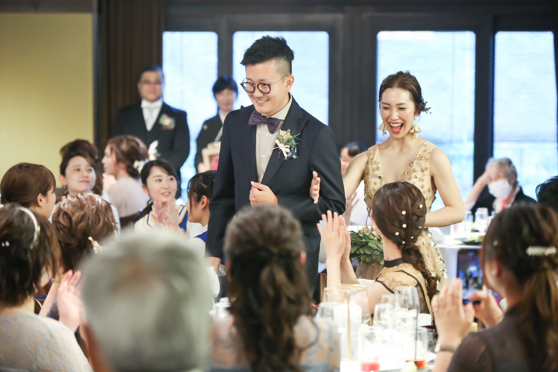 オーダータキシードとは違い、ご新郎様のお体に合わせて仕立てる事が出来ないため、ブランドが提案するデザイン、サイジングとお体が合う事が重要になります。新郎様にフィットしたタキシードはまさに、運命の1着と言っても過言ではないでしょう。別名ブラックタイとも呼ばれるタキシードのドレスコードは、モノトーンで小物を合わせるのが正式ですが、お色直しからは、新婦様のお衣裳に合わせてカジュアルダウンしたスタイルでお過ごしいただいてみてはいかがでしょうか。