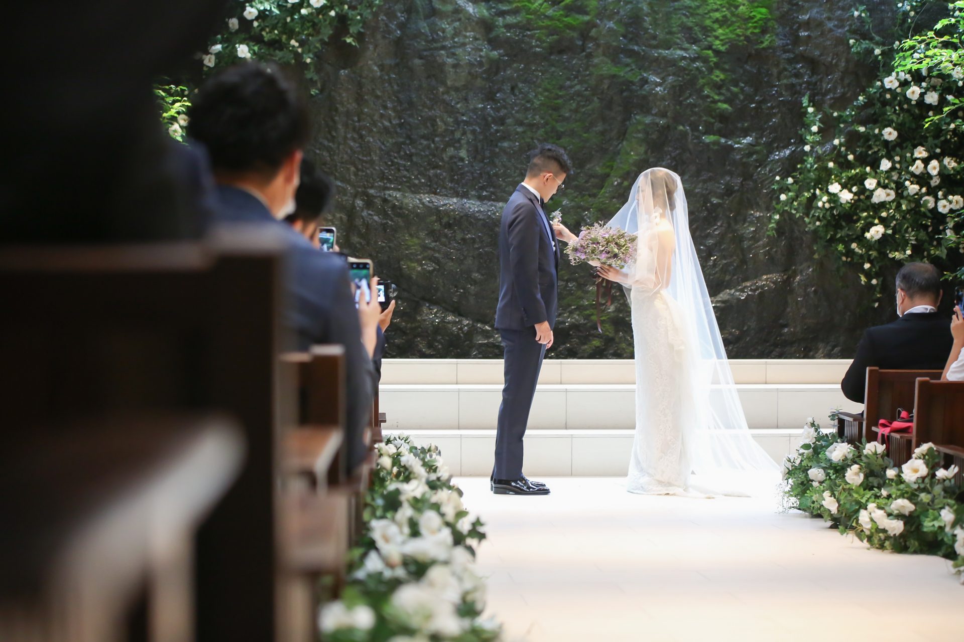 ブラックのボウタイに、胸元から覗くホワイトのプリーツシャツ、袖元にはブラックオニキスのカフリンクスを合わせ、ドレスコードとして相応しいクラシカルなコーディネートに。白と黒で創り上げた正統なタキシードスタイルは、シンプルかつ上品な印象のウェディングドレスをお召しになられた新婦様をより引き立ててくれます。ダークブラウンを基調としたシックな雰囲気のTHE KAWABUN NAGOYA(ザ カワブン ナゴヤ)にも高級感のあるブラックがマッチし、おふたりの特別感をより際立たせてくれます。