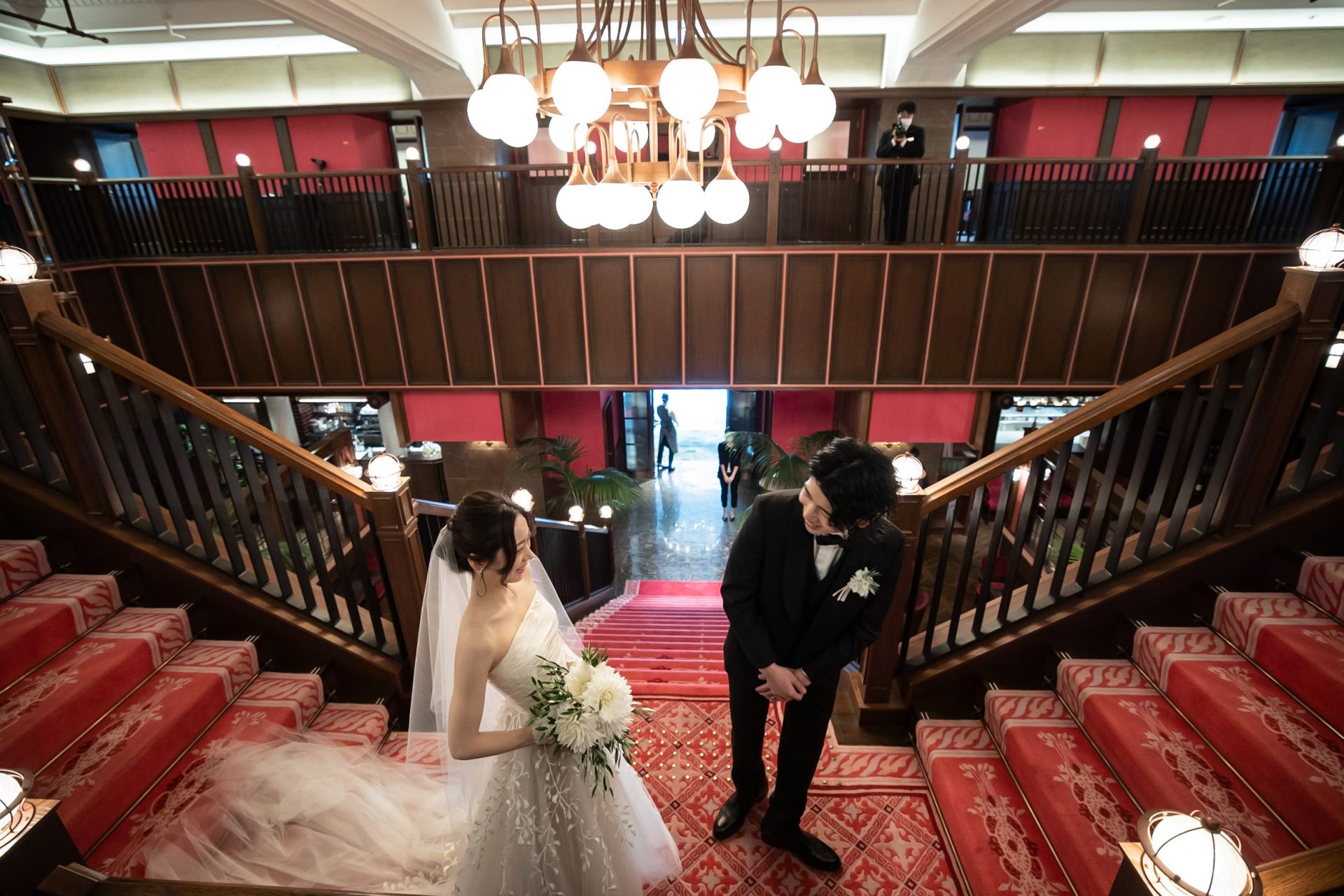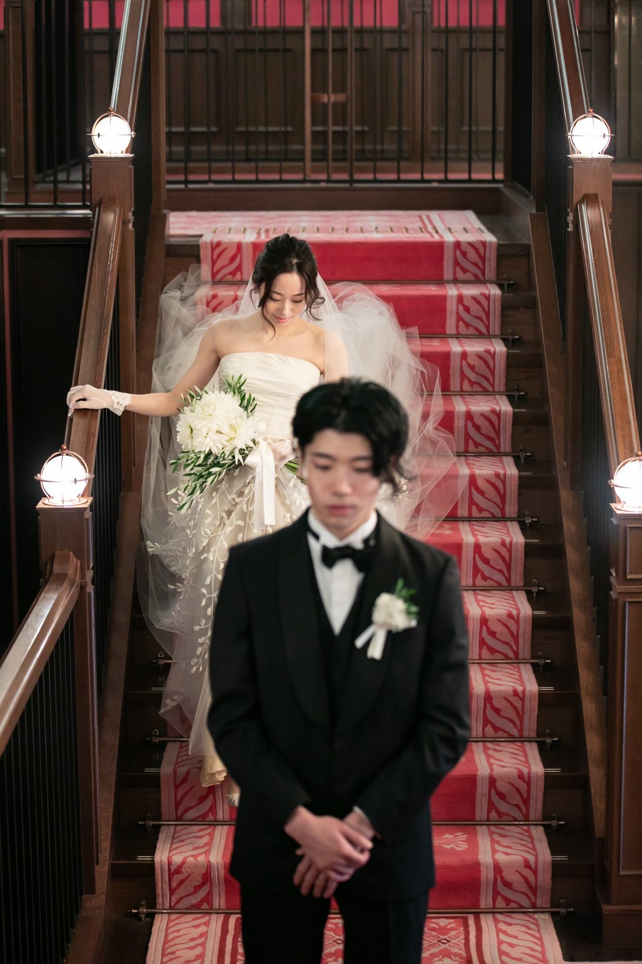 ザ・コンダーハウスで人気の大階段でのファーストミート THE TREAT DRESSINGがザ・コンダーハウスでお式をされるご新婦様におすすめのオスカーデラレンタのウェディングドレス初めて、ウェディングドレス姿のご新婦様を目の前にし、思わず満面の笑みがこぼれます。お互いのお顔を合わせた瞬間に緊張が解け、笑顔でいっぱいのひとときが生まれました。