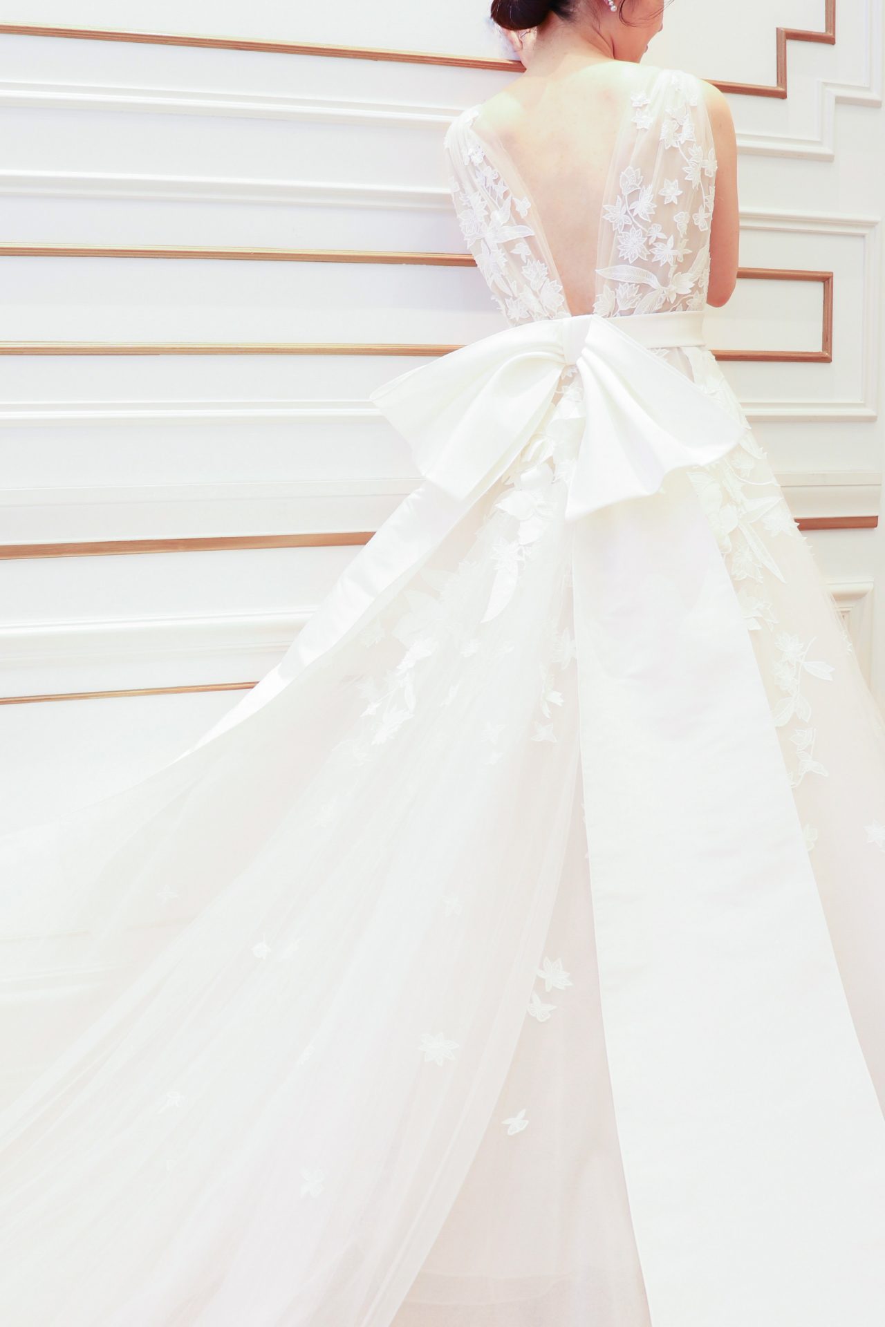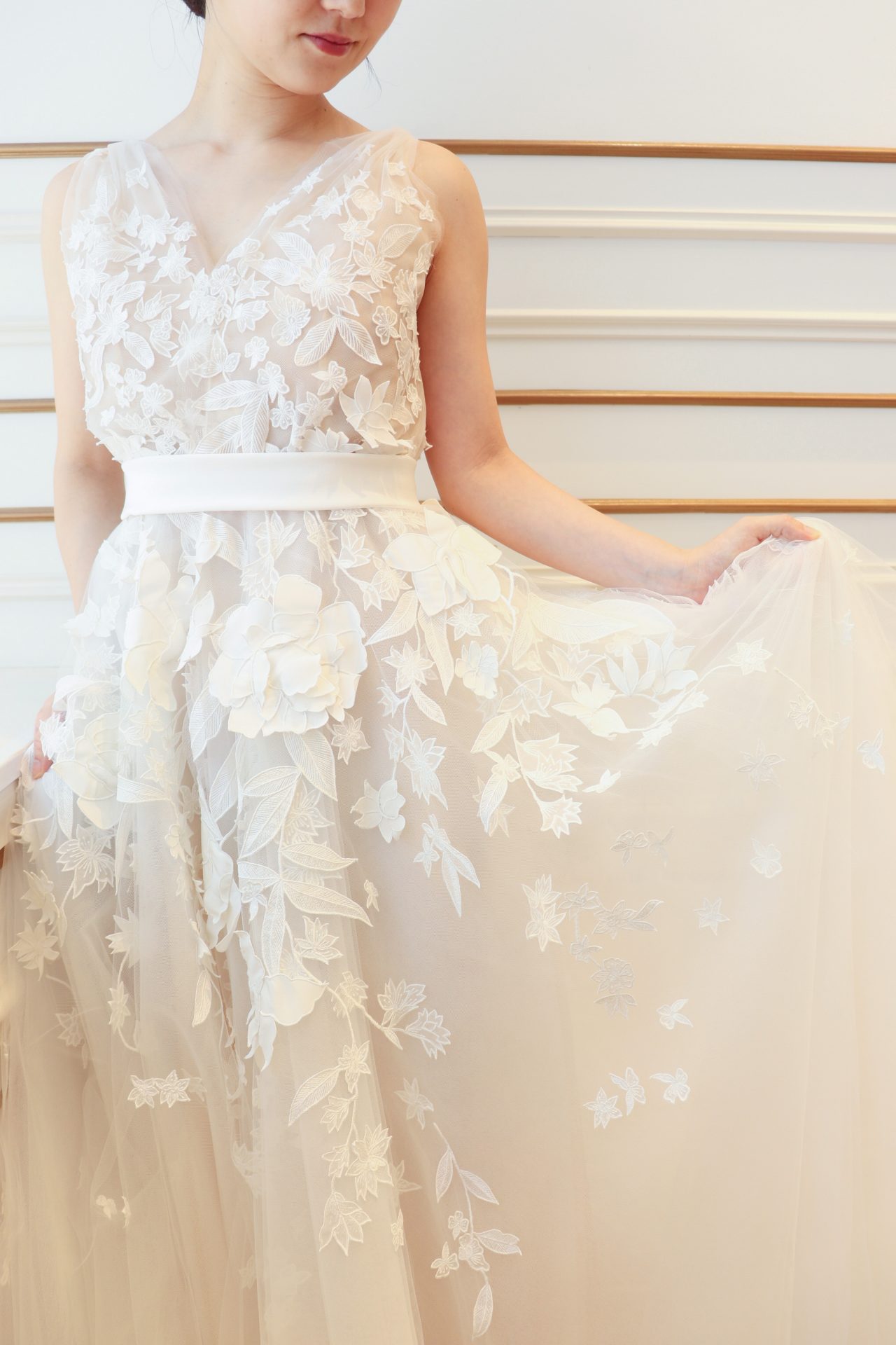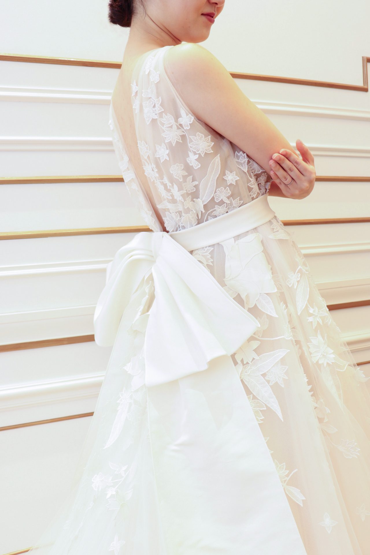 光に溶け込むようなシアーなチュールに心を奪われる1着。V字にカットされた胸元は、デコルテの美しさを強調し、チュールが表現する柔らかな雰囲気の中にも女性らしさを感じさせます。シルクオーガンジーで作られたフラワーモチーフのアップリケとまるで花びらが舞うようにボディー全体に施されたカットレースは、女性心をくすぐる愛らしい印象に。実は1枚目のチュールだけにレースを施しているのではなく、2枚目と3枚目にも絶妙なバランスでカットレースを置くことで、奥行きと立体感を生んでいるのです。オスカー デ ラ レンタが誇るアトリエの緻密なテクニックがここにも表れています。そしてアイキャッチーなバックリボンと裾元までしっかりと広がるトレーンがバックスタイルを華やかに彩ります。透明感のあるチュールをなびかせ、憧れだったバージンロードを一歩ずつ歩んでいくそのお姿に、きっとゲストの方もうっとりされるのではないでしょうか。