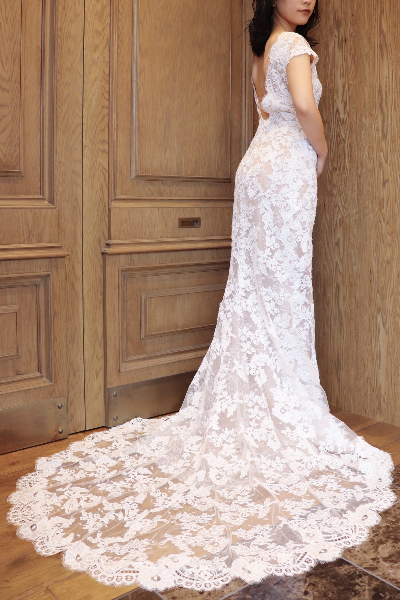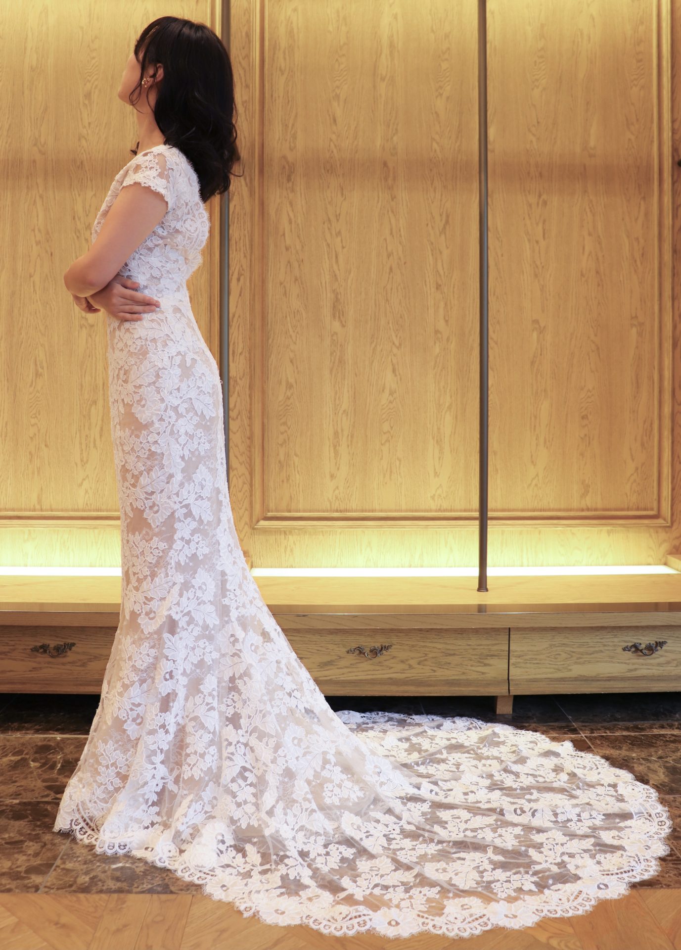こちらの衣装の最大の特徴であるスカラップレースは女性らしい印象で花嫁を包み込んでくれます。スカラップとは、貝殻をならべたような連続した半円の波型のモチーフのこと。仕立ての良いオスカー デ ラ レンタだからこそ生み出すことのできる計算し尽くされた美しいスカラップレース。決して甘くなりすぎることなく上品でしなやかな印象になります。ヌーディーなベージュの生地に重なる2種類のレースは、シンプルなマーメイドラインに輪郭をくっきりと浮かべるとともに、身に纏う花嫁の肌に溶け込みます。溢れ出す華やかさはどの角度からご覧いただいても美しさを感じていただくことができるでしょう。