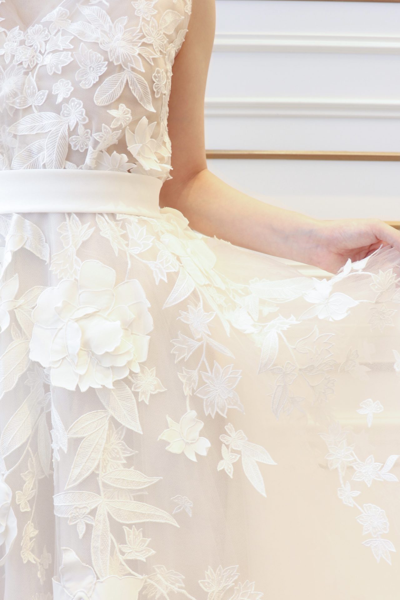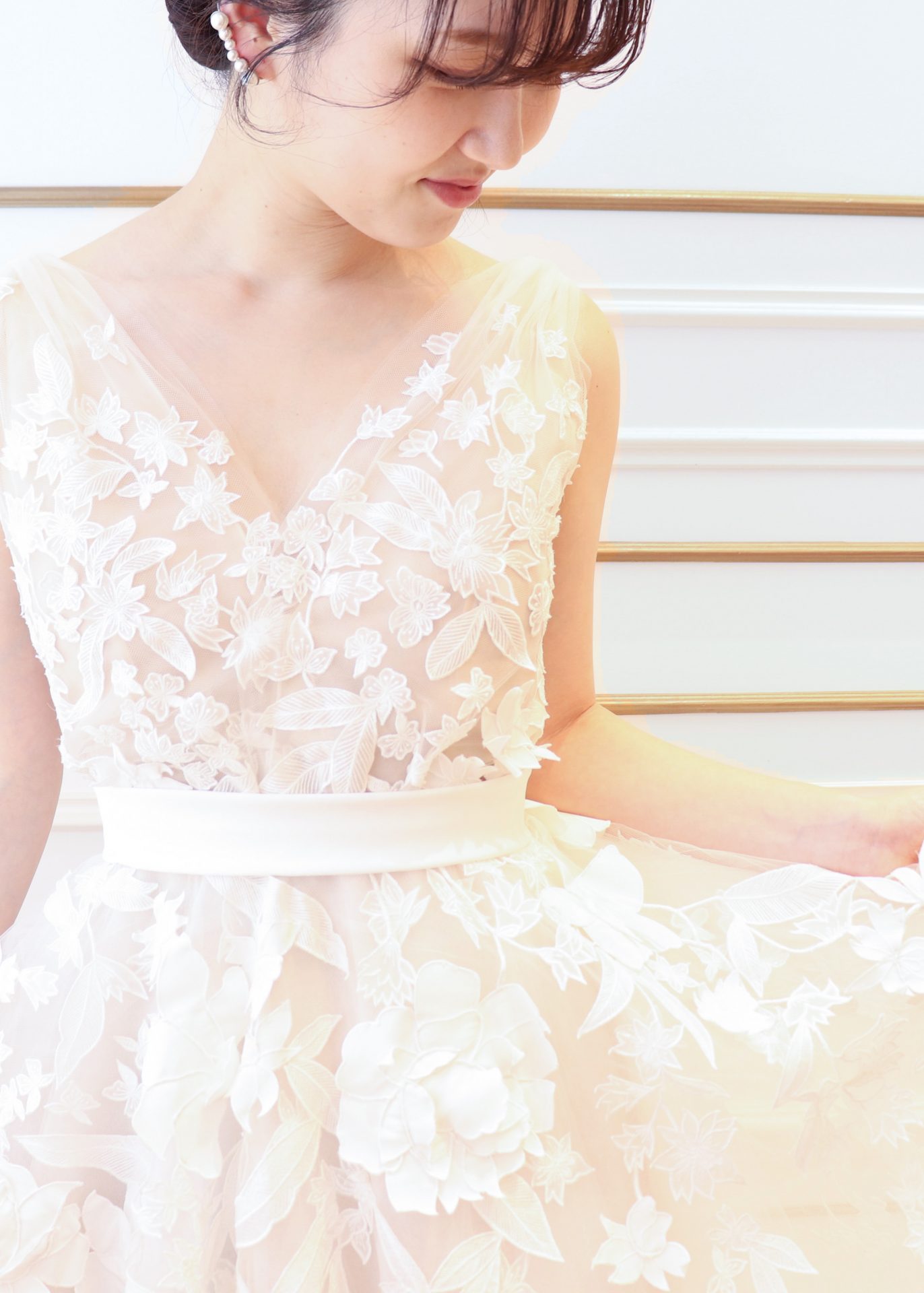 柔らかなチュールにフラワーモチーフが重なるAラインのウェディングドレス
