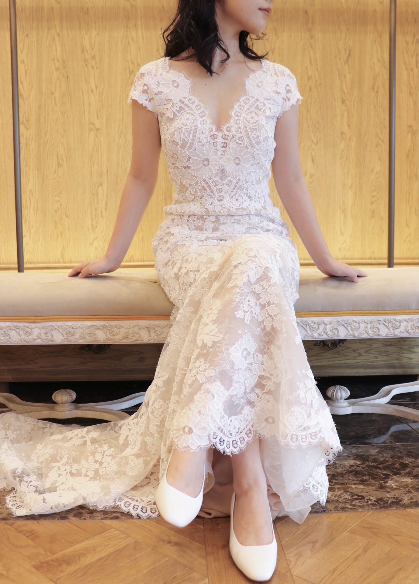 総レースのドレスは重厚感があり、凛としたエレガントさを感じさせますが、今回のコレクションのテーマでもある”自由さ”も表現できるようヘアはゆるく巻いたダウンスタイルに。さりげなくもアクセントになるようなゴールドのイヤリングを合わせ、メイクはヌーディーで落ち着いた色合いにしました。そして足元にはホワイトカラーのスタイリッシュなシューズをセレクト。シンプルなスタイリングだからこそ花嫁のありのままの美しさを表現しリラックスした雰囲気を演出。おふたりを大切に想うゲストの方と過ごす結婚式だからこそ、自分らしさを大切にした自由なスタイリングをしてみてはいかがでしょうか。