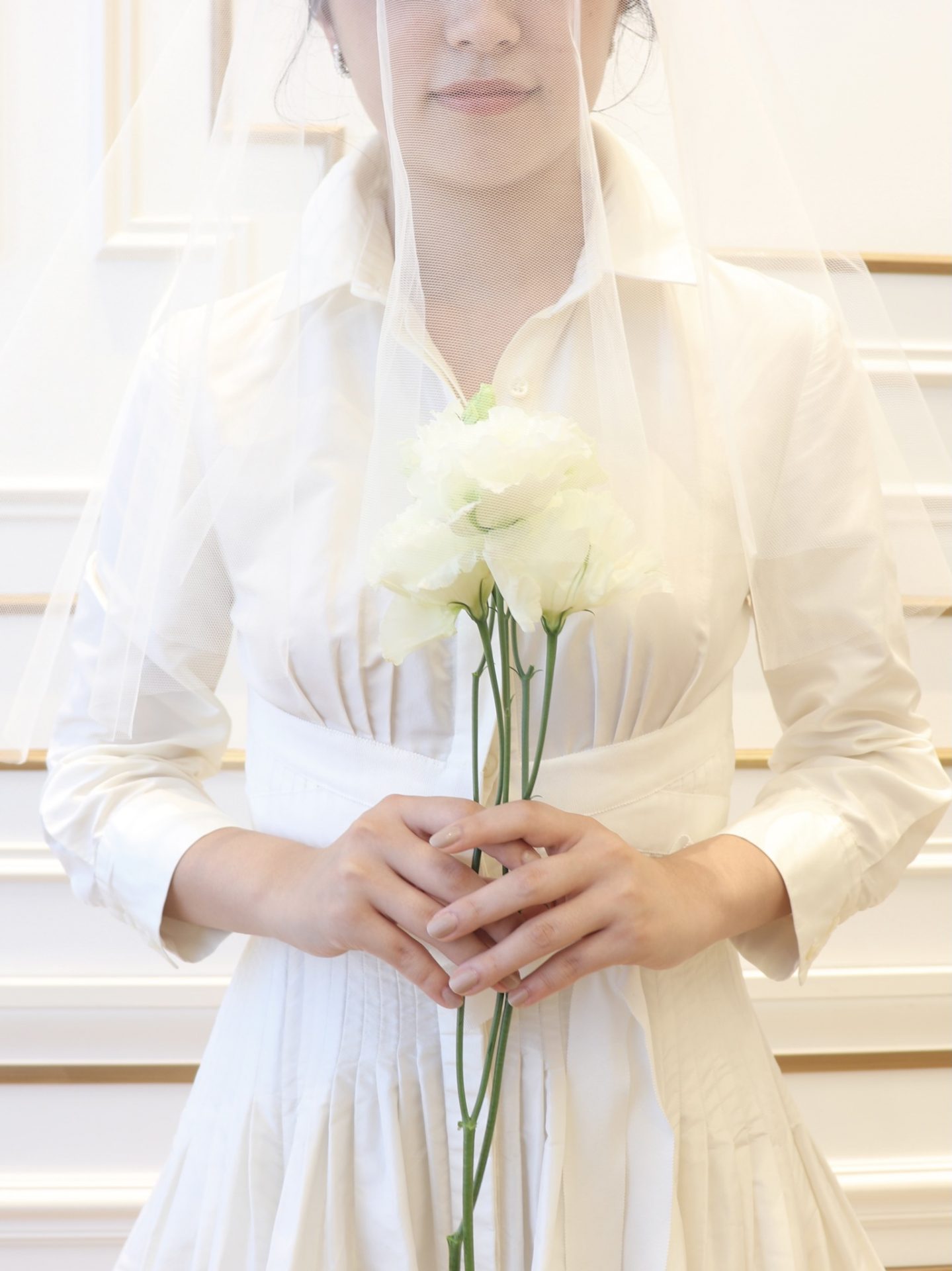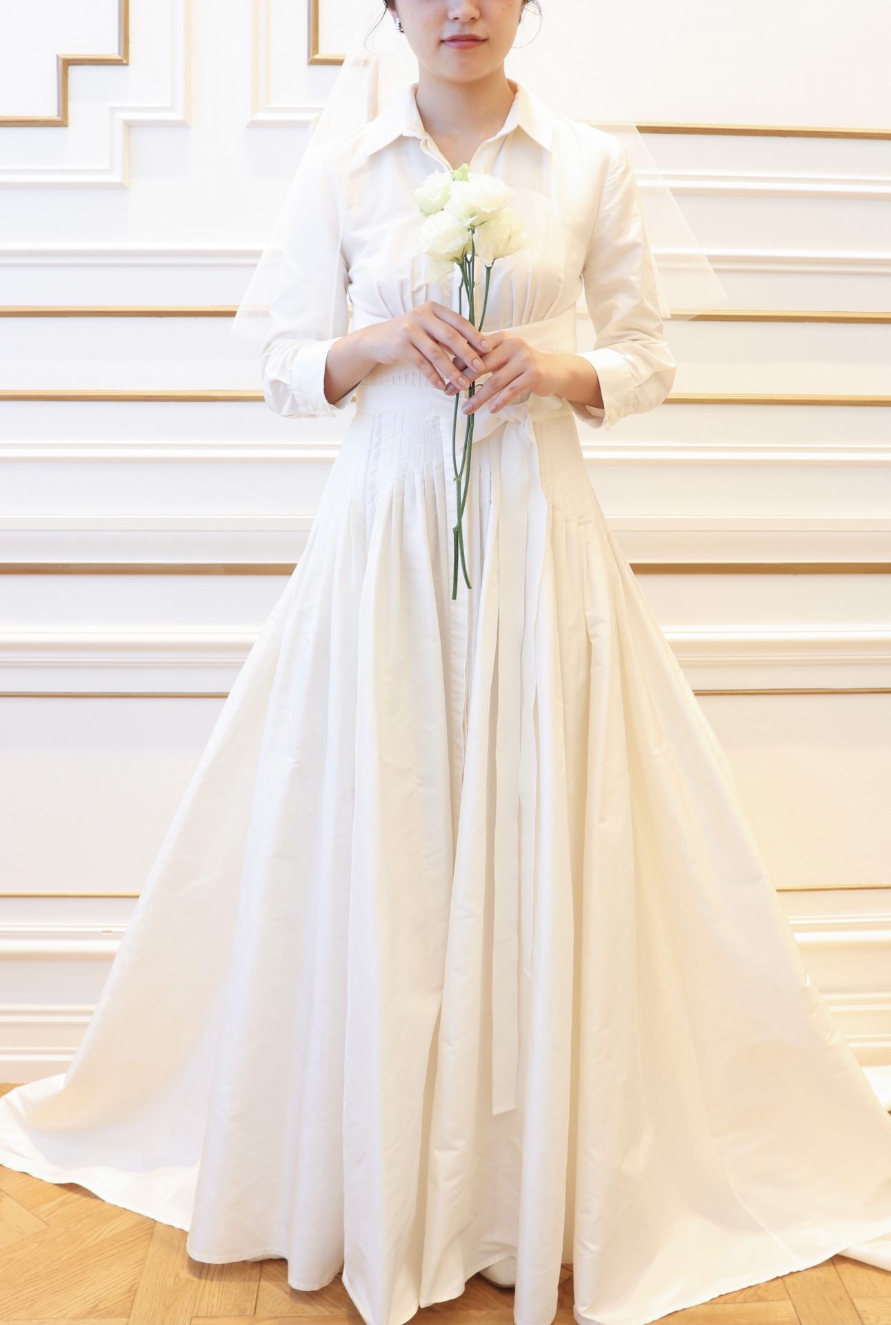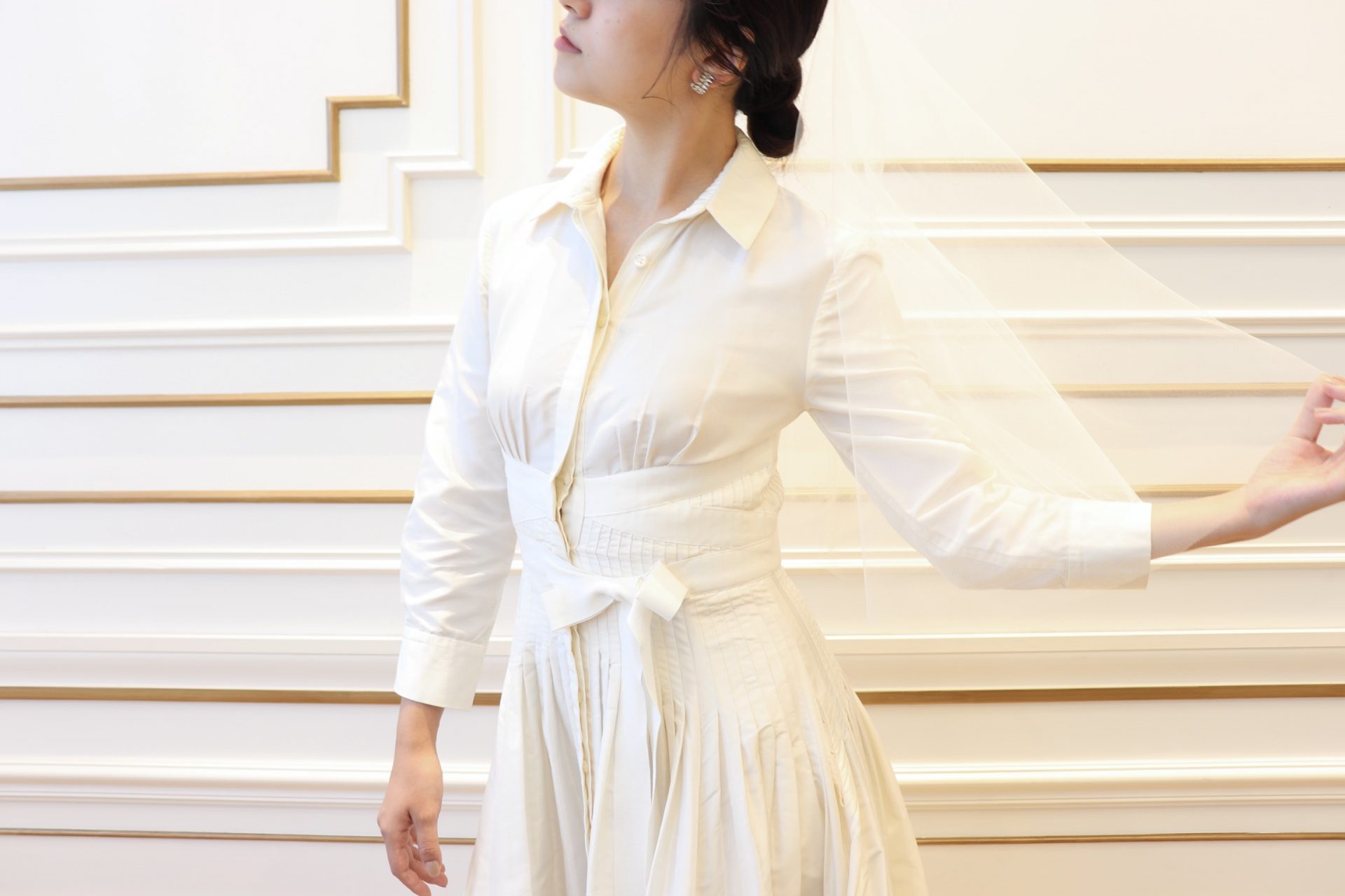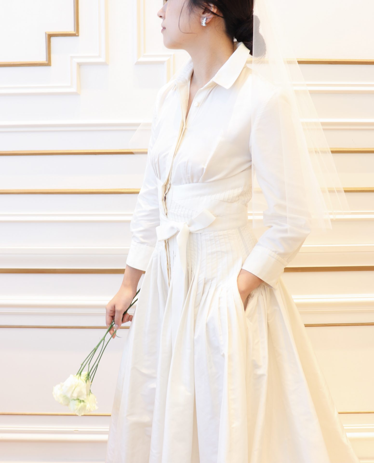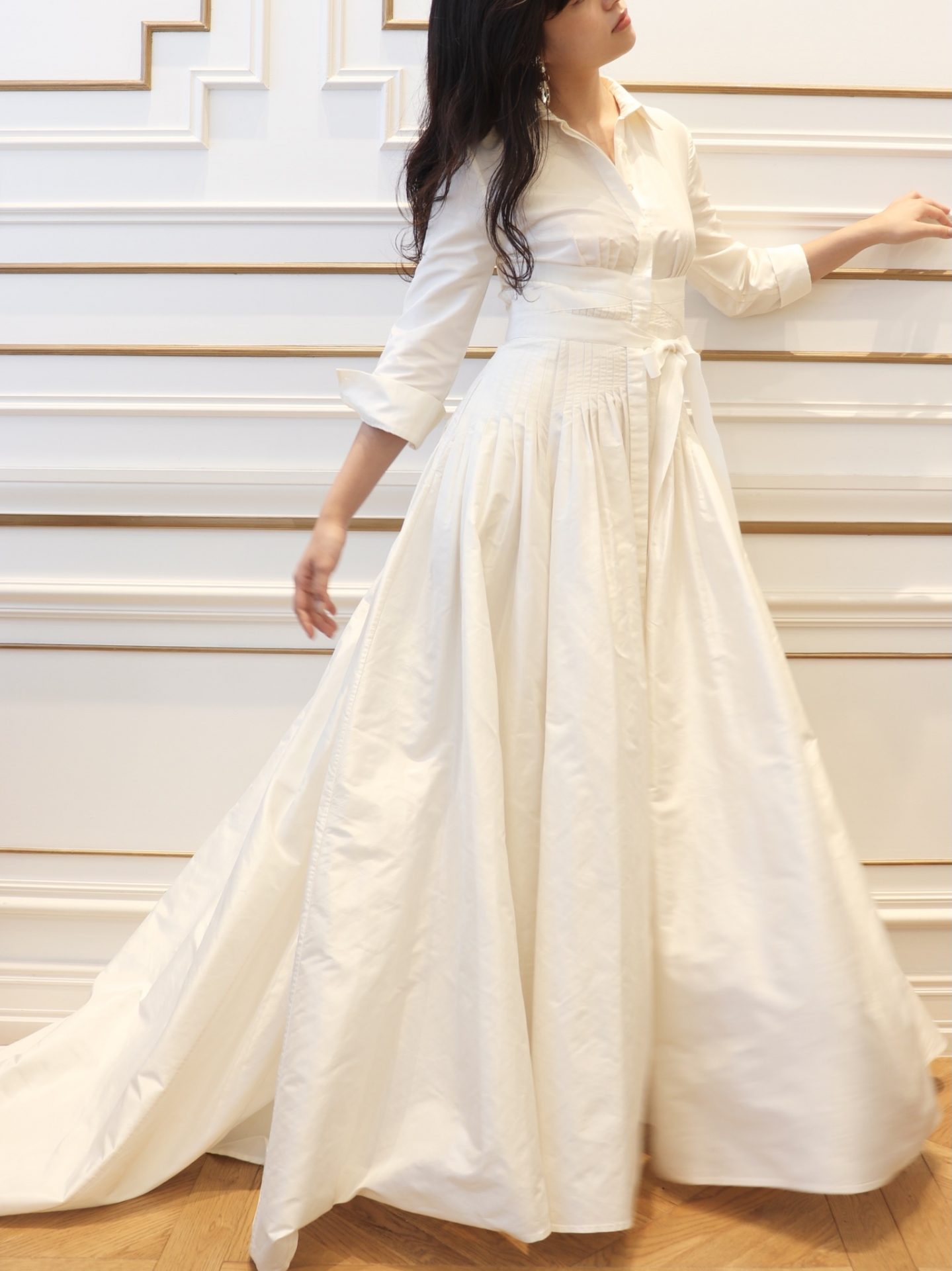 シンプルながらも思わず惹かれるのは、アメリカンクラシックが体現されているウェディングドレスだからこそ。ウエストにかけてピンタックが施されたウェディングドレスは、デザイナーであるキャロリーナ ヘレラのトレードマークのシャツを思わせるデザインで、ご自身だけのブライズスタイルを叶えたい花嫁におすすめです。シルクタフタの柔らかい光沢は、襟元やスリーブから感じるクラシカルな雰囲気の中に上品でしなやかな女性らしさを表現します。さらにデコルテを美しく見せるシャツの襟の開きやキュッと絞ったウエストのリボンはモダンさをプラスするとともに、ご新婦様がお持ちの美しい身体のラインを最大限に引き出してくれます。お二人が永遠の愛を誓う挙式では、シンプルで色あせない美しさを追求したコーディネートはいかがでしょう。凛とした雰囲気を演出する襟元の美しさを際立たせるタイトなシニヨンと透明感たっぷりのショートベールを合わせたスタイリングは、洗練された雰囲気だからこそ花嫁が持つ自然な美しさを輝かせるのです。シンプルなデザインだからこそ引き立つディティールがぎゅっと詰め込まれたキャロリーナ ヘレラのウェディングドレスだからこそ叶う作りこみすぎないエフォートレスなスタイリングは、花嫁の真の魅力を存分に引き出し、何年先にこの日を思い返したとしても幸福感が溢れるものとなるのではないでしょうか。