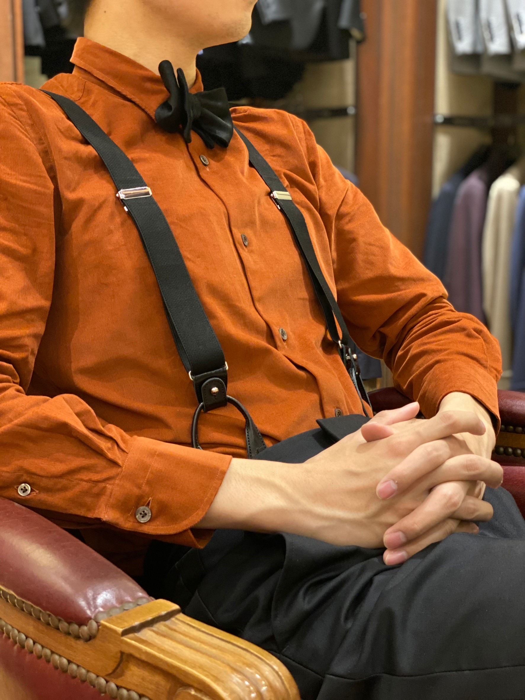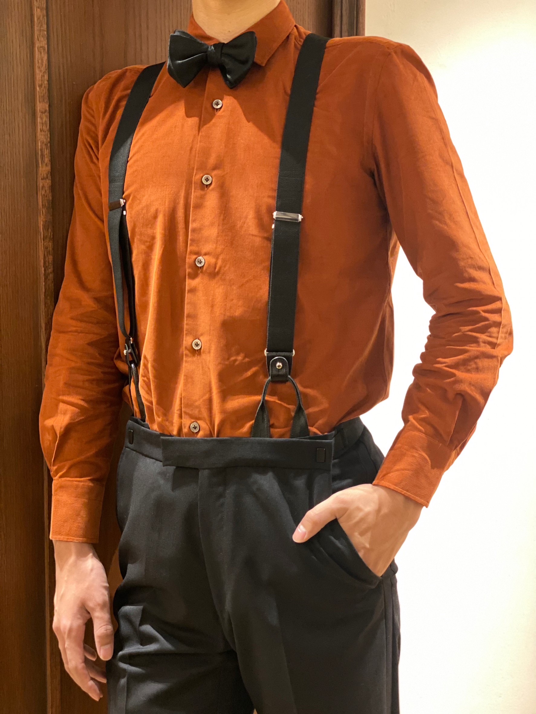 ガーデンやレストラン、緑豊かな披露宴会場など、開放感のある空間で行うカジュアルなパーティーにはシャツスタイルでのお色直しもおすすめです。シャツ、サスペンダー、タイが主役になるこちらのコーディネーションでは、カラードレスや装花との色合わせをダイレクトに行うことができるため、結婚式のコンセプトに合わせて均整のとれたトータルコーディネートが可能です。ただし、アイテム数が少なくシンプルになりがちなコーディネーションの為、素材や色味の合わせ方には注意が必要です。今回は存在感のあるオレンジのシャツを主役に、タイとサスペンダーはあえてブラックを残して調和を図り、シャツの素材には畝の細いコーデュロイを選ぶことでさりげない遊び心を感じさせています。横に並ぶカラードレスのお色味には、ネイビーやグリーンといったオレンジとは対になる寒色系を合わせることでお二人のコントラストが印象付けられることでしょう。