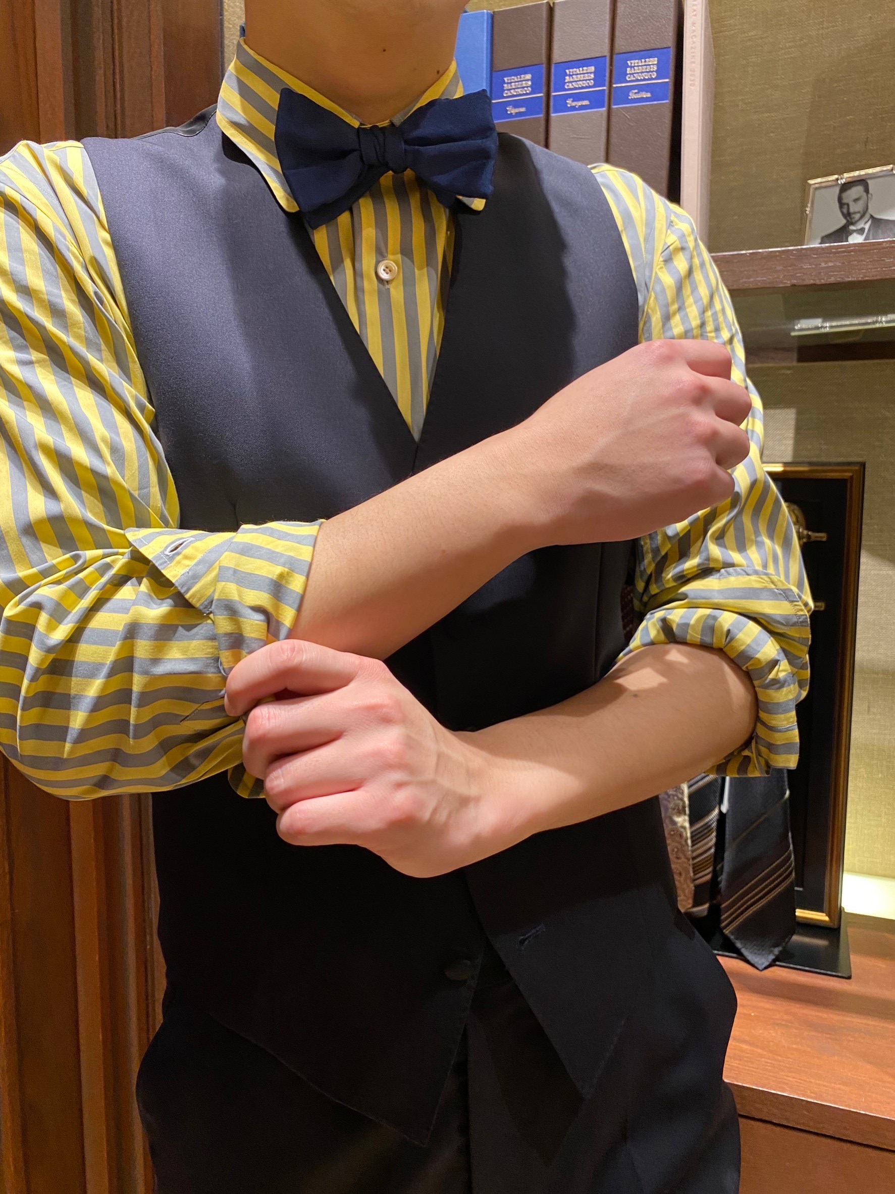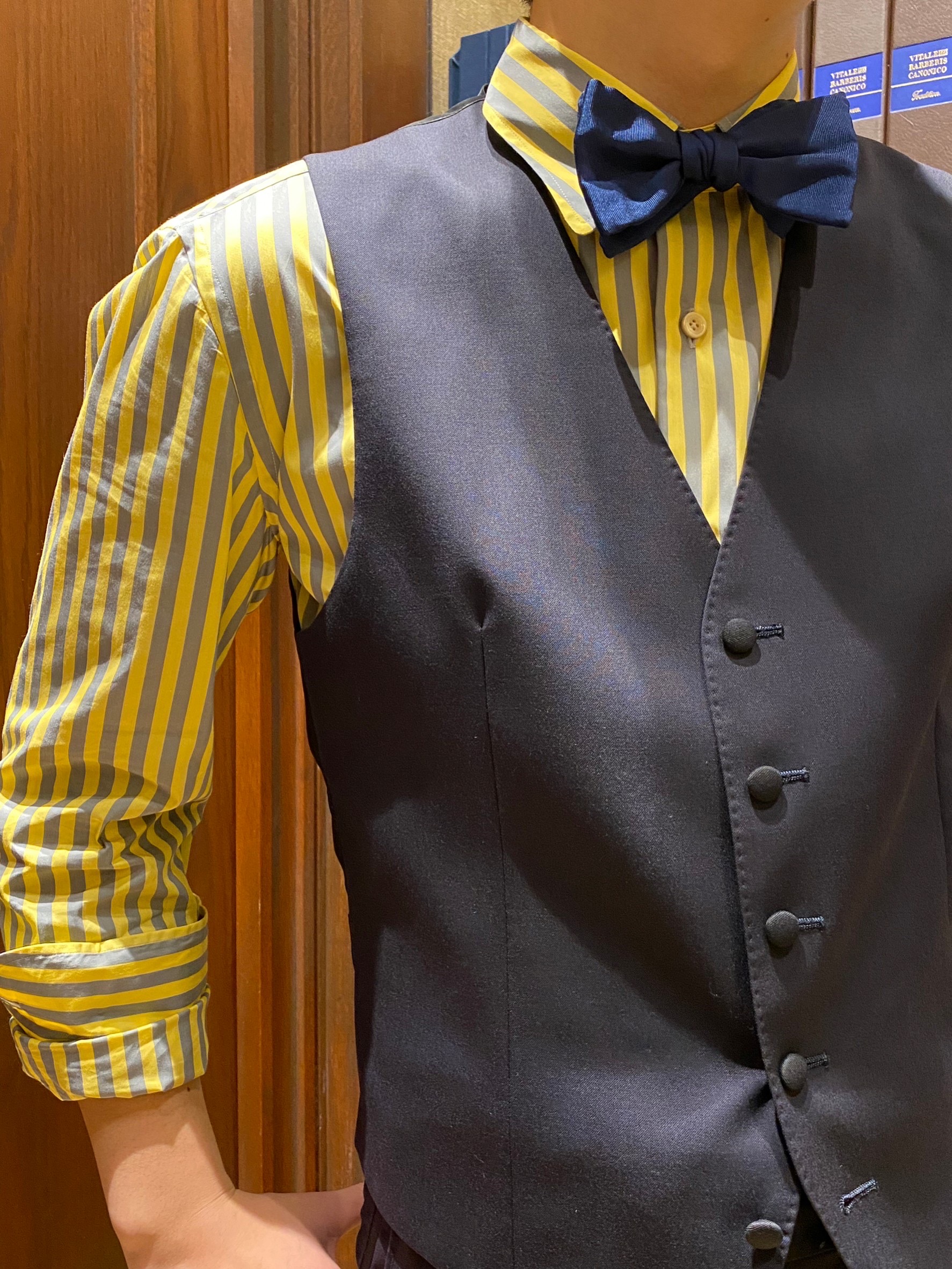 続いて、ジャケットを着用しないベストスタイルのお色直しをご紹介いたします。ベストスタイルのお色直しは、ジャケットを着用するスタイルに比べて印象の変化が大きく、1着目のスタイルから程よく着崩しができることが特徴です。また、シャツをチェンジすることでカジュアルで親しみやすい印象を与え、気兼ねなくご歓談を楽しんでいただけるアットホームな雰囲気を演出してくれるでしょう。こちらのコーディネーションでは、エレガントなネイビータキシードにイエロー×グレーのストライプシャツを合わせることで、肩ひじ張らないポップな印象に仕上げています。柄のあるシャツや鮮やかなカラーのシャツを合わせる際は、シンプルな色味のタイをお選びいただくことがお勧めです。今回は落ち着いたブルーの蝶ネクタイを合わせることでお首元の最低限の緊張感を担保し、コーディネーションの全体感を引き締めまとまりを感じさせています。