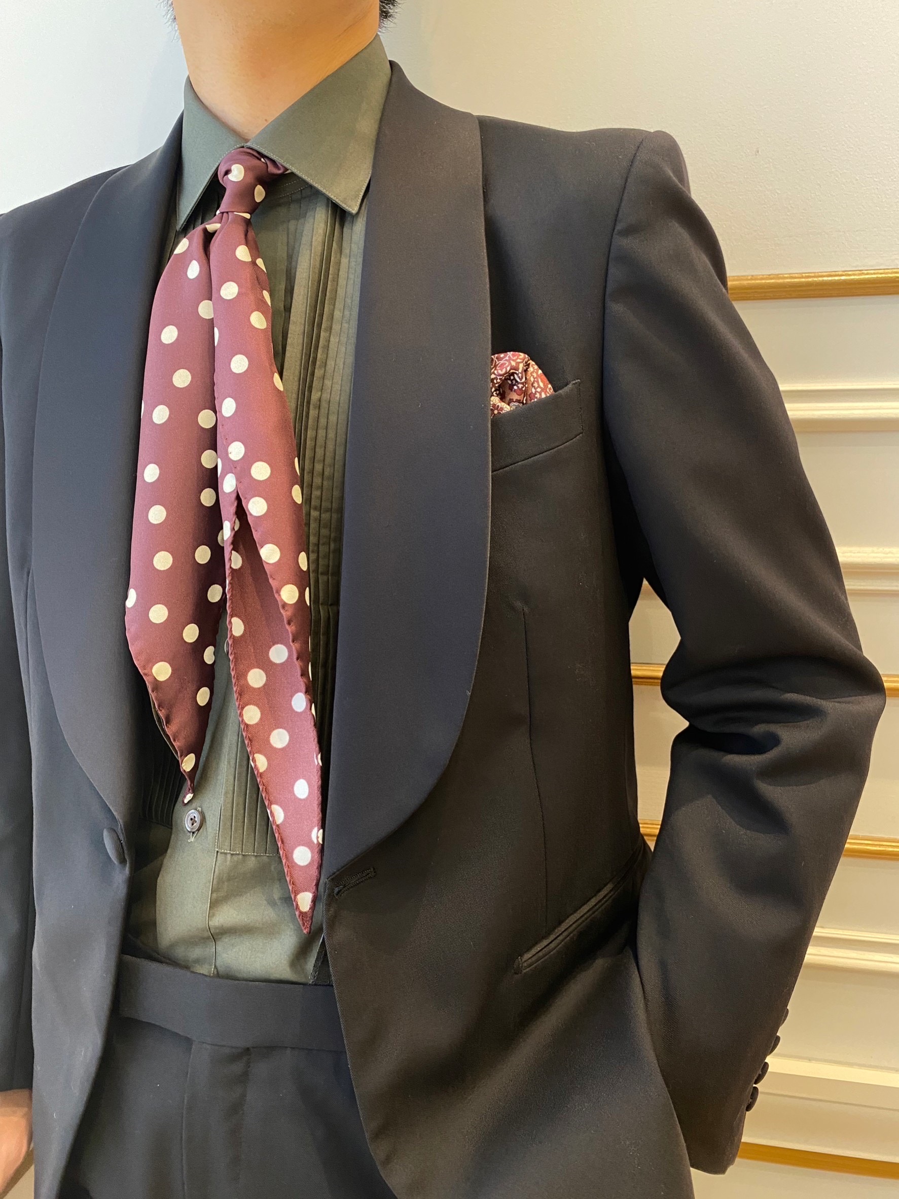 まずは、挙式でクラシカルなタキシードをお召しになられたご新郎様におすすめなお色直しスタイルをご紹介させていただきます。重厚感のあるブラックタキシードに彩り豊かなお小物を合わせることで、オーセンティックなな面持ちの中に遊び心のあるお洒落な印象をプラスすることができます。ブラックやネイビーといったクラシカルなタキシードのお色味はカラーコーディネーションの幅が広く、様々なお色味を取り入れやすいことが特徴です。ご新婦様がお選びになられたカラードレスに合わせてお小物をお選びいただくと、さりげない色合わせでお二人の統一感を演出してくれることでしょう。こちらのコーディネーションでは、秋らしいカーキのシャツに目を引くボルドーのスカーフをネクタイ巻きで合わせ、男性らしいラギッドな雰囲気に仕上げています。チーフにはテラコッタ調のブラウンチーフを差し込み、単調過ぎない重層的な色合わせでお胸周りに奥行きを与えています。シャツのプリーツ仕様やスカーフのドット柄がほのかなエレガンスも感じさせ、無骨になりすぎずコーディネーションの全体的なバランスを保ってくれています。