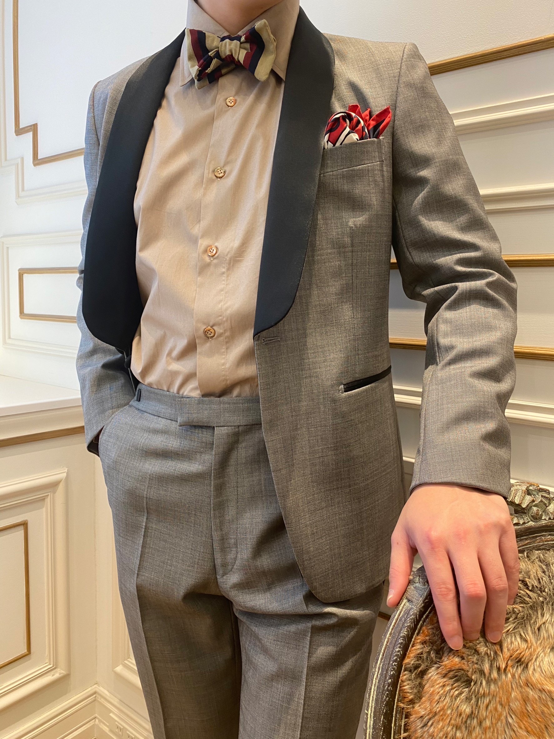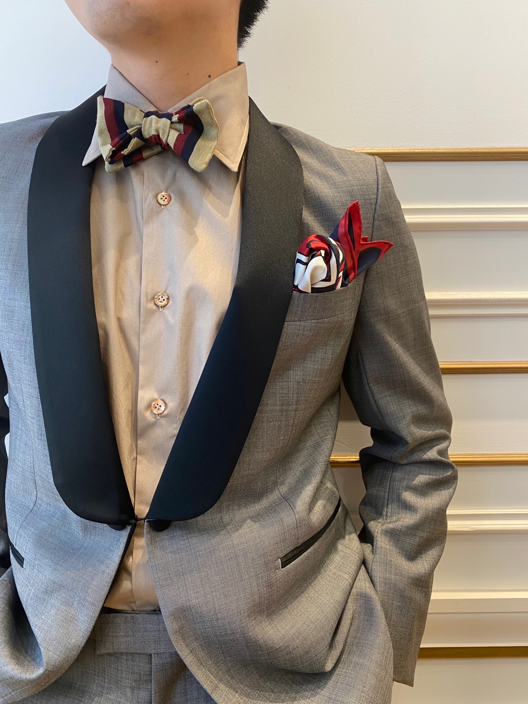 最後に、ウェア・お小物すべてをチェンジしたお色直しのスタイルをご紹介します。1着目は厳粛な雰囲気を演出する正統なタキシードをお召しになり、ゲストの皆様にクラシカルな印象を与えたまま中座をとっていただいたのち、お衣裳一式を変更したスタイルで再入場した際には披露宴会場は歓声とカメラのシャッター音に包まれるに違いありません。フォーマルとカジュアルの違い、セレモニーとパーティーの違いを正しく理解したご新郎様の合理的な着こなしは、男性としての理知とダンディズムを表します。結婚式としても挙式と披露宴にメリハリがつき、ゲストの皆様を飽きさせない極上の時間をお過ごしいただくことができることでしょう。今回は上品なグレーのウェアをチョイスし、柄の入ったタイとチーフを合わせてバランスをとっています。シャツにはベージュカラーを馴染ませることで、一つ一つのお小物が際立つ整合性のあるコーディネーションに。「結婚式の主役は新婦様だから」とお色直しをされないご新郎様もいらっしゃいますが、せっかくの結婚式ですので、お二人ともにご自身らしいお色直しのコーディネーションを楽しまれてはいかがでしょうか?ご新郎様も立派な主役の一人であることに違いはなく、寧ろご新郎様のスタイルによってご新婦様の晴れ姿がより素敵で感動的なものへと昇華するのです!