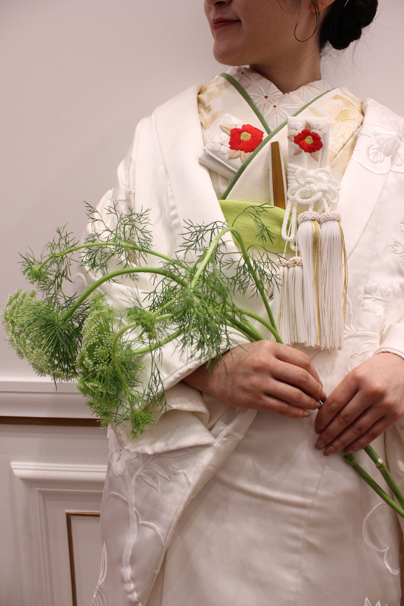 半衿とお胸元の筥迫・懐剣・扇子に描かれた気品溢れる美しい鶴は、今にも羽ばたきそうな躍動感があり花嫁の力強さと凛とした上品さを表現します。また、ブーケは春の訪れを感じさせる陽だまりのように温かな黄色をセレクトし、柔らかさをプラスして。赤ふきの白無垢の純白さとモダンさを掛け合わせた新鮮なコーディネートは、和モダンな雰囲気が魅力的なザ カワブン ナゴヤの会場にもぴったりです。