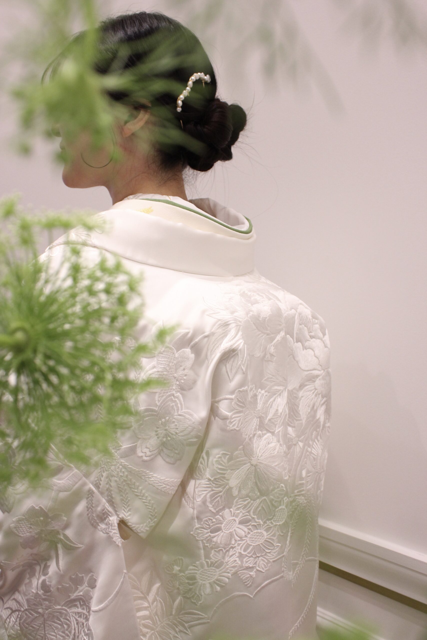 白百合のように純粋に白く輝き、絹糸本来の光沢感が美しい白無垢。春を告げる梅、長寿をあわわす瑞鳥の鶴、百花の王である牡丹、延命長寿をあらわす菊などさまざまな吉祥文様が贅沢に描かれ、幸福感があり晴れ日を彩る一着。春の訪れを感じるこちらの白無垢に優しい彩りのお小物を合わせたコーディネートをご紹介いたします。白無垢の中にお召しいただく掛下には、ザ トリート ドレッシングがオリジナルで作成した柔らかな淡黄色のものをセレクトし、より優美でしなやかな佇まいを表現します。平安時代の襲かさねの色目の名でもある「若草色」の重衿や帯揚げは早春に若草が萌え出た野原のように爽やかで、花嫁の可憐さをより際立たせるのです。髪飾りには、ゴールドと光沢感のあるパールのアクセサリーを合わせナチュラルさをプラスします。名古屋店の提携会場であるザ ナンザン ハウスで美しい緑を体で感じながら、自然の美しさと花嫁の芯の美しさ掛け合わせたコーディネートでゲストの方とありのままにお過ごしいただくのはいかがでしょうか。