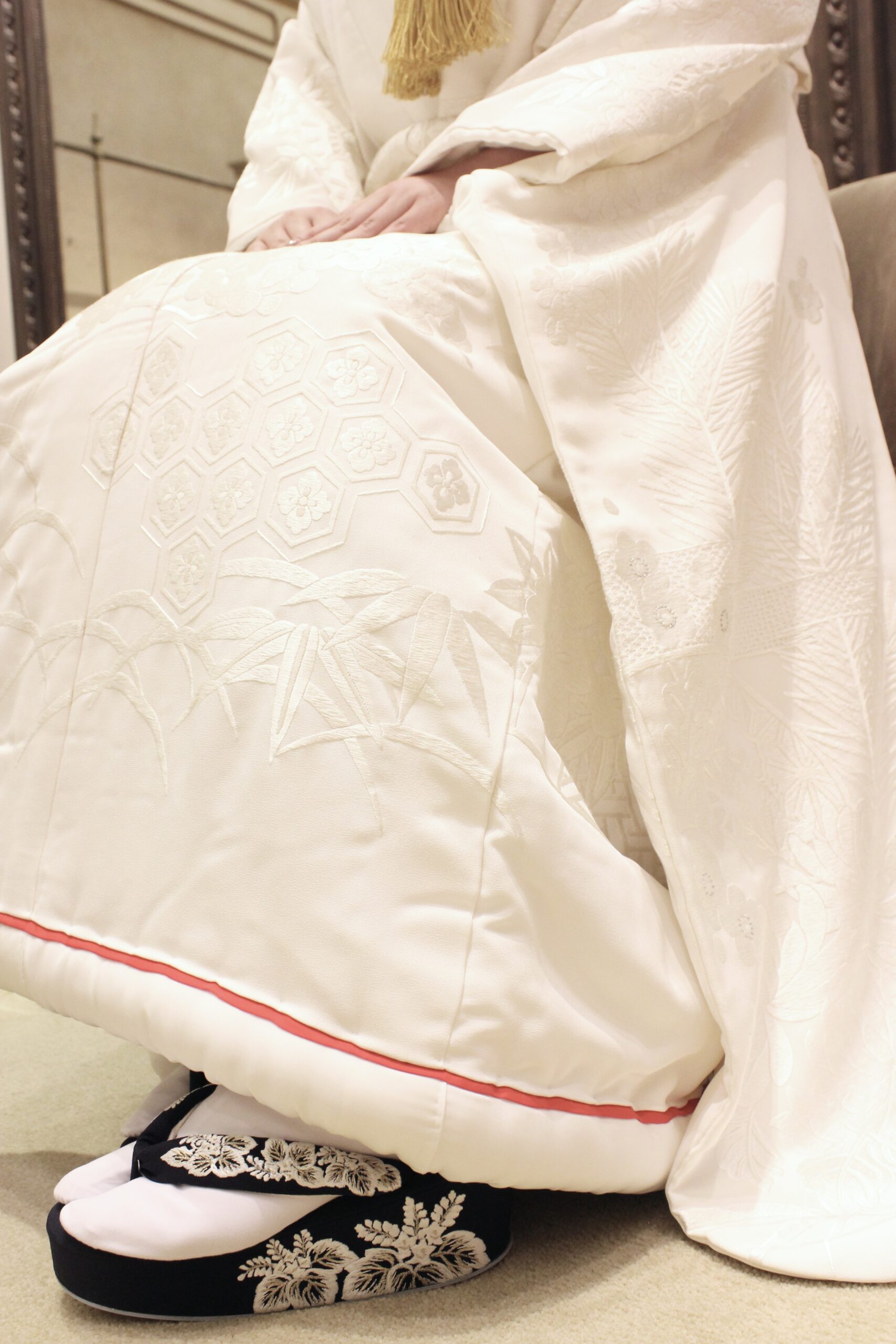 白無垢は、白一色で仕立てられたお色目が代表的ではありますが、裾に赤いラインが入った“赤ふき”の白無垢も格式高く、古来より沢山の花嫁に愛されてきました。赤ふきの赤色には、「生命力」「災いを防ぐ」という意味合いがあり、おめでたい色として最良の日に相応しい色です。また、紅白のコントラストが出て、艶やかな印象でお過ごしいただけます。