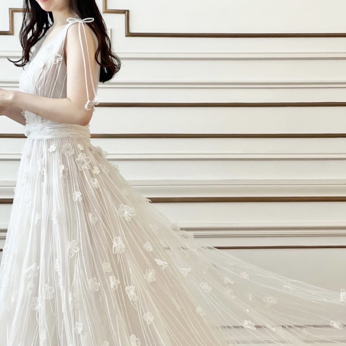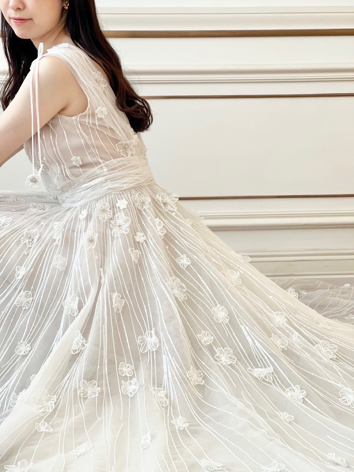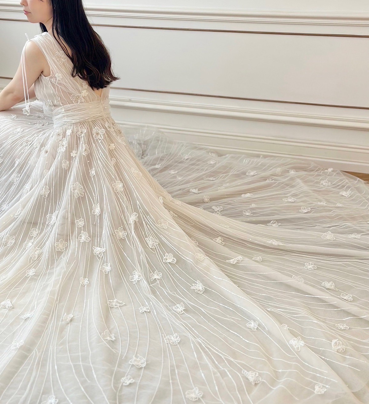 キラキラとしたビジューと刺繍が美しいリズマルチネスの新作ウェディングドレスをトリートドレッシング名古屋店よりご紹介いたします 透明感のある3Dフラワー刺繍の美しい名古屋や東海エリアのおしゃれ花嫁様におすすめのトリートドレッシングの新作ウェディングドレスをご紹介いたします トレンドのオーガンジーの3Dフラワーモチーフが美しい名古屋のガーデン挙式におすすめのトリートドレッシングの新作ウェディングドレス