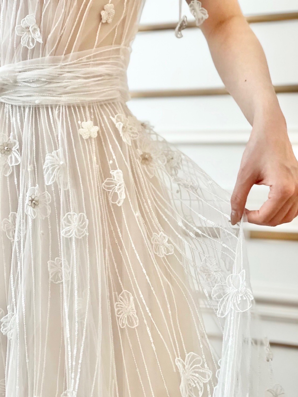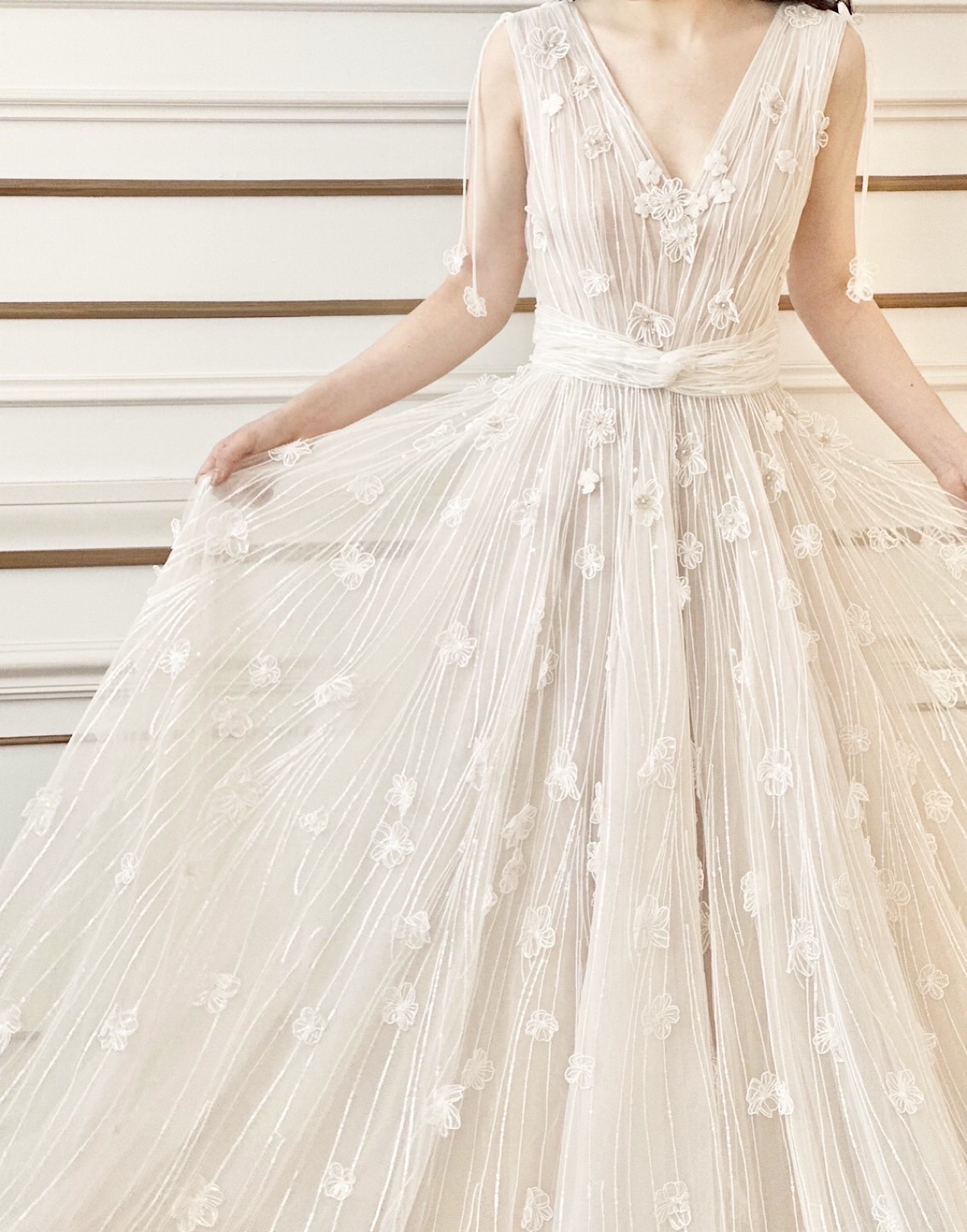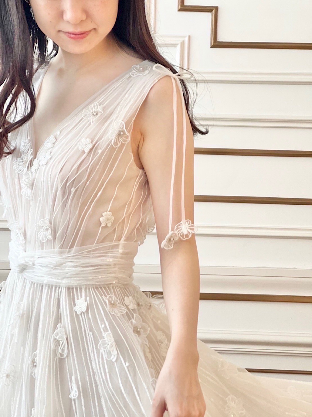 キラキラとしたビジューと刺繍が美しいリズマルチネスの新作ウェディングドレスをトリートドレッシング名古屋店よりご紹介いたします 透明感のある3Dフラワー刺繍の美しい名古屋や東海エリアのおしゃれ花嫁様におすすめのトリートドレッシングの新作ウェディングドレスをご紹介いたします トレンドのオーガンジーの3Dフラワーモチーフが美しい名古屋のガーデン挙式におすすめのトリートドレッシングの新作ウェディングドレス