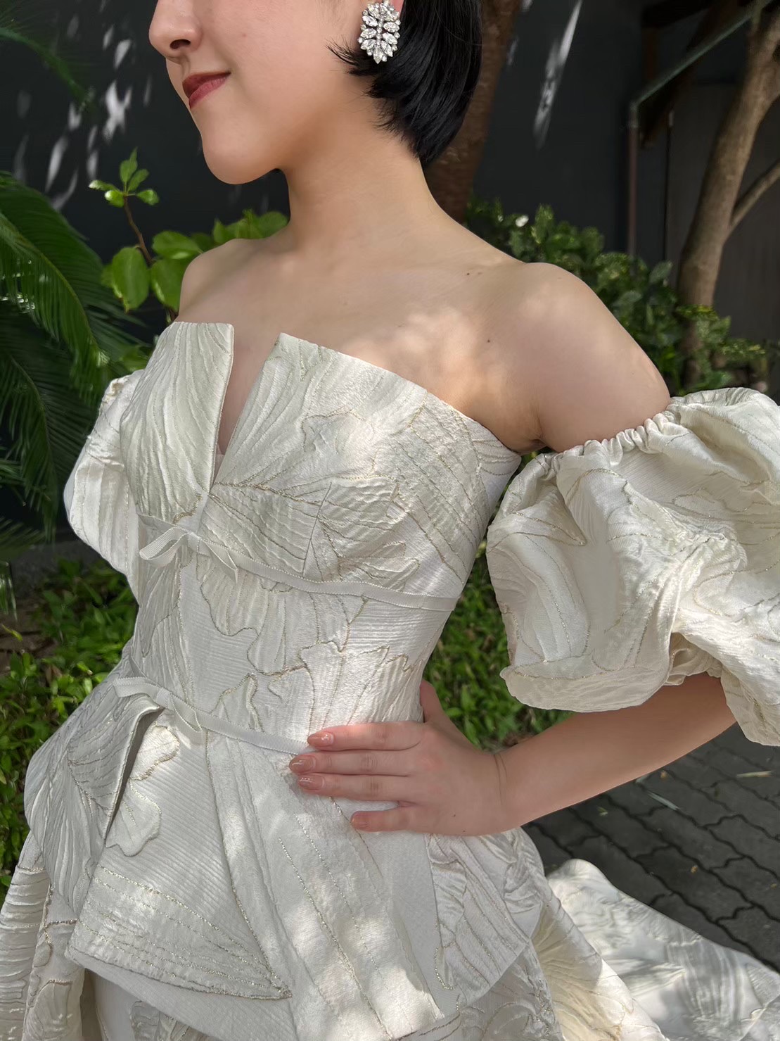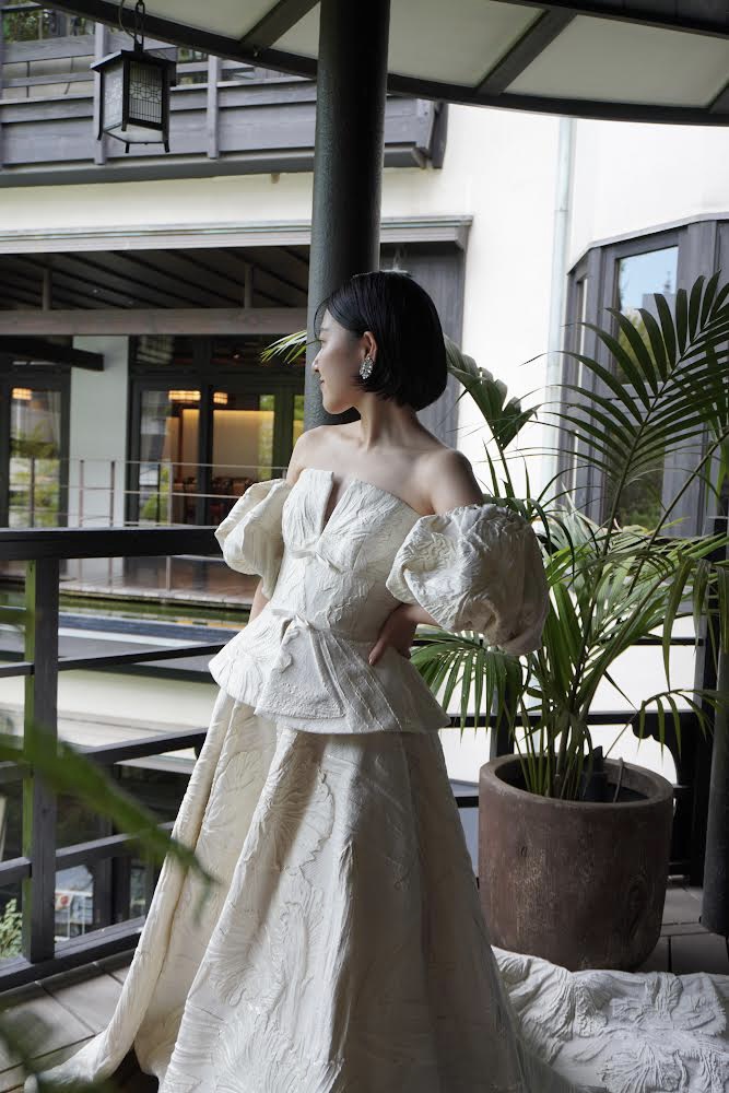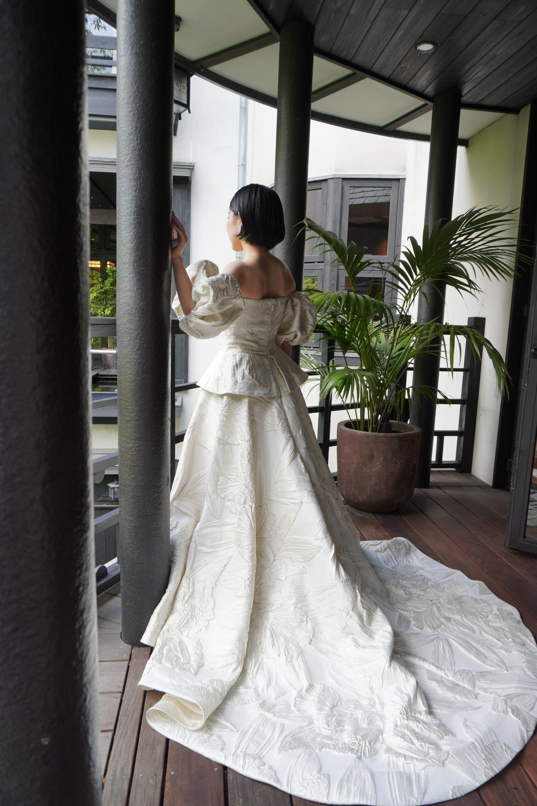 全体に金糸を織り込みながら仕立てられたジャガード生地は上質な素材を使用しているからこそ、その重厚感や華やかさに思わずため息が出る1着です。鮮やかな自然の緑と、開放的な窓からたっぷりと射し込む太陽の光を浴びた時には花嫁を幻想的に魅せてくれ、また日の暮れた落ち着いたムードあるライトに照らされた際にはモードで大人な印象に。お召しになる空気感によって、まったく異なる表情を見せてくれるのもこのウェディングドレスの魅力です。女性の曲線美を最大限に引き出す一連のシルエットはアートの様な美しさ。エフォートレスでエキゾチックなデザインに加え、ペプラムのしなやかなカッティングが胸元のリボンを華奢に見せ、花嫁の愛らしさを感じさせます。上質でありながらもリラックス感のある、ザ カワブン ナゴヤのように自然な緑が広がる開放的な披露宴会場や、あたたかみのあるアットホームなパーティーにもおすすめです。