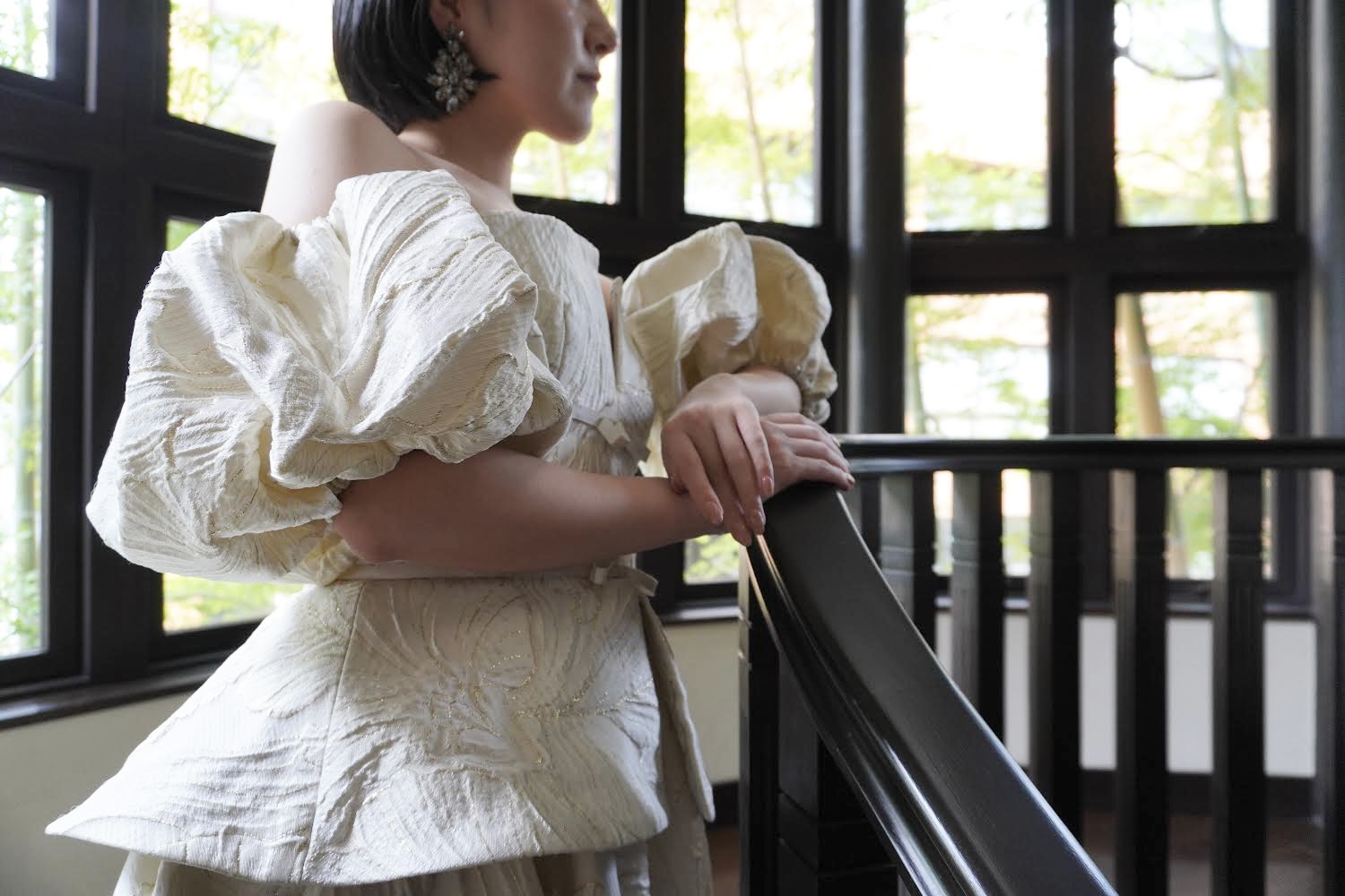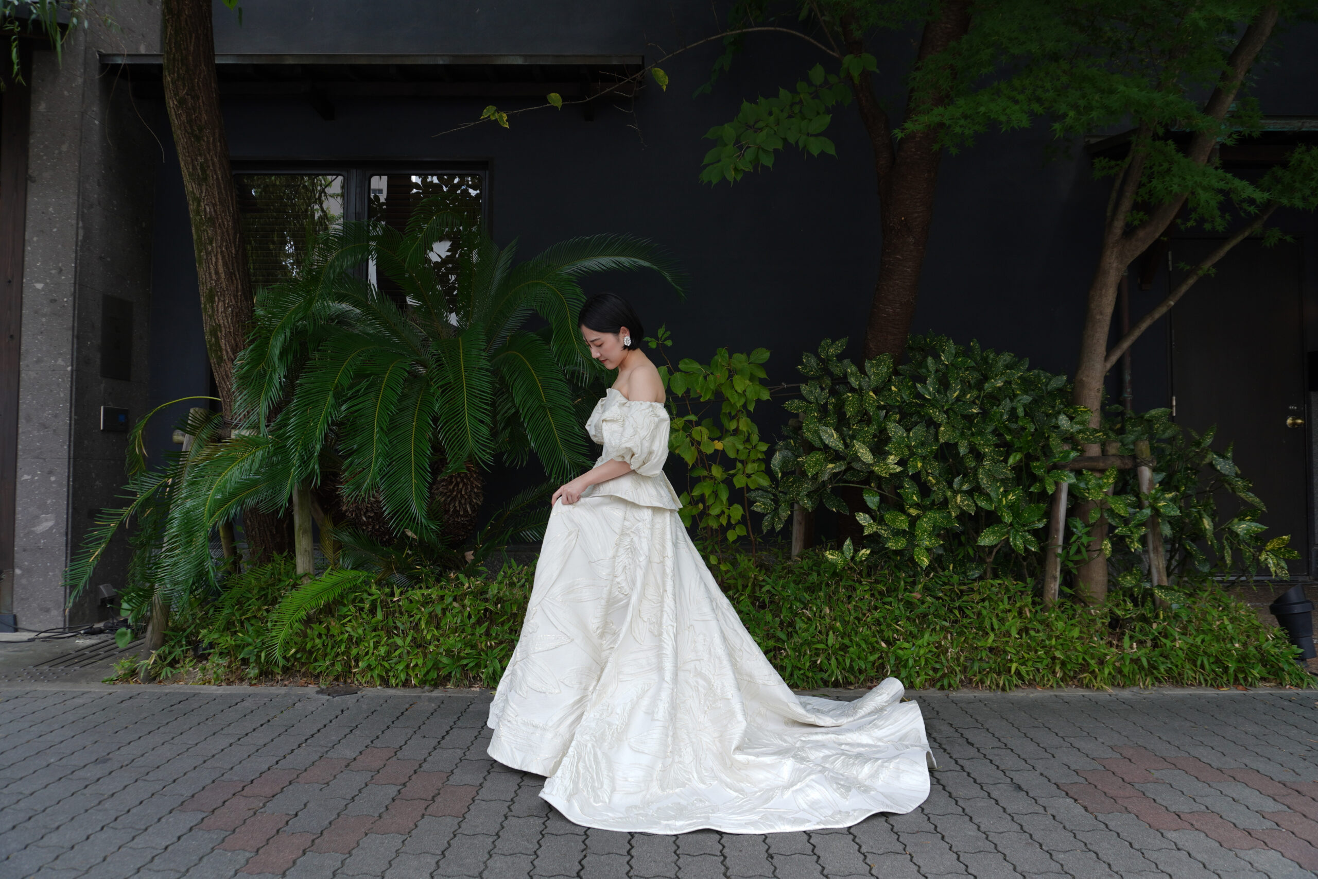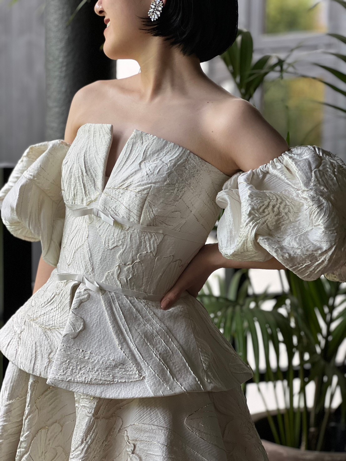 全体に金糸を織り込みながら仕立てられたジャガード生地は上質な素材を使用しているからこそ、その重厚感や華やかさに思わずため息が出る1着です。鮮やかな自然の緑と、開放的な窓からたっぷりと射し込む太陽の光を浴びた時には花嫁を幻想的に魅せてくれ、また日の暮れた落ち着いたムードあるライトに照らされた際にはモードで大人な印象に。お召しになる空気感によって、まったく異なる表情を見せてくれるのもこのウェディングドレスの魅力です。女性の曲線美を最大限に引き出す一連のシルエットはアートの様な美しさ。エフォートレスでエキゾチックなデザインに加え、ペプラムのしなやかなカッティングが胸元のリボンを華奢に見せ、花嫁の愛らしさを感じさせます。上質でありながらもリラックス感のある、ザ カワブン ナゴヤのように自然な緑が広がる開放的な披露宴会場や、あたたかみのあるアットホームなパーティーにもおすすめです。