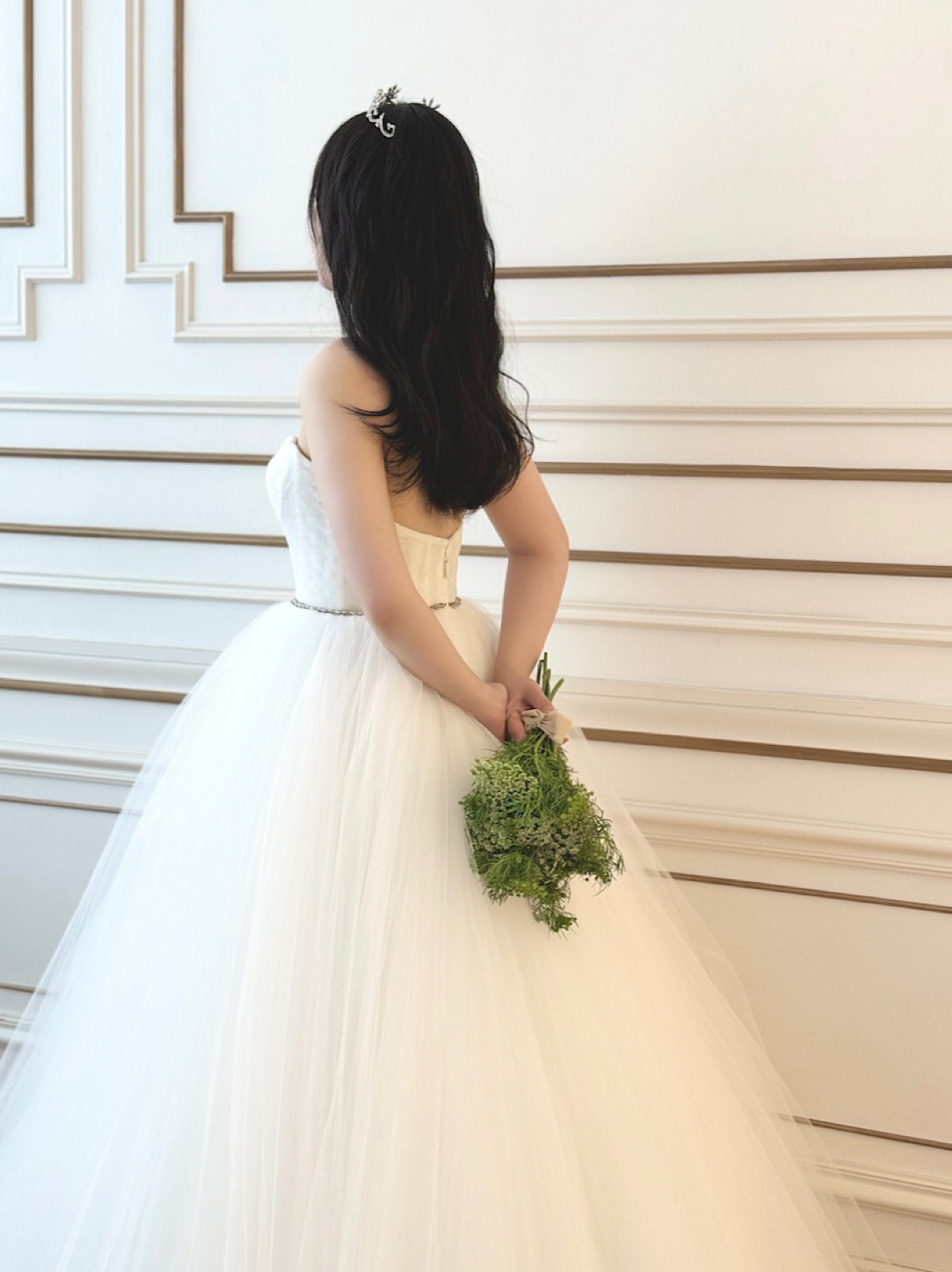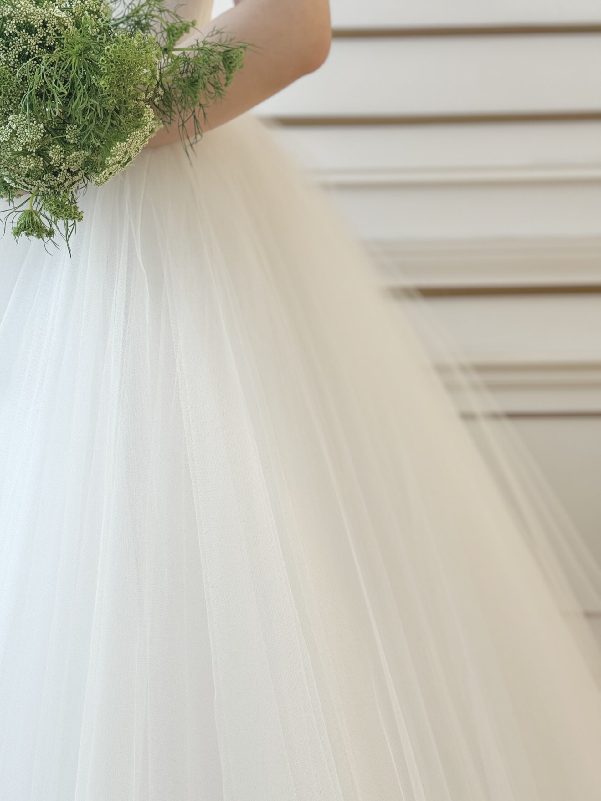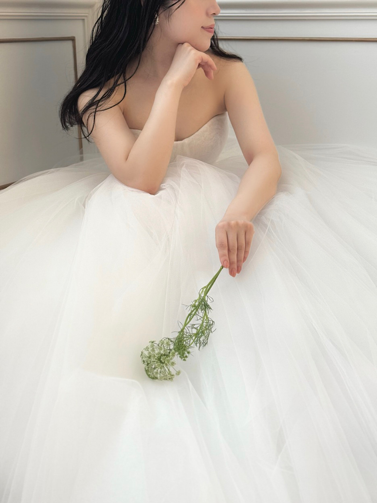 ウエストからふんわりと透明感を持ち合わせながらやさしく広がるシルエットからは、誰もが幼い頃に思い描いた憧れの花嫁像を連想させるのではないでしょうか。人生の中において主役になる特別な1日、結婚式。夢見たボリューミーなシルエットは花嫁らしいラグジュアリーな佇まいを叶えながらも、胸元にあしらわれた控えめなシャンテリーレースが、少女のように可憐で清楚な印象を与えてくれます。ウエストラインのビジューが上品な輝きを放つことで、甘すぎないロマンティックなスタイルに。何層にも重なるチュール生地のスカートから溢れる透明感は、儚ささえも感じられるほど。ドレスが醸し出す花嫁の本来の美しさには思わずゲストもうっとりと見惚れることでしょう。花嫁にもゲストにも特別感を届けるリーム アクラのウェディングドレスは、時代を超えて愛されるはず。