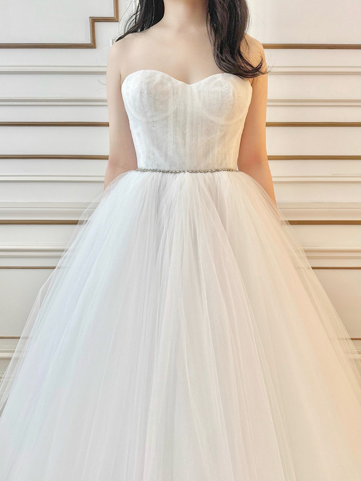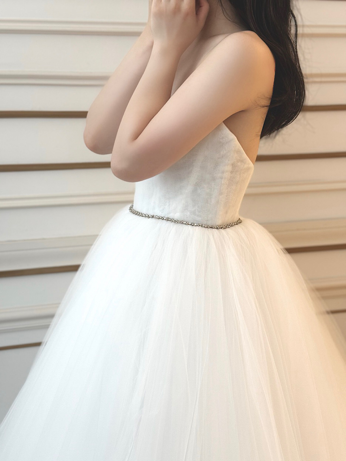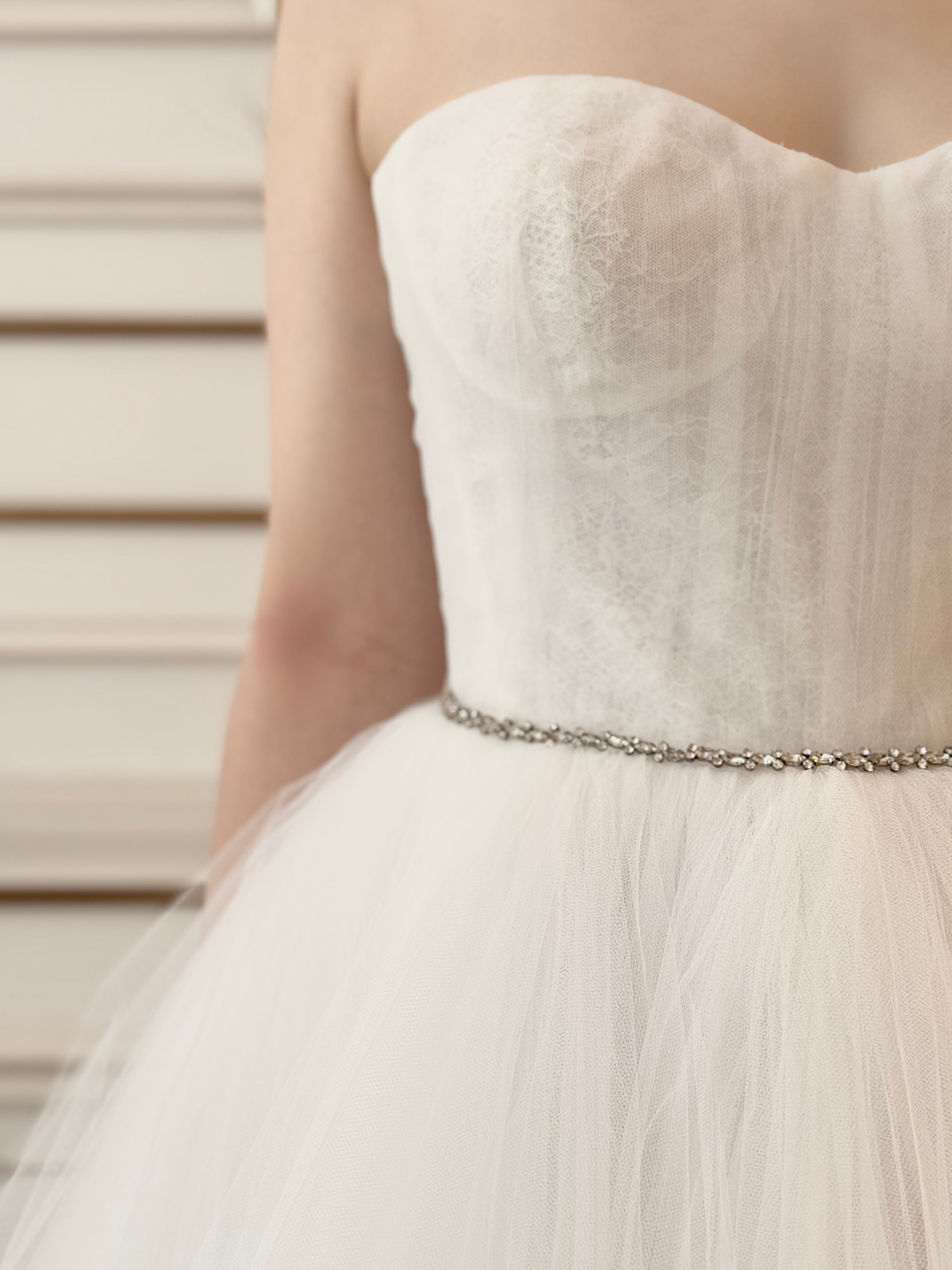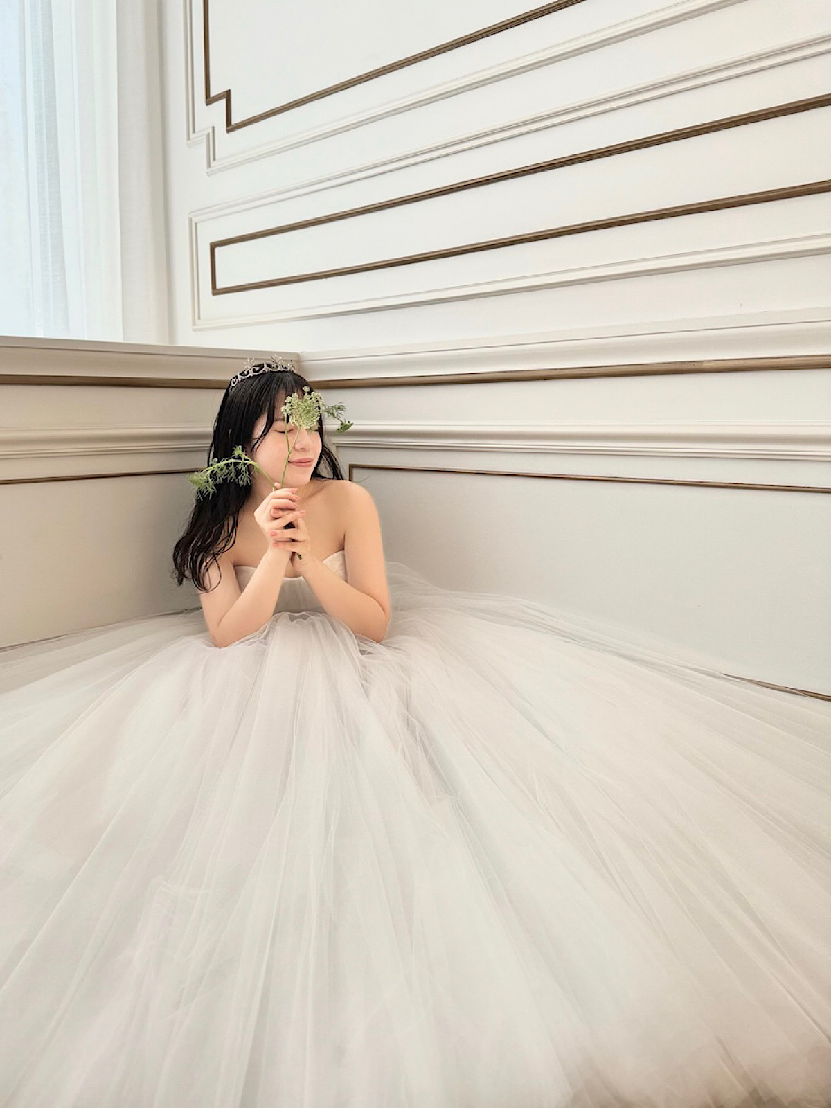 ウエストからふんわりと透明感を持ち合わせながらやさしく広がるシルエットからは、誰もが幼い頃に思い描いた憧れの花嫁像を連想させるのではないでしょうか。人生の中において主役になる特別な1日、結婚式。夢見たボリューミーなシルエットは花嫁らしいラグジュアリーな佇まいを叶えながらも、胸元にあしらわれた控えめなシャンテリーレースが、少女のように可憐で清楚な印象を与えてくれます。ウエストラインのビジューが上品な輝きを放つことで、甘すぎないロマンティックなスタイルに。何層にも重なるチュール生地のスカートから溢れる透明感は、儚ささえも感じられるほど。ドレスが醸し出す花嫁の本来の美しさには思わずゲストもうっとりと見惚れることでしょう。花嫁にもゲストにも特別感を届けるリーム アクラのウェディングドレスは、時代を超えて愛されるはず。