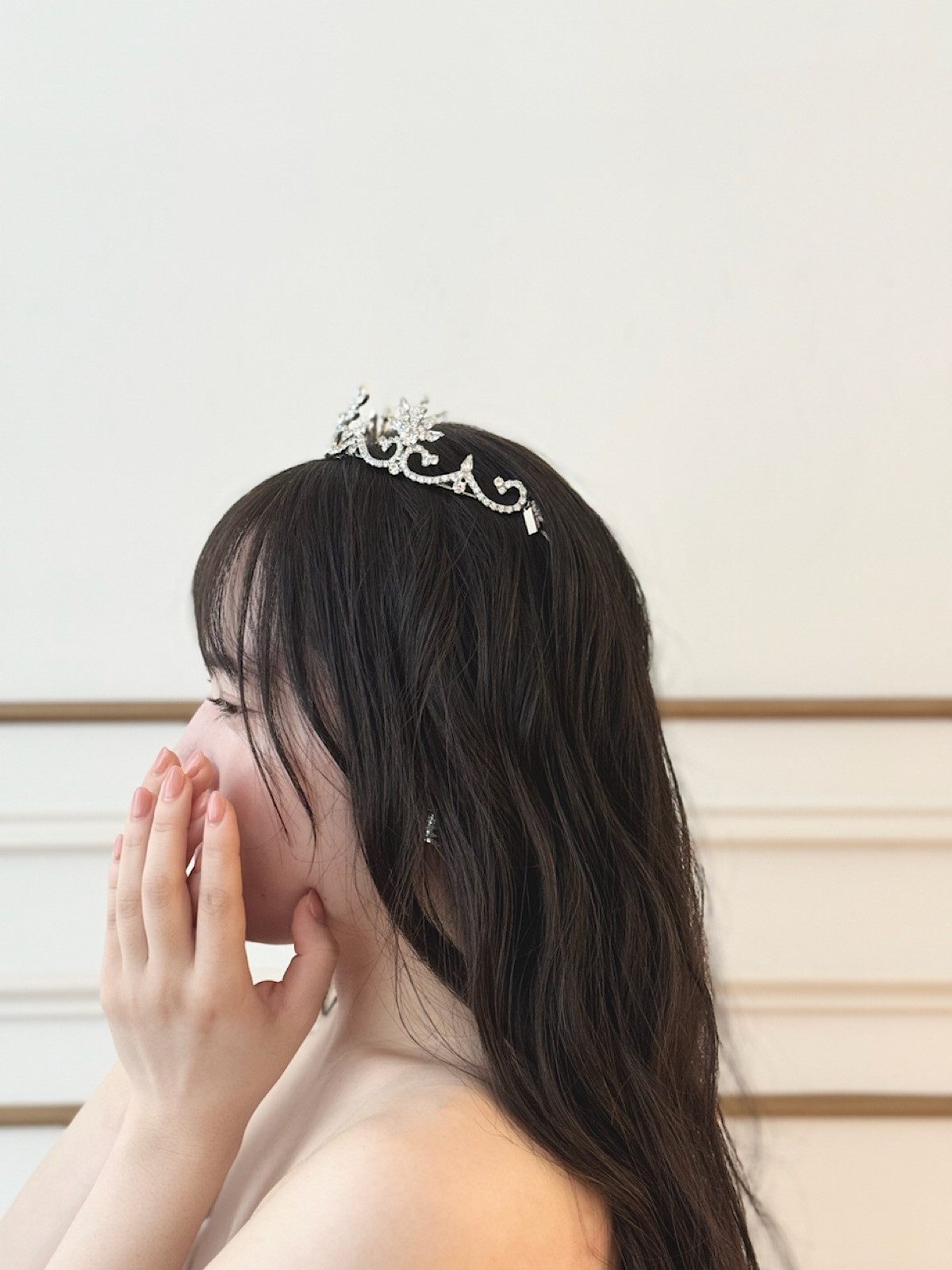 クラシカルでロマンティックなリーム アクラのウェディングドレス。ヘアスタイルはゆるくウェーブをかけたダウンスタイルにし、ドラマティックに演出してみてはいかがでしょうか。エアリーなウェーブヘアはドレスの透明感をより引き立てます。ヘッドアクセサリーにはティアラをセレクトし、コレクションのオールドハリウッドを連想させるようなオーセンティックな佇まいに。背伸びして大人っぽくなりすぎないよう、手元にはレースフラワーをたっぷりと束ねてやさしくリボンを結い、あどけなさの残る可憐で清楚なコーディネートに仕上げるのも素敵ですね。とびきりロマンティックでドラマティックなスタイリングは花嫁を夢見心地な気分にさせてくれ、まるでミューズのように柔らかく女性らしい存在感を約束してくれることでしょう。