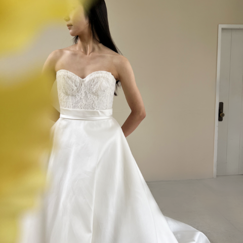 ご新婦様が挙式でお召しになるウェディングドレスとして選ばれたのは、MARK INGRAM for VALENTINI(マーク イングラム フォー ヴァレンティーニ)の一着。デザイナー自身がバイヤーとしてたくさんのドレスを見てきたからこそ、世界中の花嫁のニーズに合ったデザインを手掛け、ニューヨークのトップブランドとされているマーク イングラム フォー ヴァレンティーニ。トレンドに敏感なニューヨークの花嫁が彼のショップでウェディングドレス選びをすることがステータスになりうると言われるほど、今世界中で注目されているブランドです。ご新婦様がこちらのウェディングドレスに出逢われたのは初めてTHE TREAT DRESSING(ザ トリート ドレッシング)にお越しいただいた時でした。ドレスを一目見た時、ご新婦様の瞳がきらきら輝かれていたのを今でも覚えています。上半身に施された繊細なレースが、ご新婦様の透明感溢れる肌にすっと寄り添い愛らしさを感じさせます。スカート部分には最上級のミカドシルクを贅沢に使用し、気品溢れる特別なオーラを演出。背中の大胆なカッティングは、正面から見たクラシカルさとは大きく印象を変え、ファッショナブルな雰囲気を放ちます。笑顔がとても愛らしく、柔らかさの中に気品があるご新婦様にまさにぴったりの一着でした。そして、普段からとても紳士でご新婦様想いなご新郎様。挙式ではクラシックなブラックのタキシードを身に纏い、ご新婦様をエスコートされました。まるで、お二人がお互いを引き立てあうようなクラシックで上品なスタイリングとなりました。