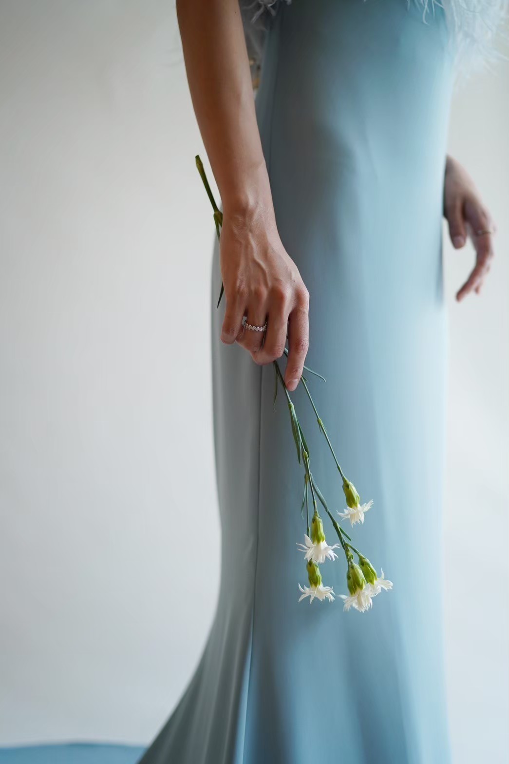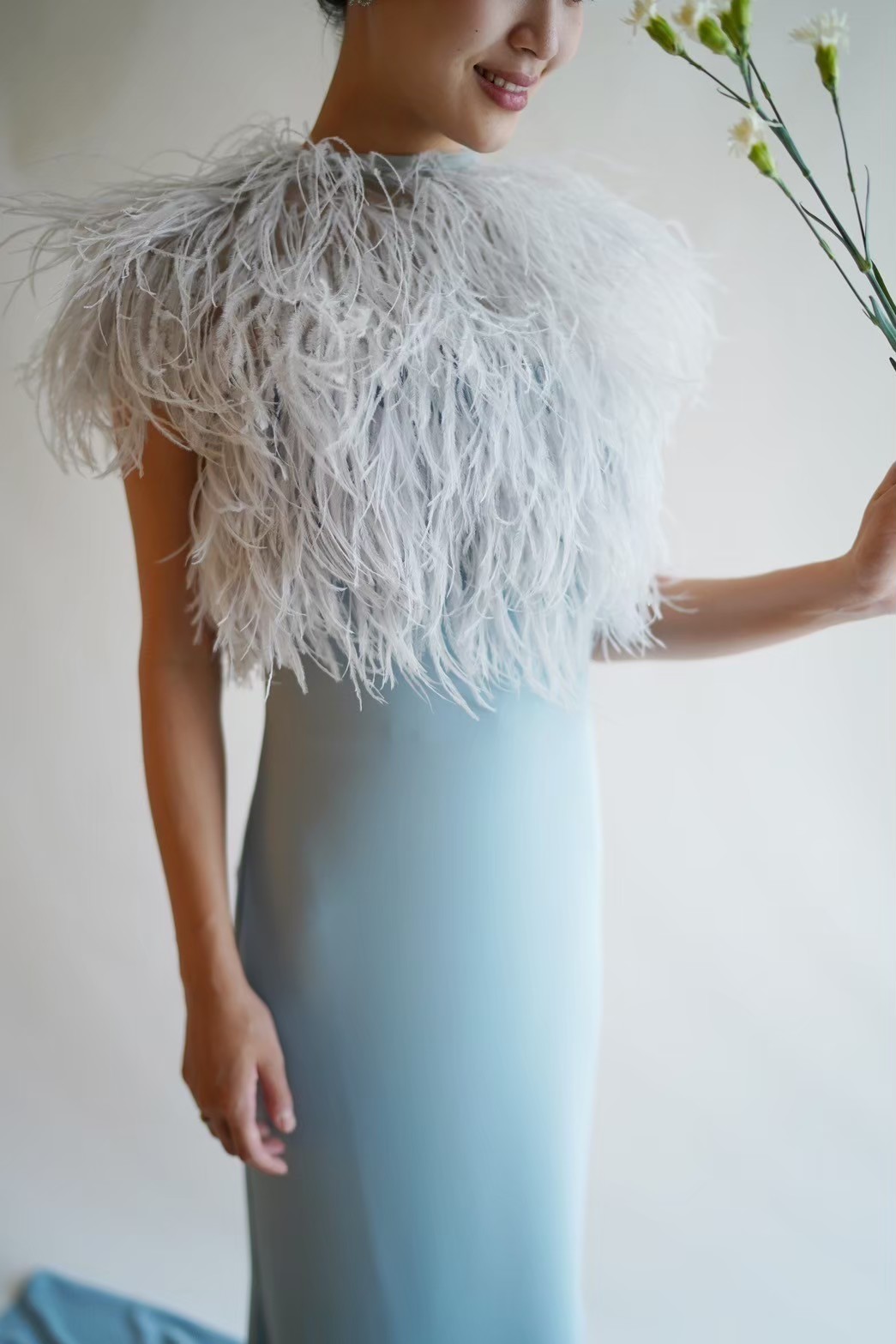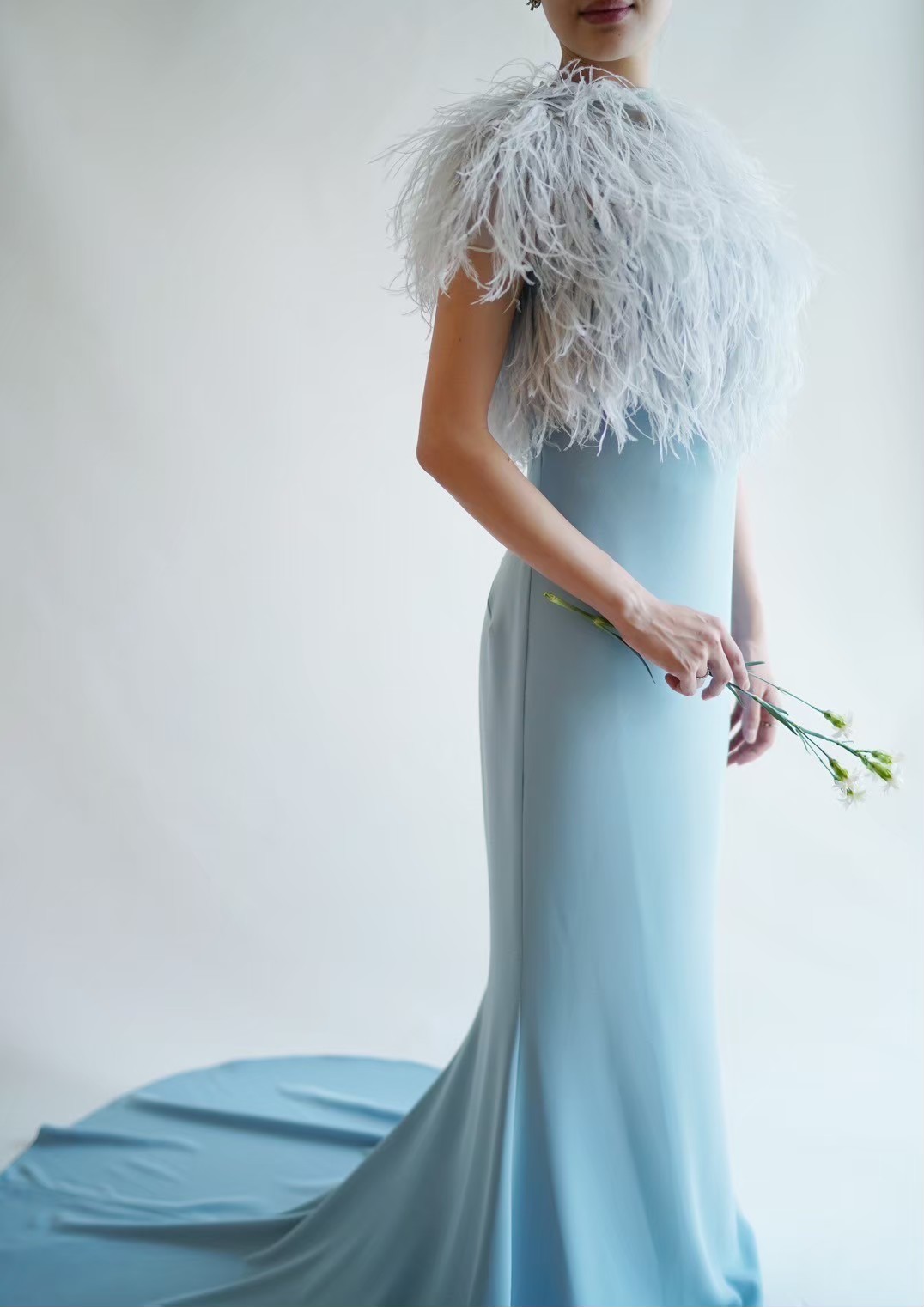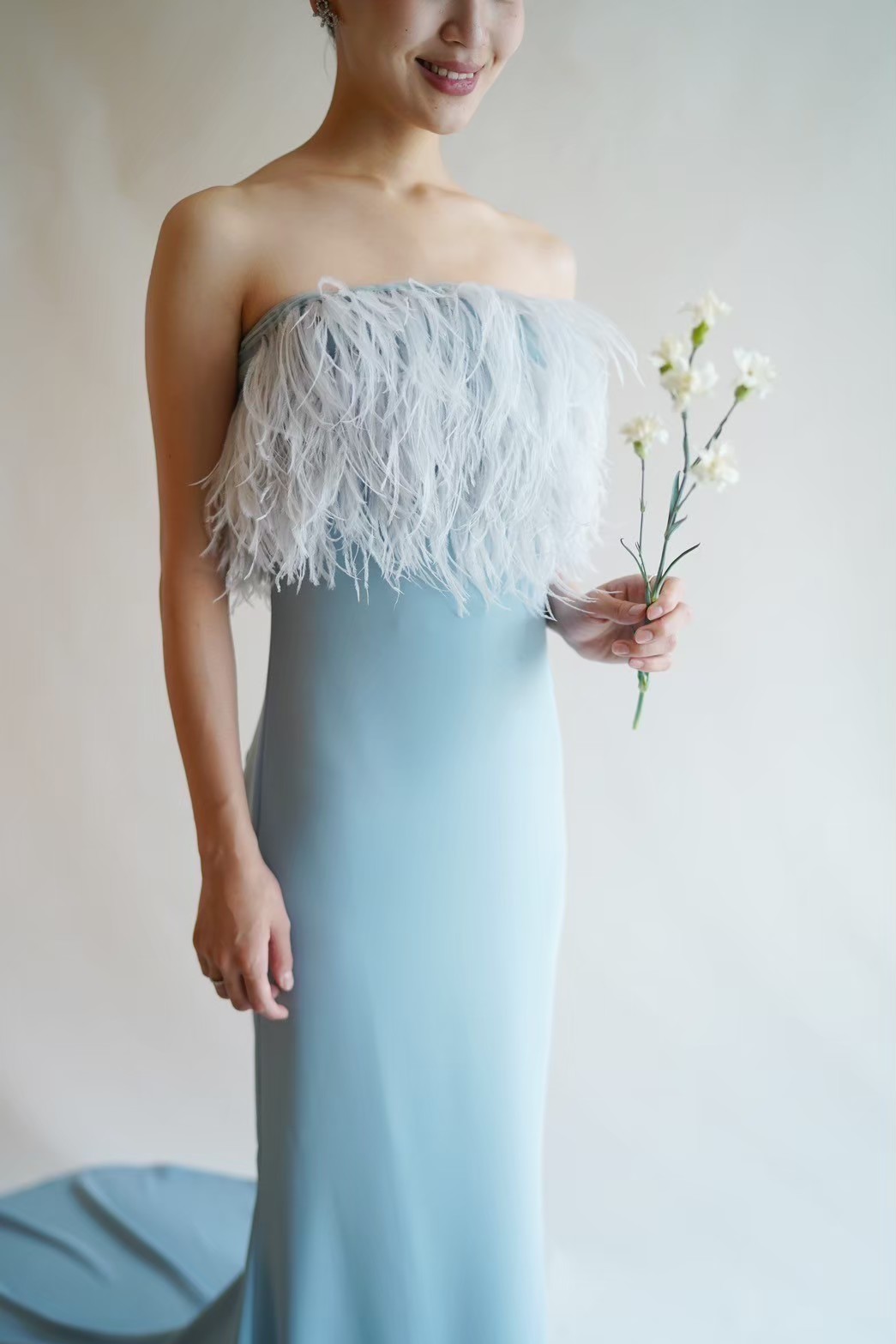 着心地が軽やかでシンプルなマーメイドラインのシルエットは、ゲストとの距離が近いアットホームでリラックスした結婚式をイメージされている花嫁におすすめです。装飾のないシンプルなデザインでありながらも、オーストリッチのフェザーがトレンド感をプラスし、存在感と幸福感を感じさせるのです。上質なフェザーはアイスブルーのカラーに上品に映え、花嫁の動きに合わせて揺れ動き、主役らしい存在感や上品さを表現してくれます。どの角度から見ても美しく計算されたデザインは、これまで多くのドレスを手掛けてきたリーム アクラだからこその業。エフォートレスなデザインだからこそ、スタイリングもシンプルに。ヘアはナチュラルにタイトにまとめリラックス感を演出し、耳元には胸元の立体的なデザインを邪魔しない小ぶりな愛らしいデザインのイヤリングを合わせ、華美すぎず洗練された印象に。お好みでフェザーのボリュームをお選びいただけるからこそ、ご自身らしさを存分に表現していただき、幸福感溢れる大人で上品なブライズスタイルを叶えてみてはいかがでしょうか。