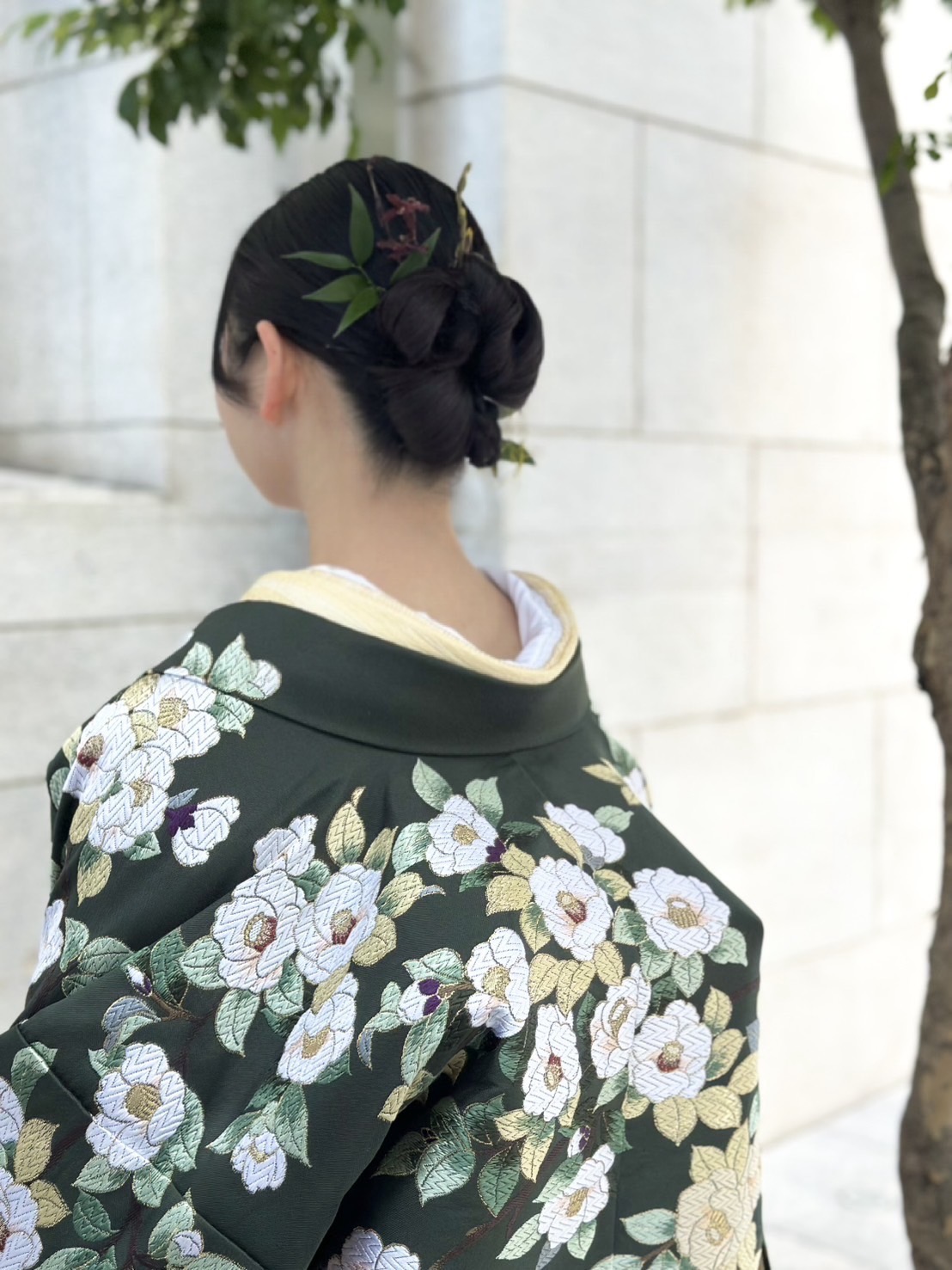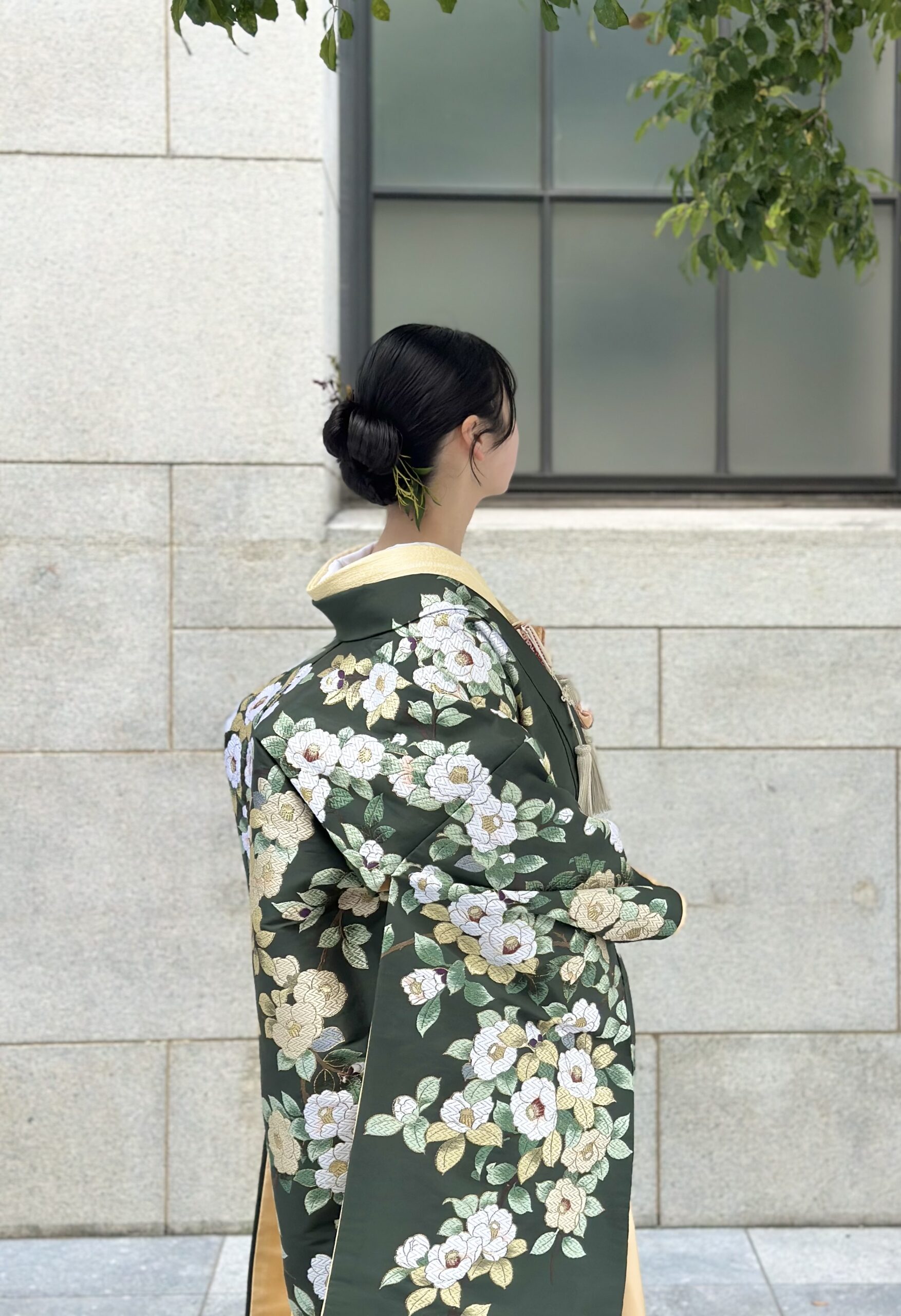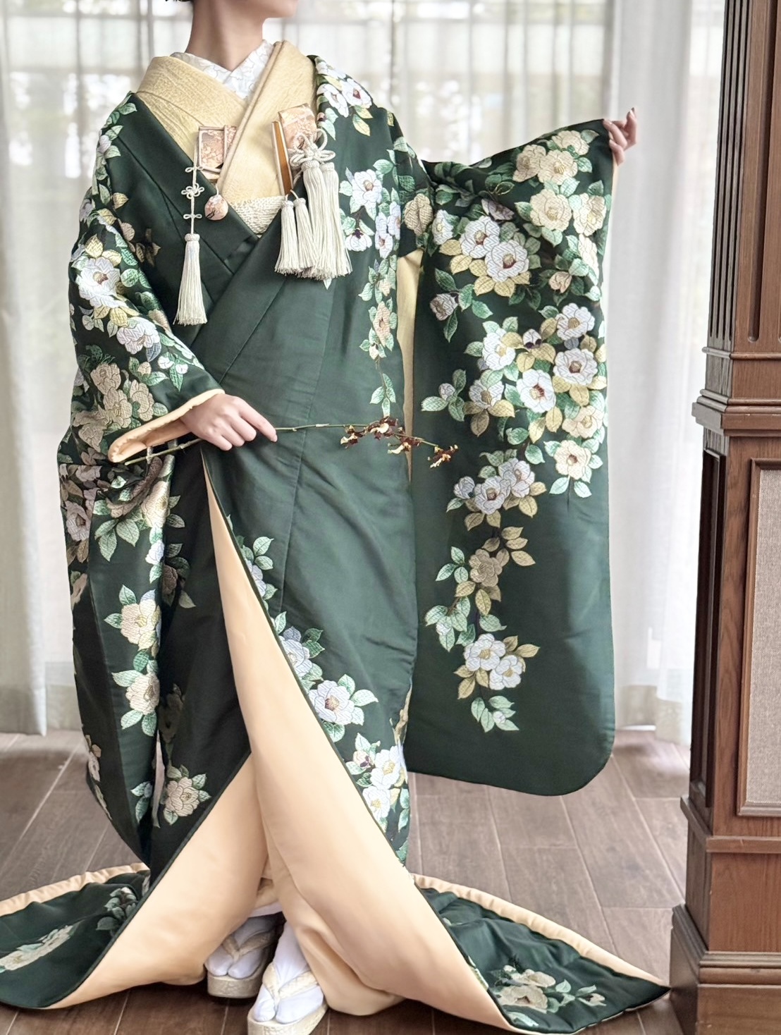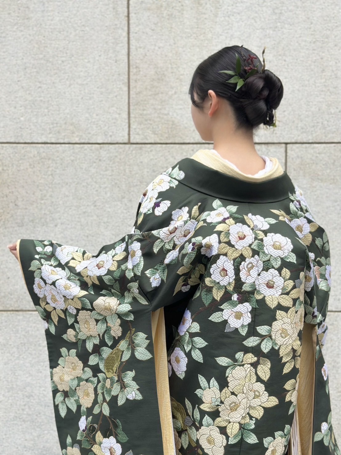 〜白椿が贅沢に施された暗緑色の色打掛〜