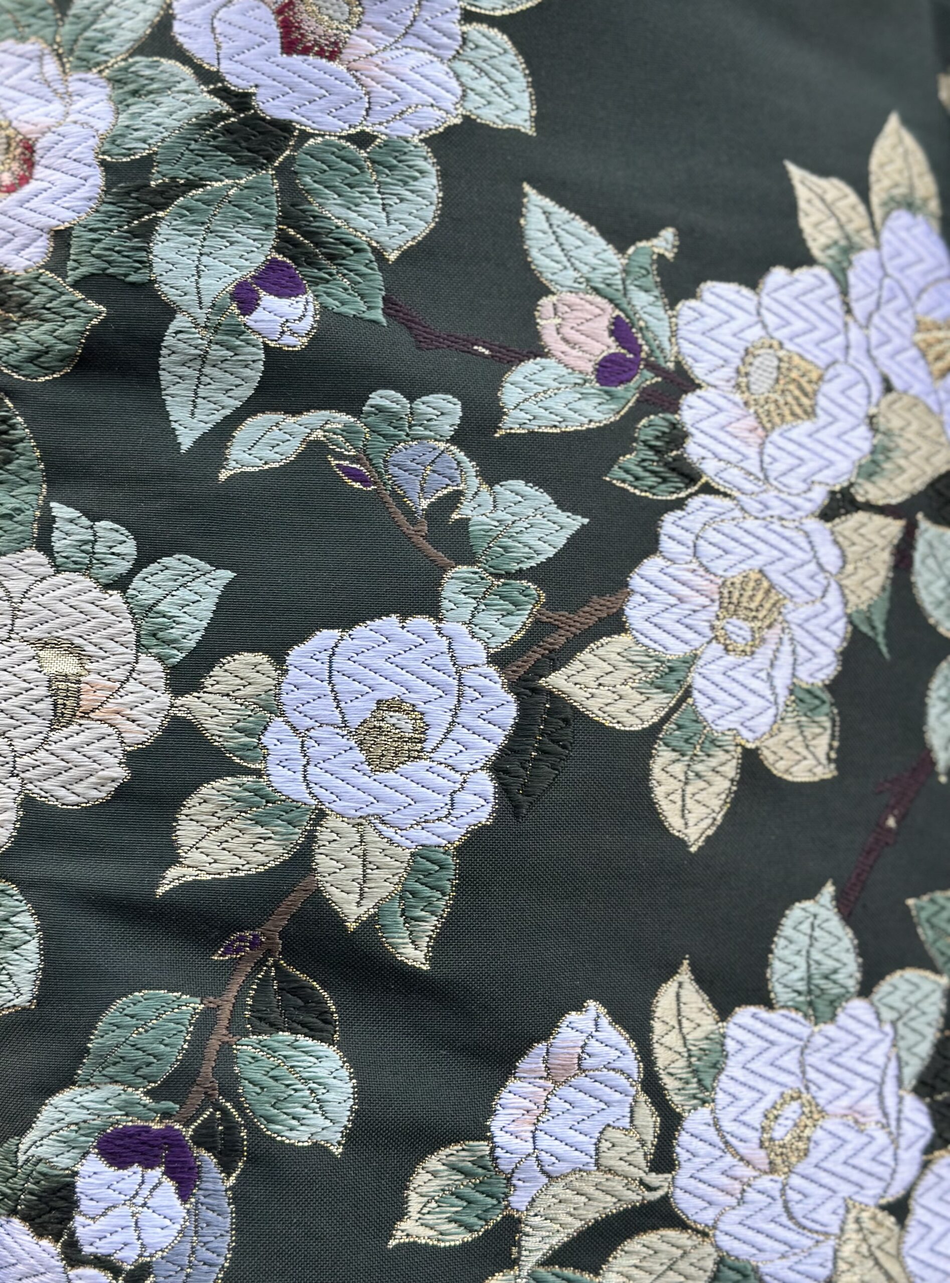 深い森に分け入ったかのような暗緑地に浮かび上がる美しい白椿が贅沢に施された色打掛。