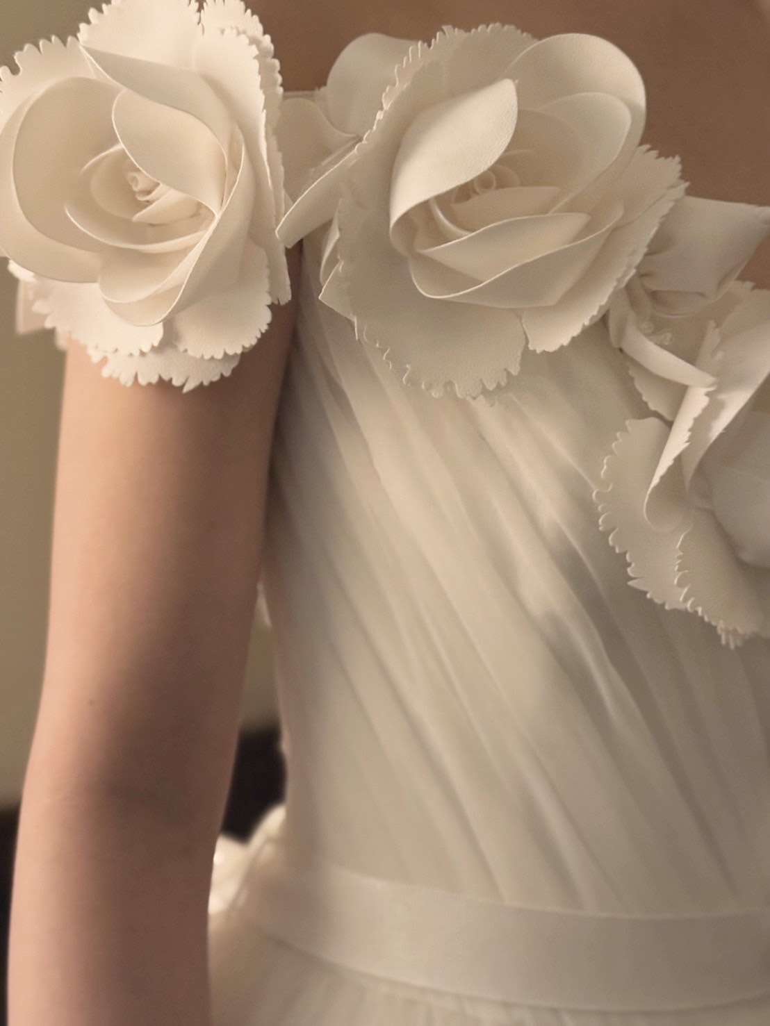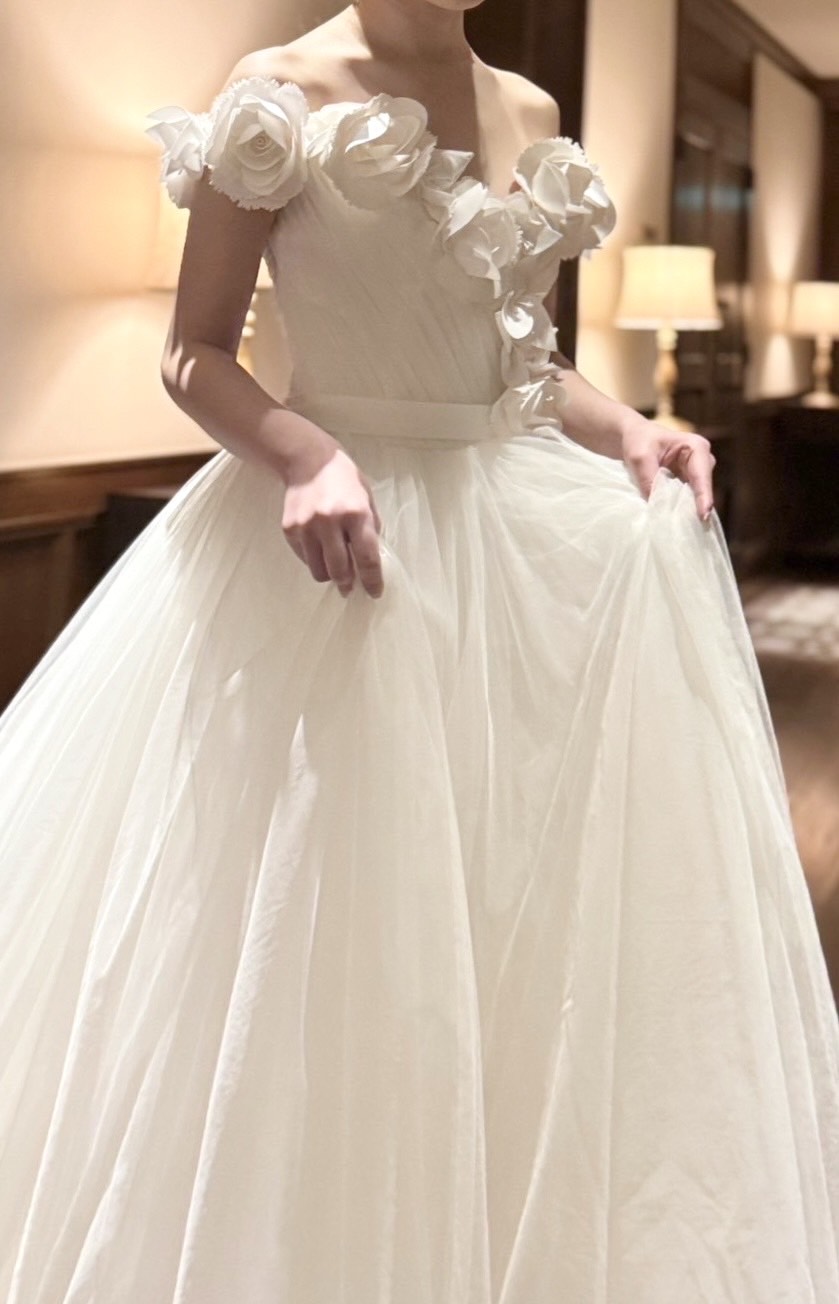 さらにクロスに交わるようにマットな素材であしらわれたバラが肩から優しく降り注ぎ、丁寧に寄せられたチュールを重ねることで女性らしくしなやかな印象を与えるのです。