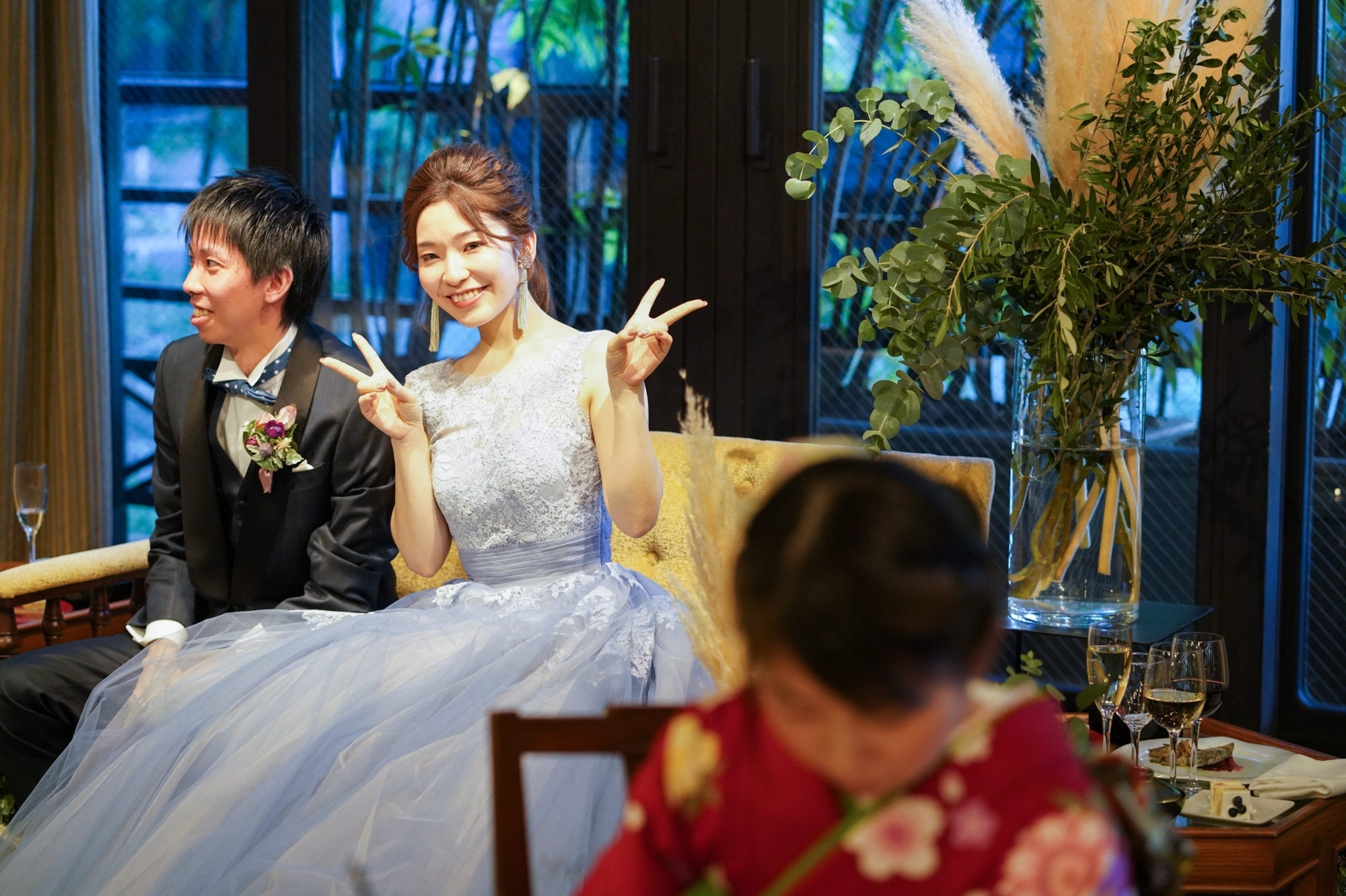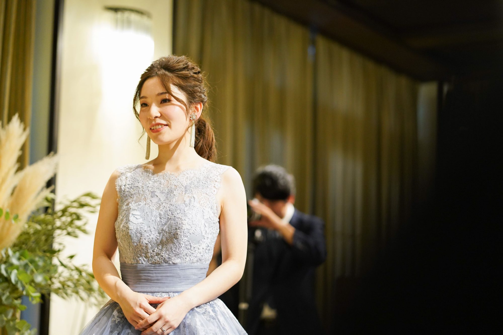 お色直しではブルーグレーのカラードレスをお召しになられました。