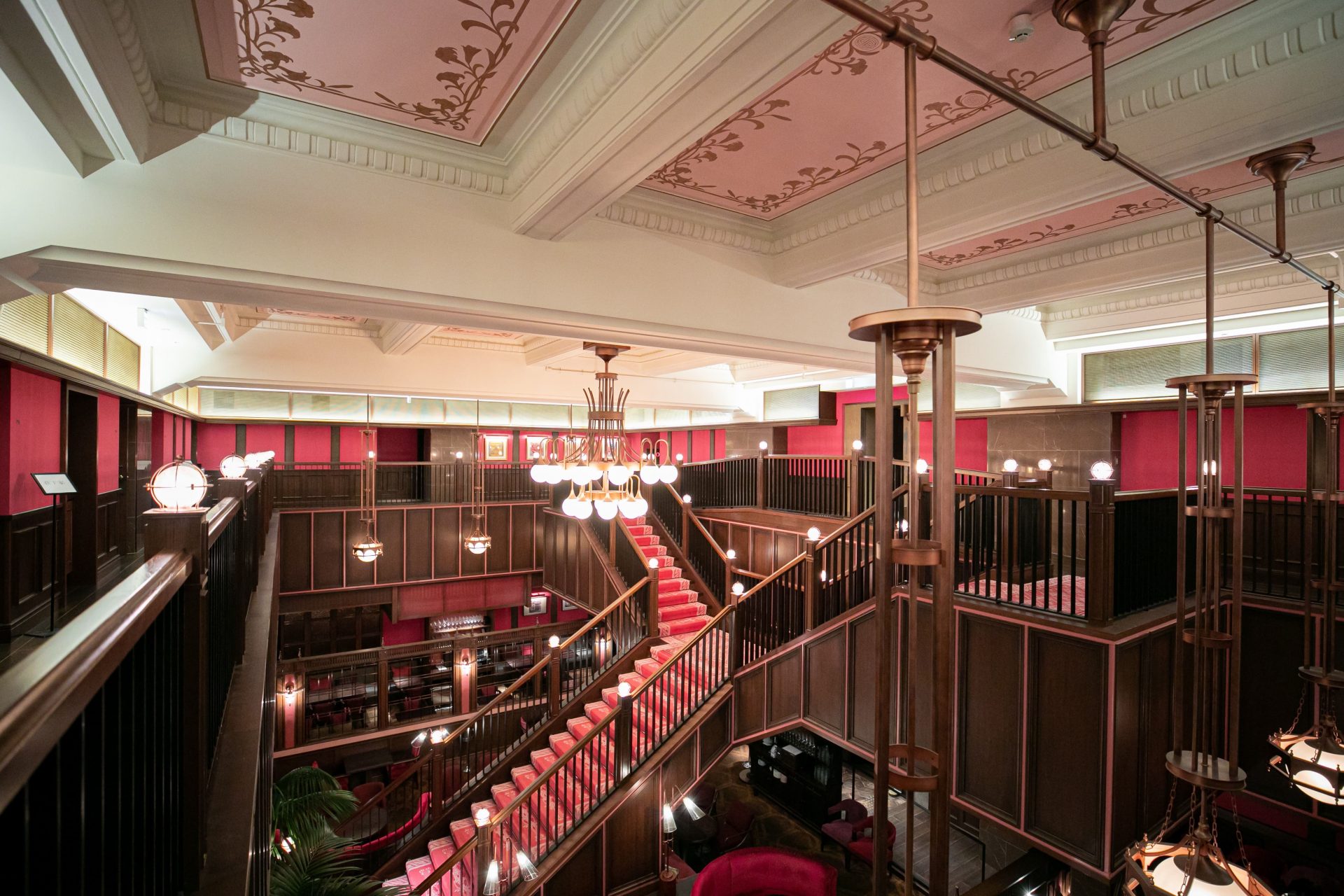 扉を開けるとそこに現れる別世界。目の前にはレッドカーペットで飾られた大階段。シックで重厚感溢れるインテリアと、ビビットな色彩とのハーモニー。雨模様の空が、より一層会場の雰囲気に深みを増してくれます。