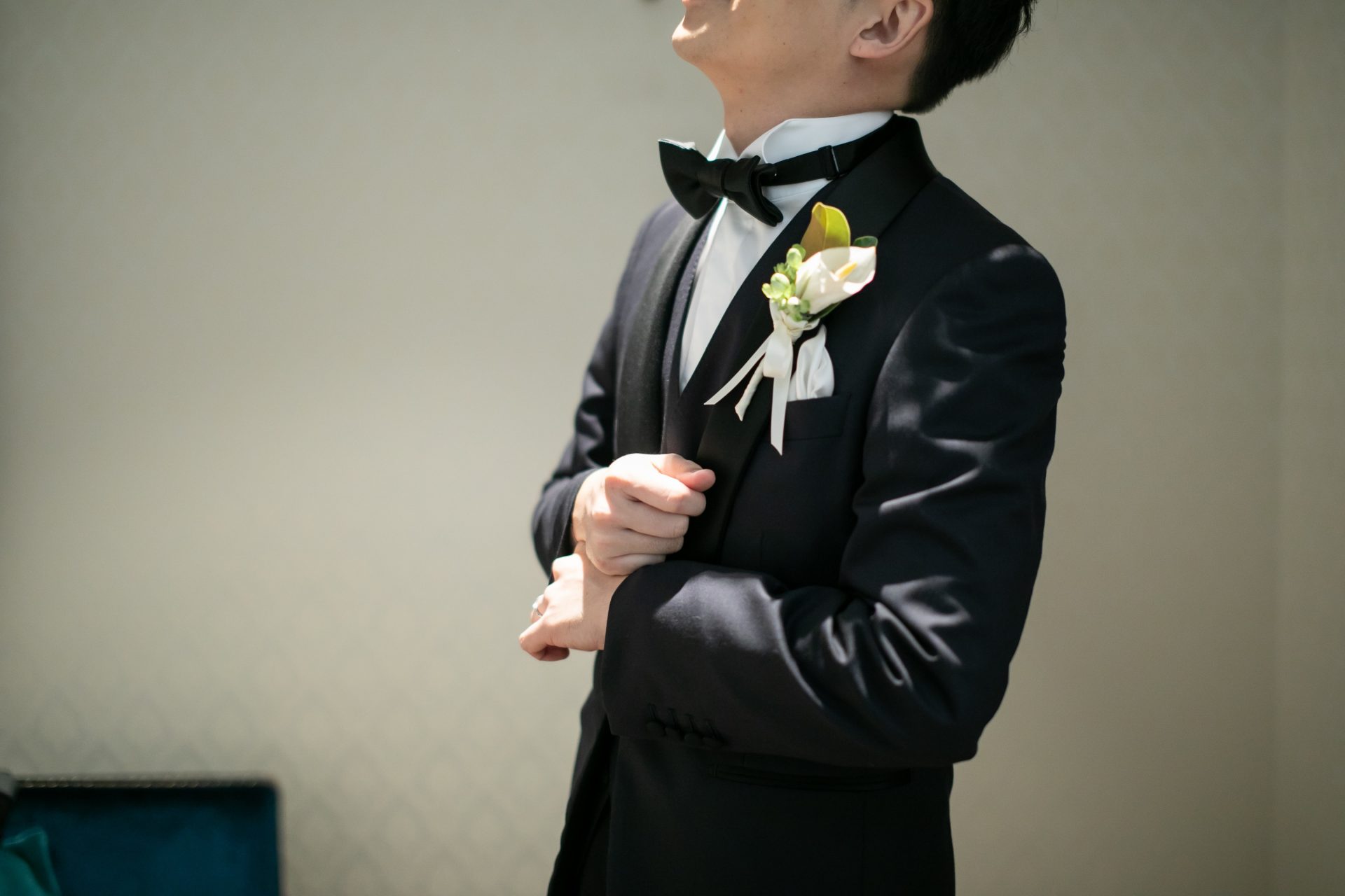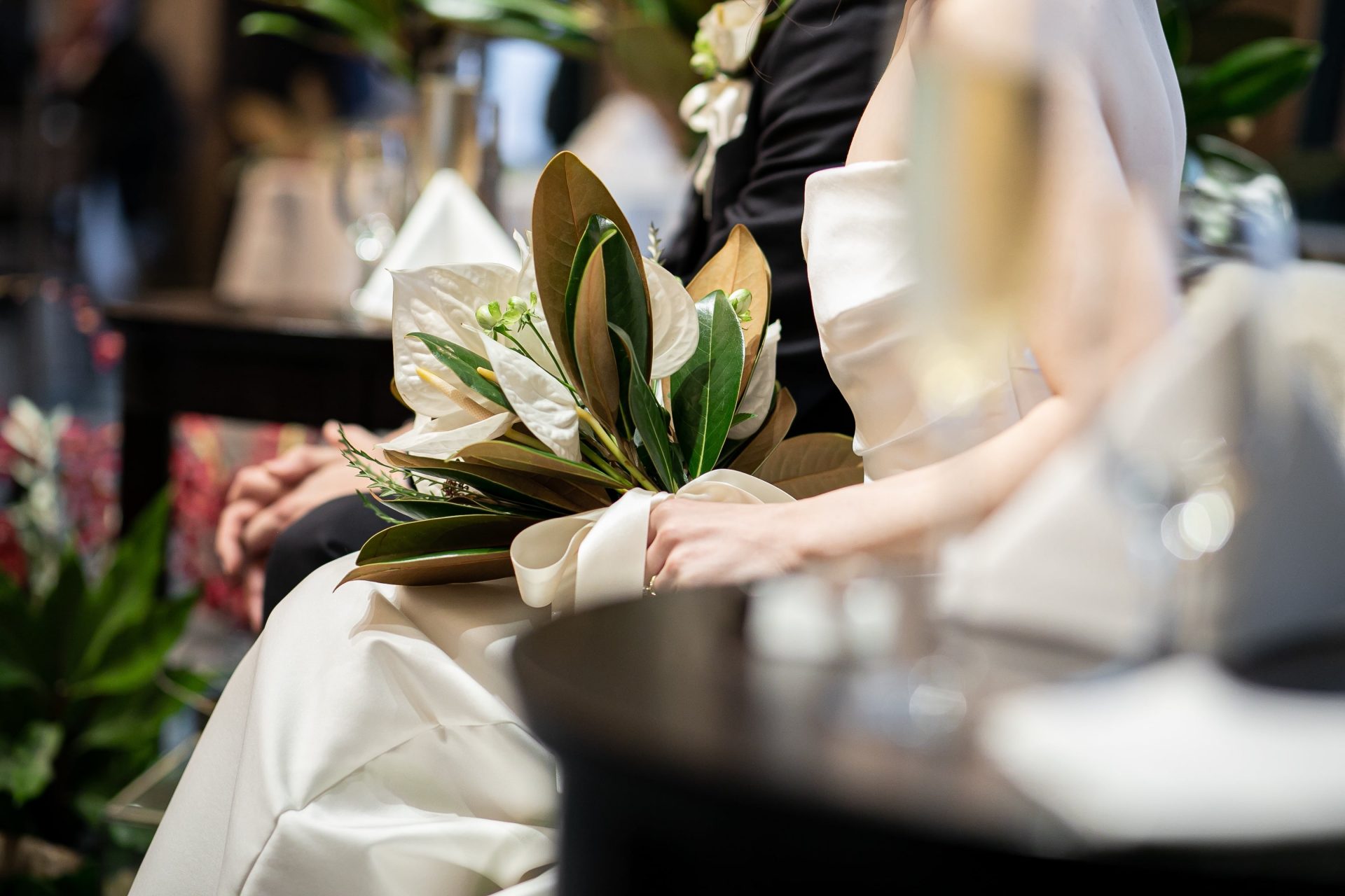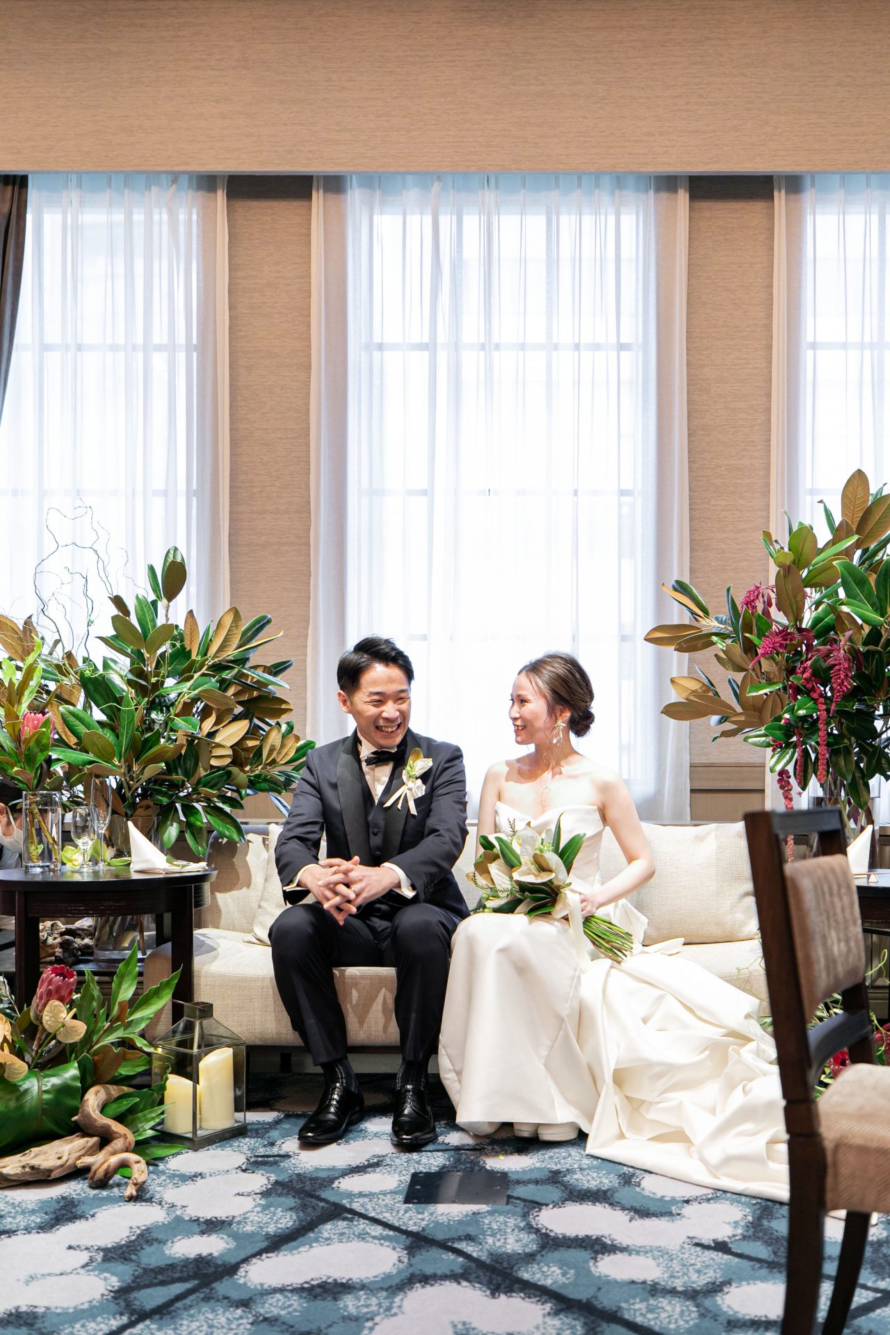 クラシックな雰囲気は残したままに、アットホームなお式にしたいとお話してくださったおふたり。初めてのお打ち合わせの際にご紹介させていただいたのがこちらのウェディングドレスでした。最高級のシルクサテンによる艶やかな光沢がクラシカルな印象を与えながらも、細身のシルエットによりゲストの皆様と距離の近いパーティーが叶う、新婦様の運命の1着は、初めからずっと変わることはありませんでした。ラグジュアリーなクチュールテクニックでファッションを楽しむ女性ごころをくすぐるようなドレスを生み出し続けるMonique Lhuillier(モニーク・ルイリエ)。こちらのウェディングドレスは、日本の「折り紙」に着想されたデザインだそう。華やかなレッドカーペットや調度品に囲まれて佇む花嫁を、潔くシンプルに、それでいてバックスタイルに贅沢にあしらわれた動きのあるモチーフによってゴージャスにも魅せてくれる。これがMonique Lhuillier(モニーク・ルイリエ)のドレスの魔法なのです。